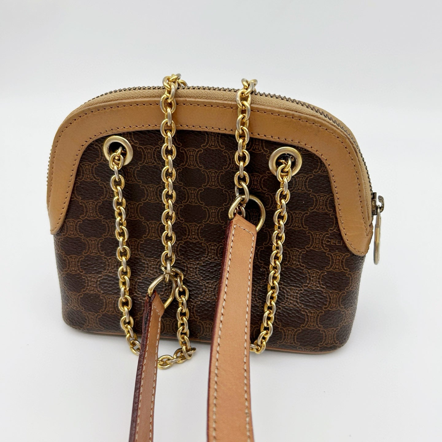 This Celine mini shell bag features the brand’s iconic Macadam pattern crafted in authentic brown leather, showcasing a timeless vintage aesthetic with refined craftsmanship. The curved shell-shaped silhouette adds a soft and elegant touch, while the chain strap enhances its classic appeal.