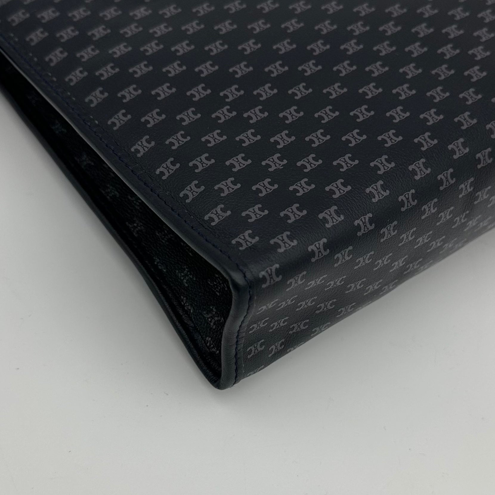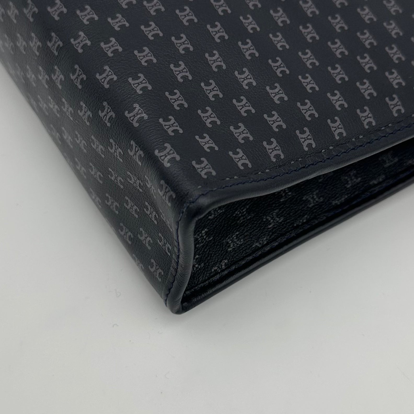 This Celine clutch features an all-over Triomphe monogram in a refined blue and black colorway. The slim, structured silhouette makes it easy to carry by hand while still offering practical storage for daily essentials.