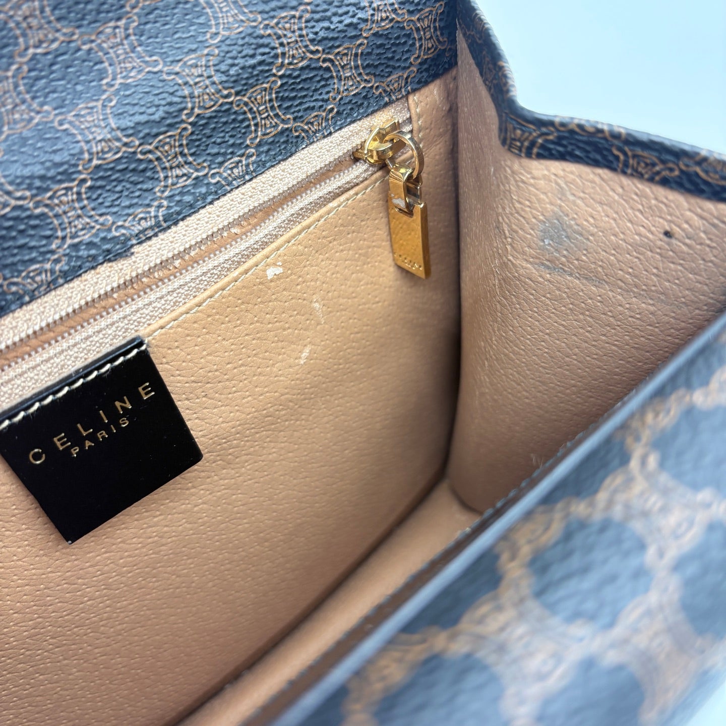 Gold-tone hardware shows light surface scratches.