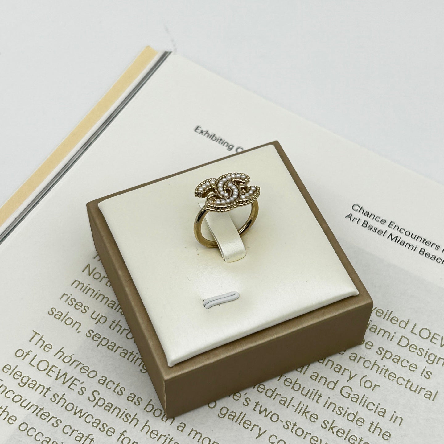 Chanel 12A Light Gold-Tone Coco Mark Pearl-Embellished Ring [Used]