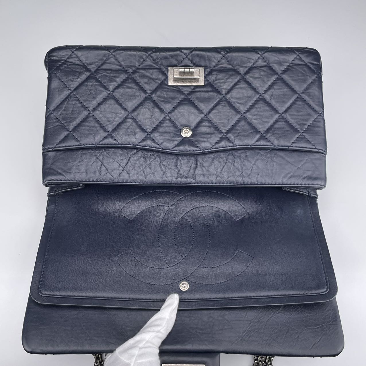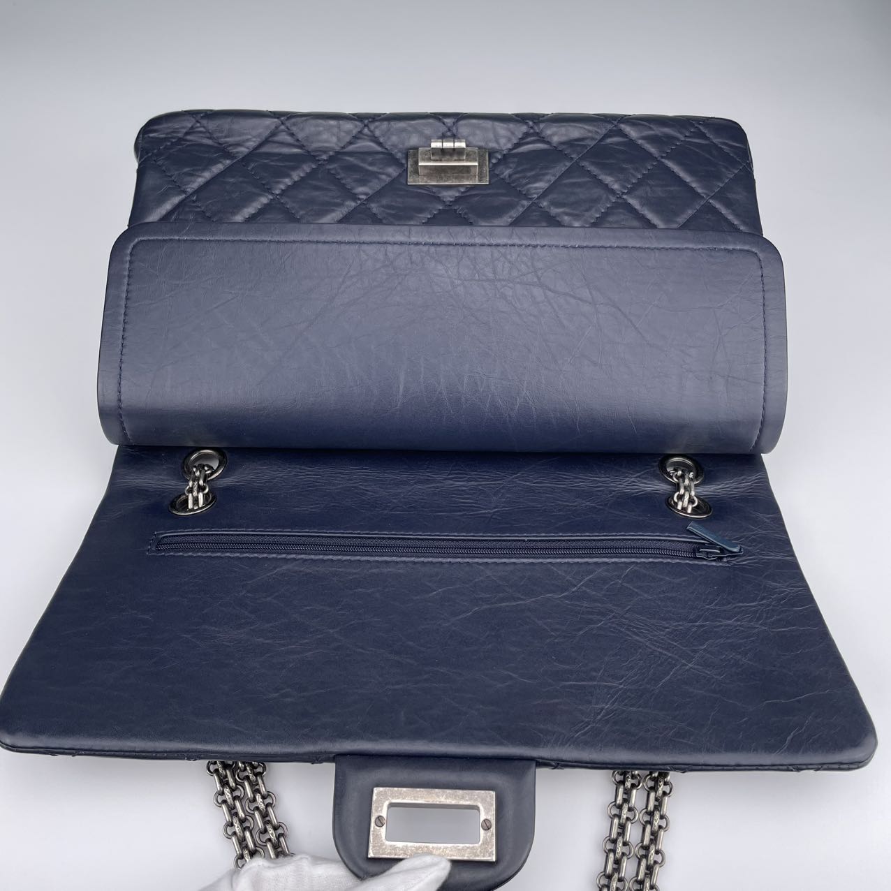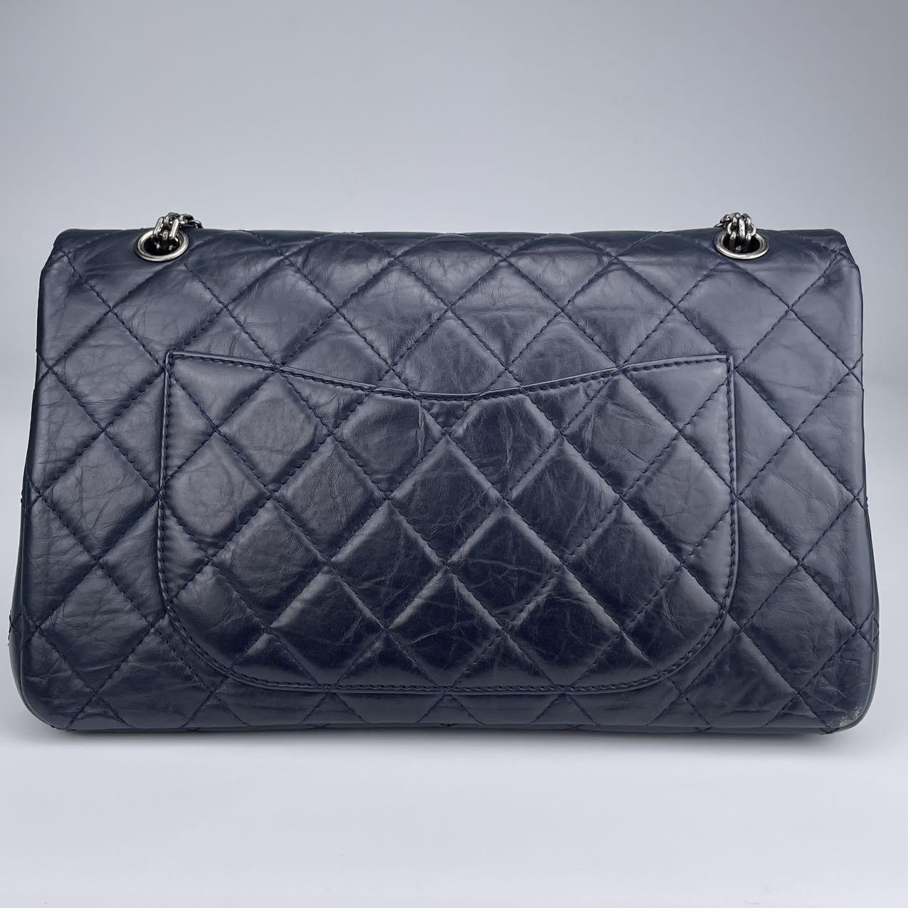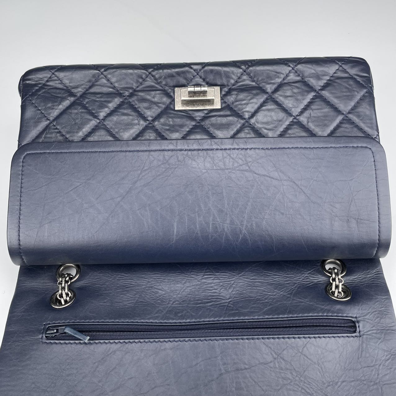 Material: Smooth calfskin leather in a rich, deep blue tone. The leather has a soft, matte finish that enhances the vintage aesthetic of the 2.55 Reissue design while offering a modern, refined edge.
