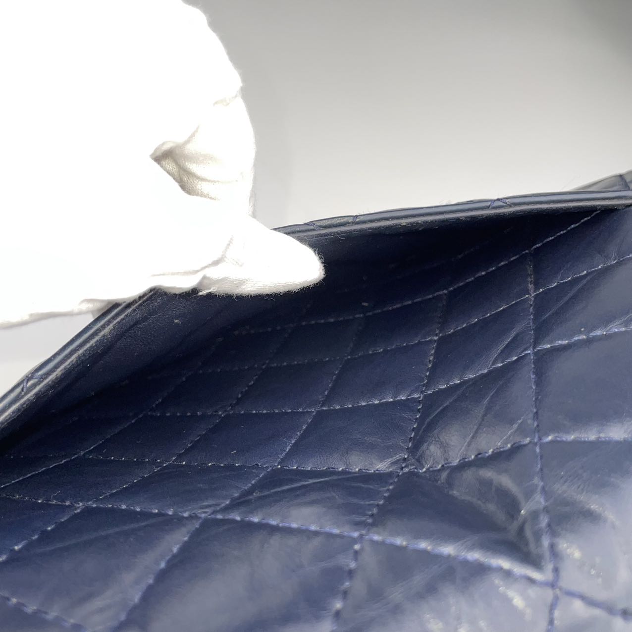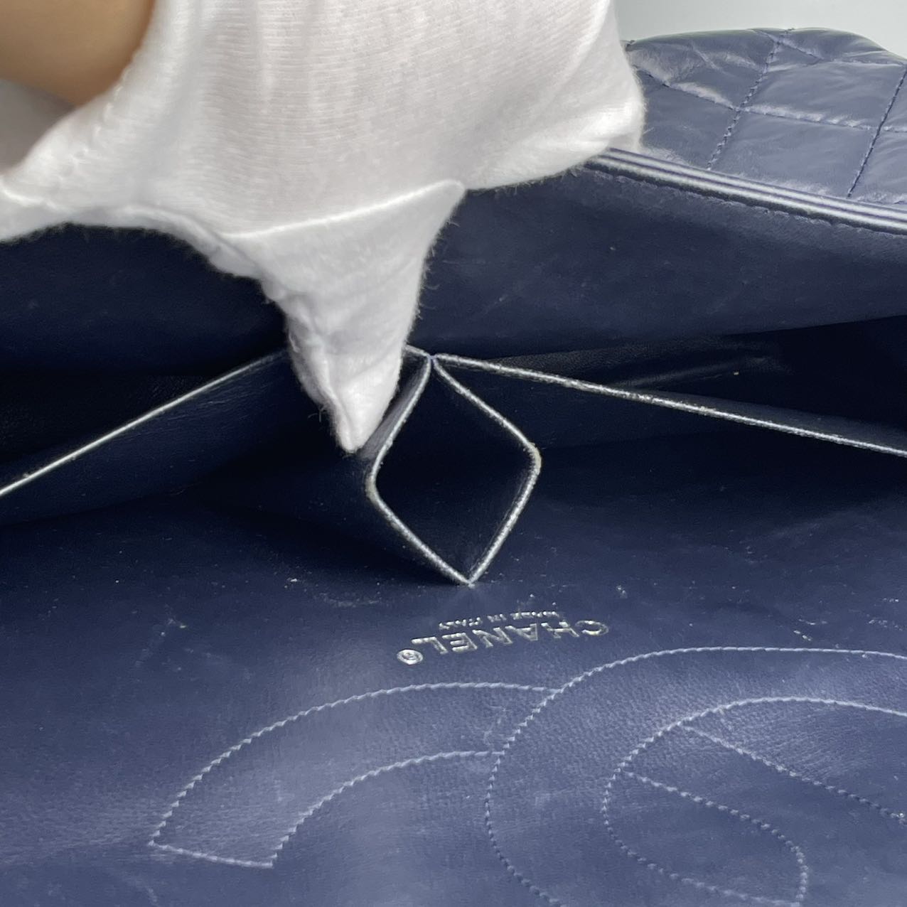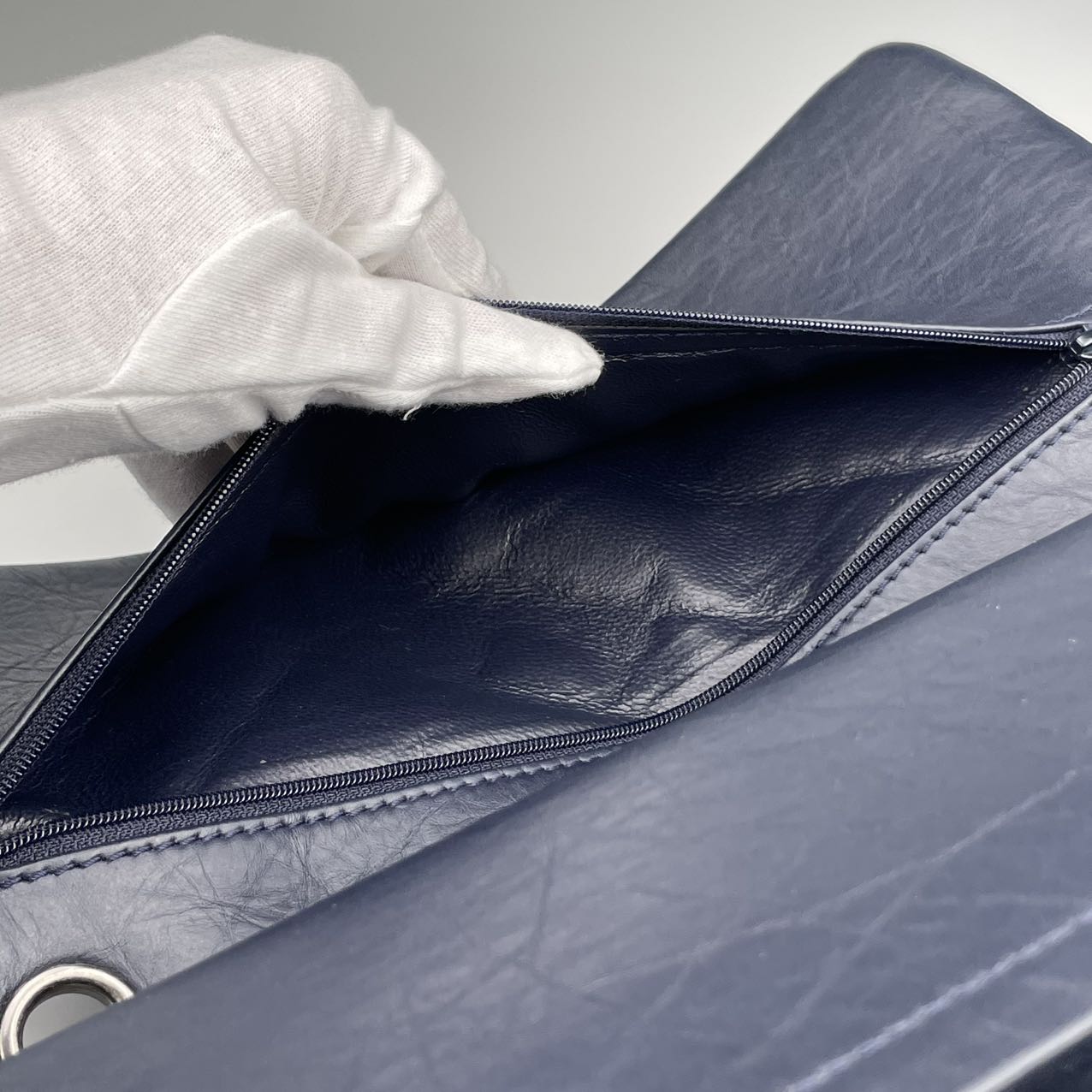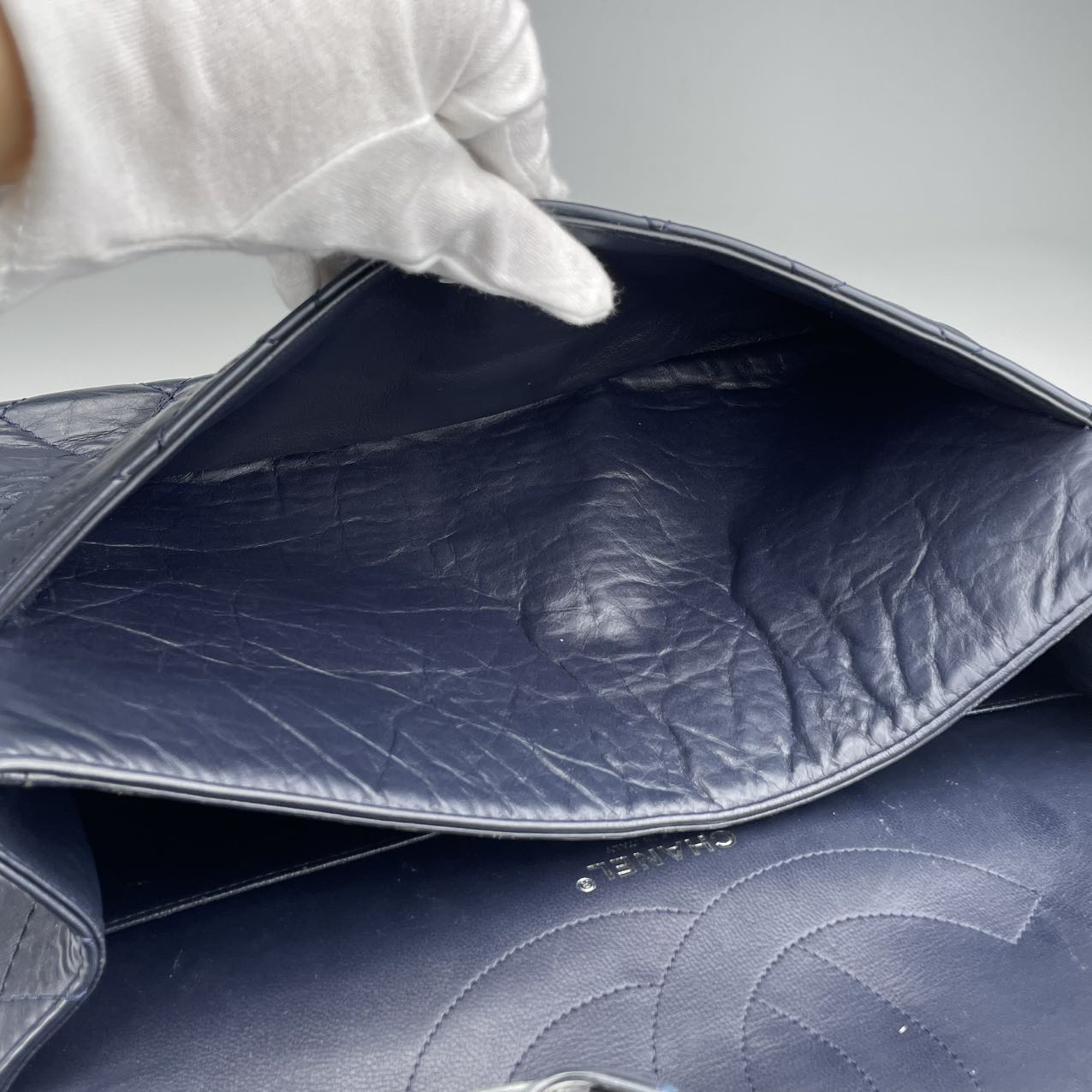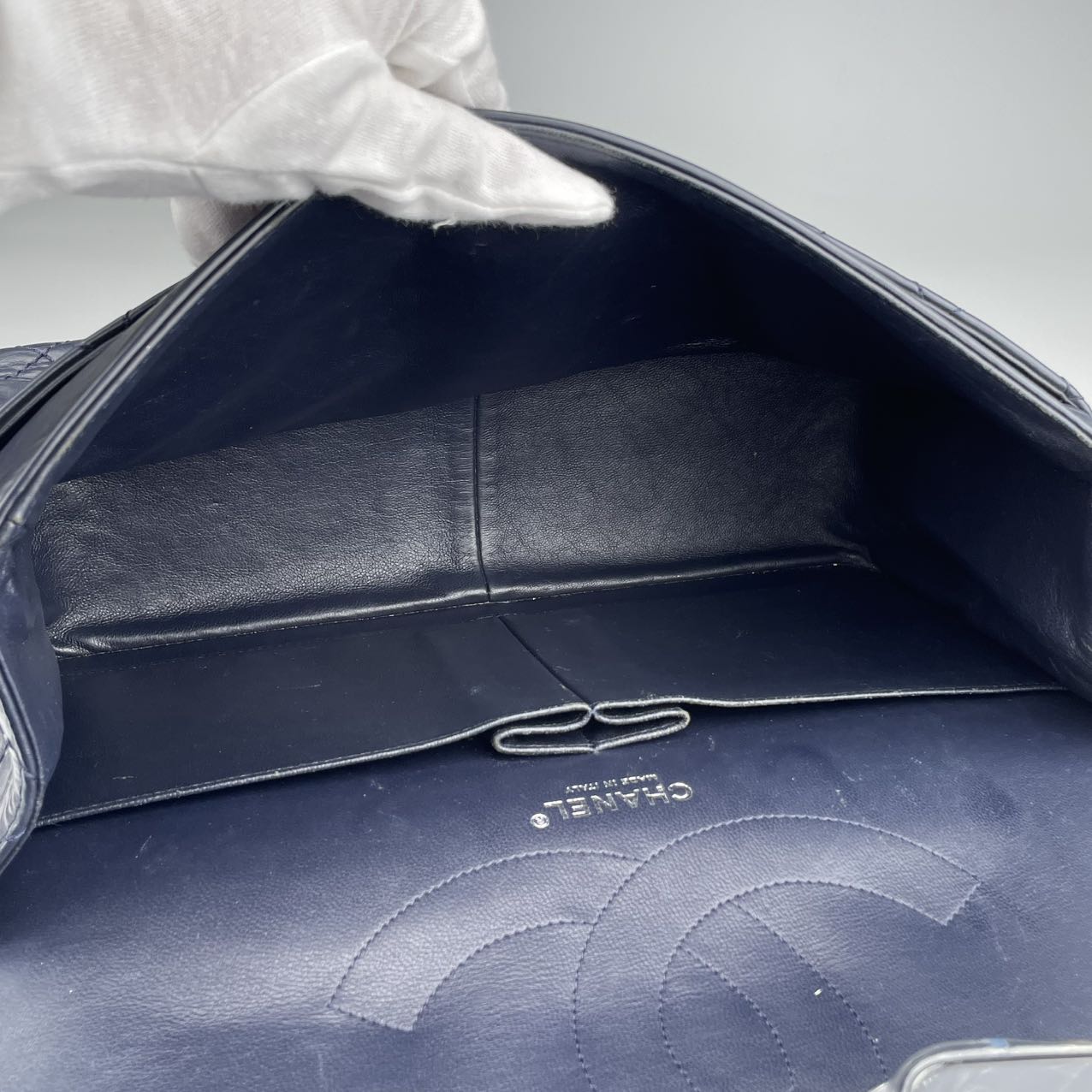 Material: Smooth calfskin leather in a rich, deep blue tone. The leather has a soft, matte finish that enhances the vintage aesthetic of the 2.55 Reissue design while offering a modern, refined edge.
