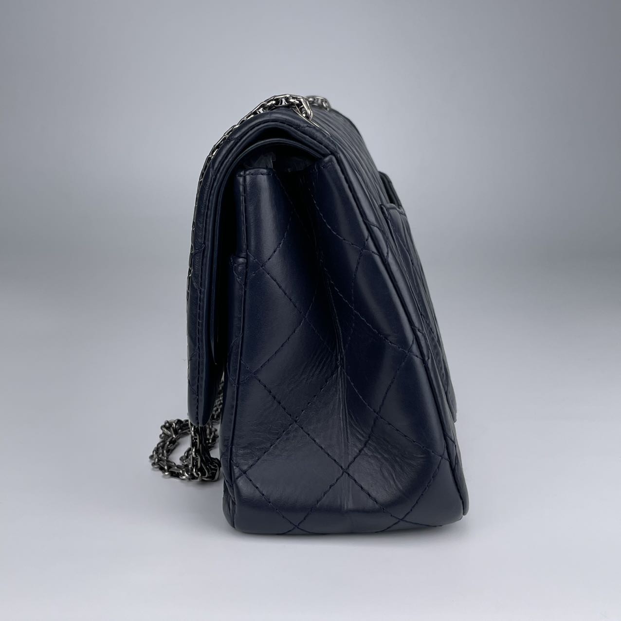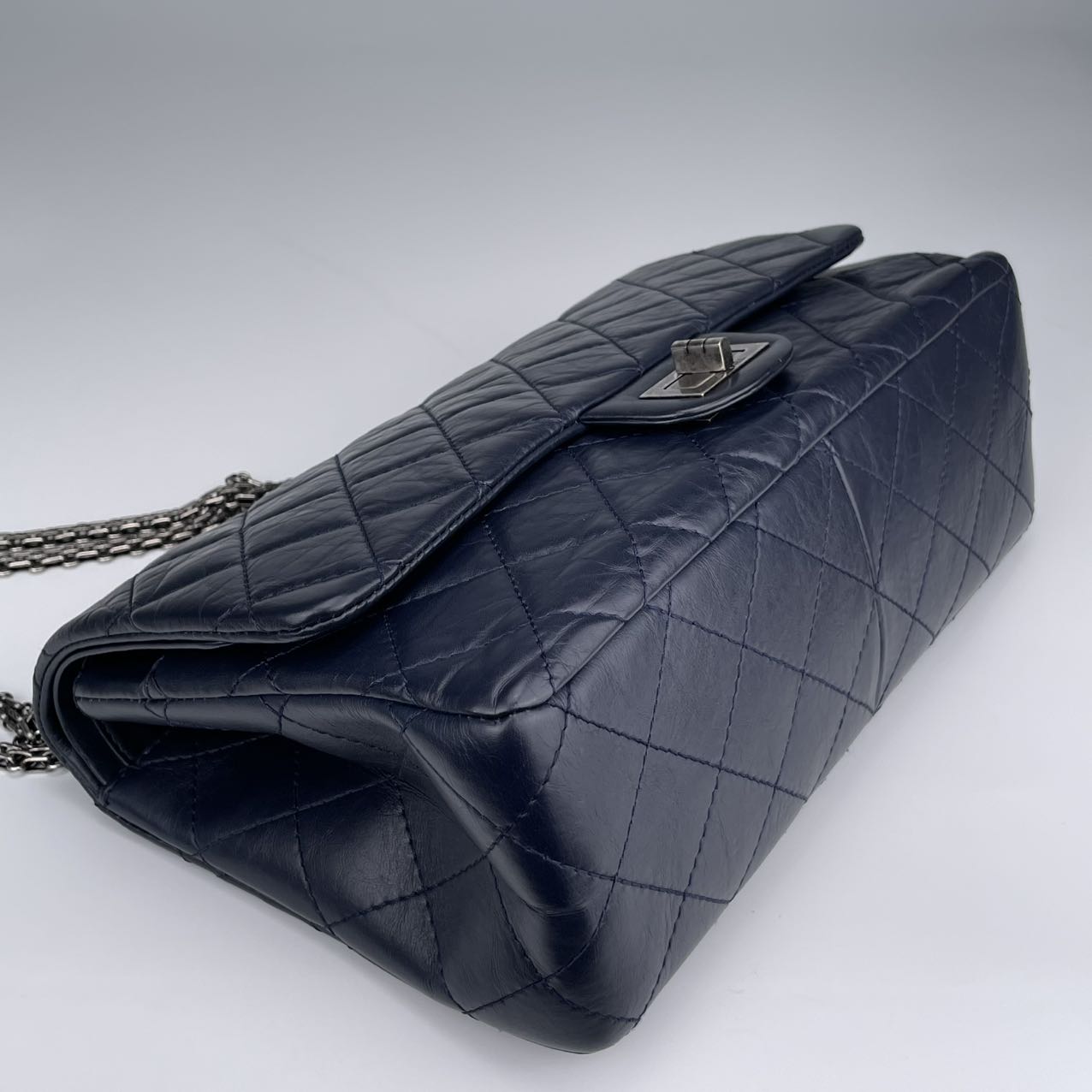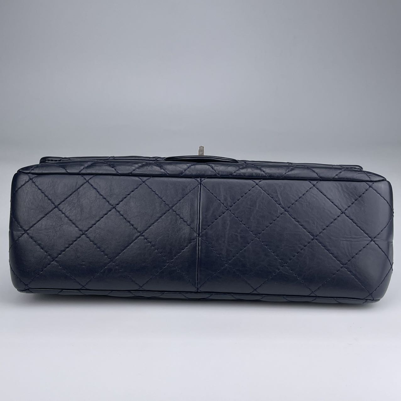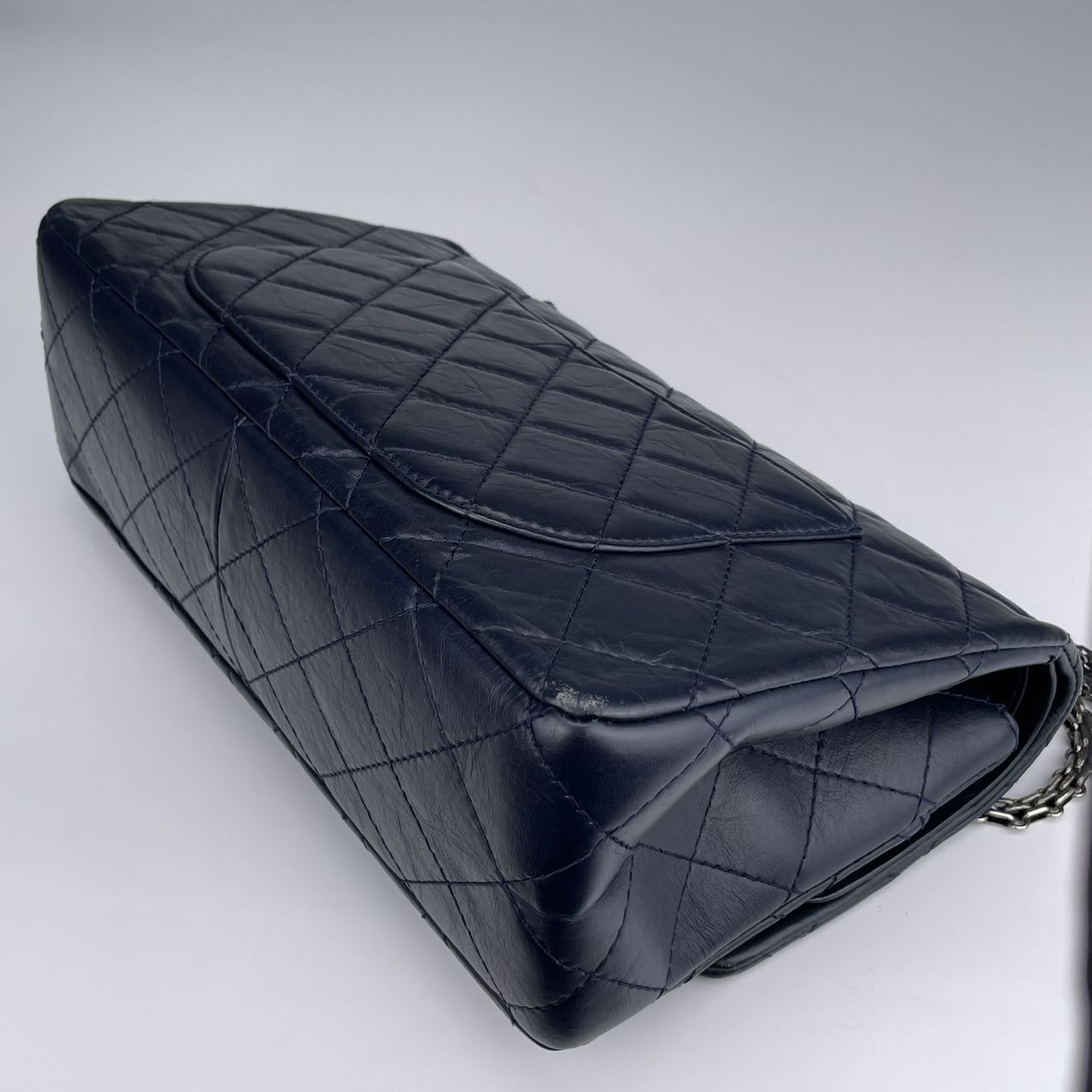 Classic Chanel 2.55 Reissue flap bag, known for its timeless, minimalist flap design and signature rectangular lock.