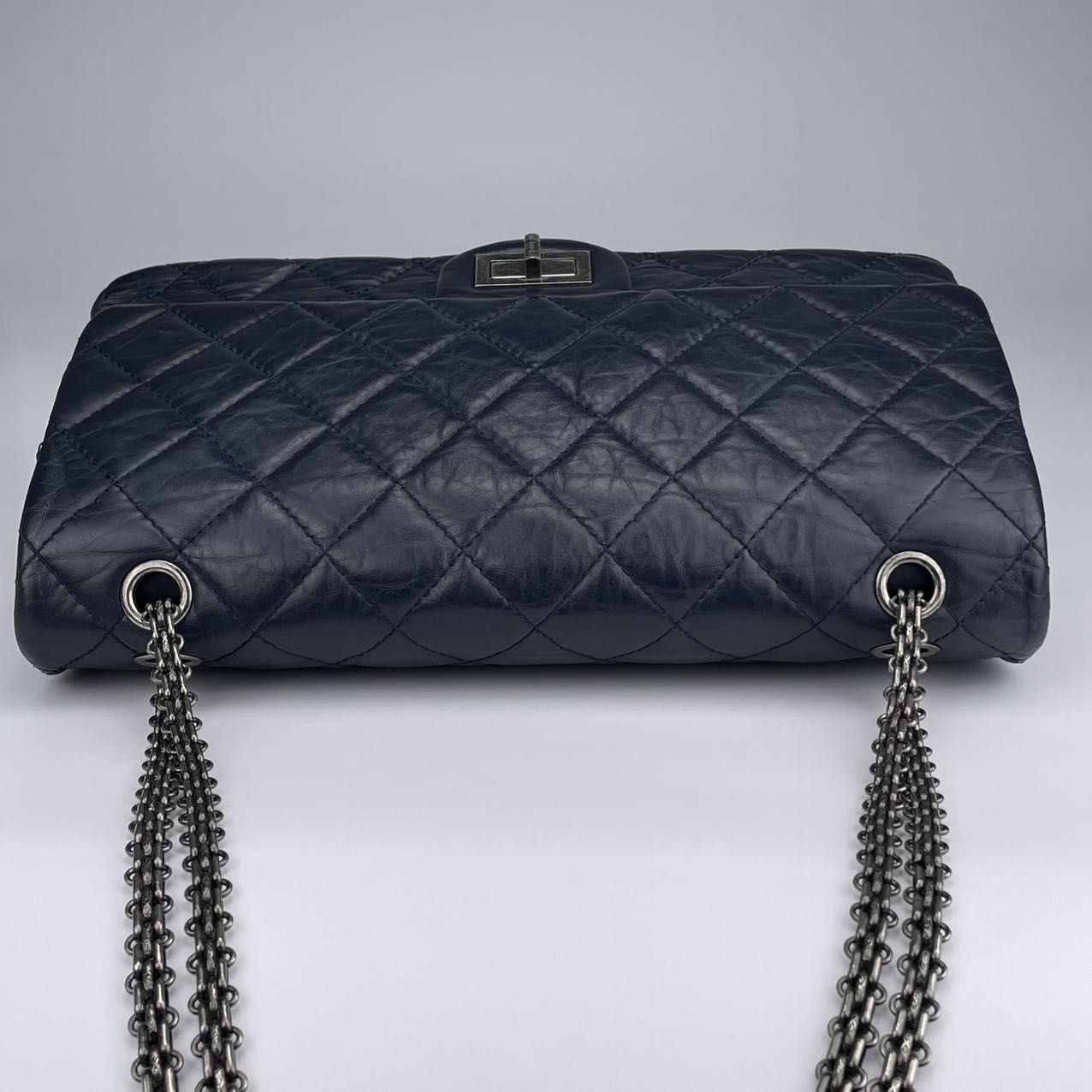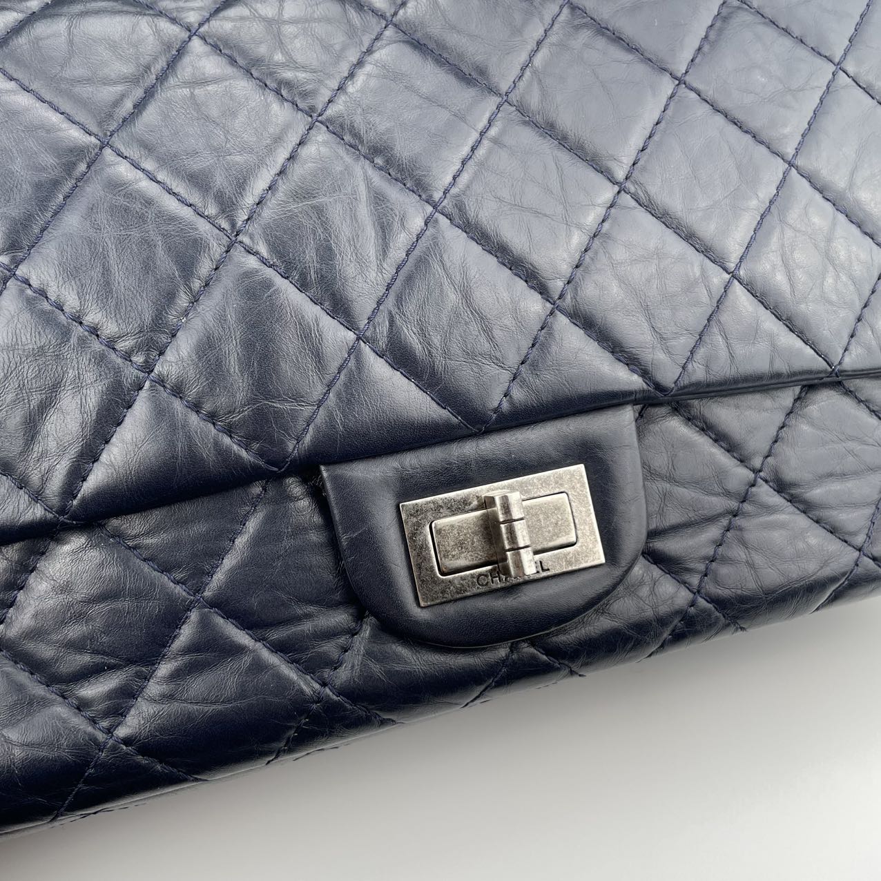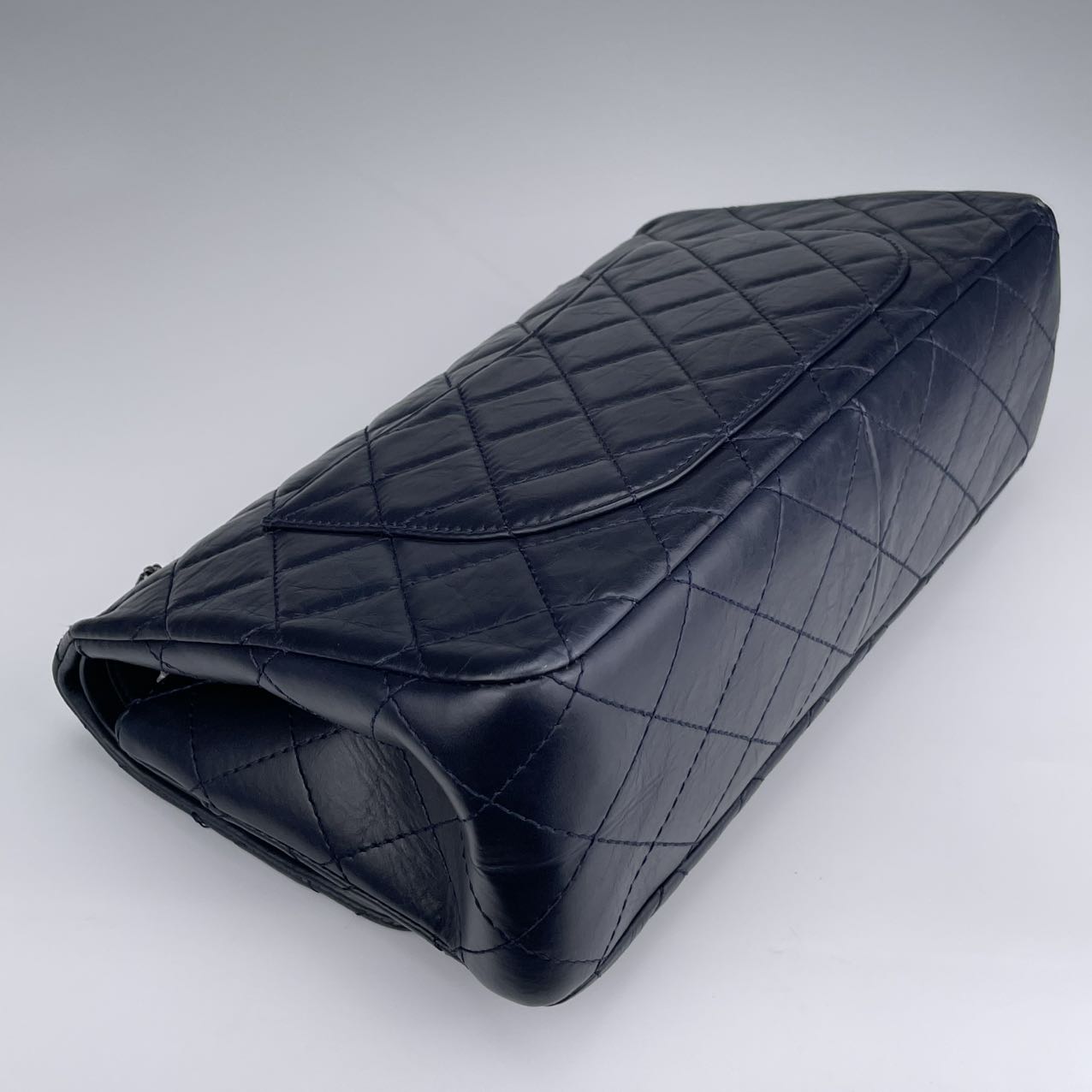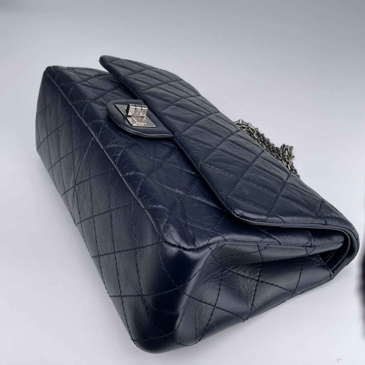 Classic Chanel 2.55 Reissue flap bag, known for its timeless, minimalist flap design and signature rectangular lock.