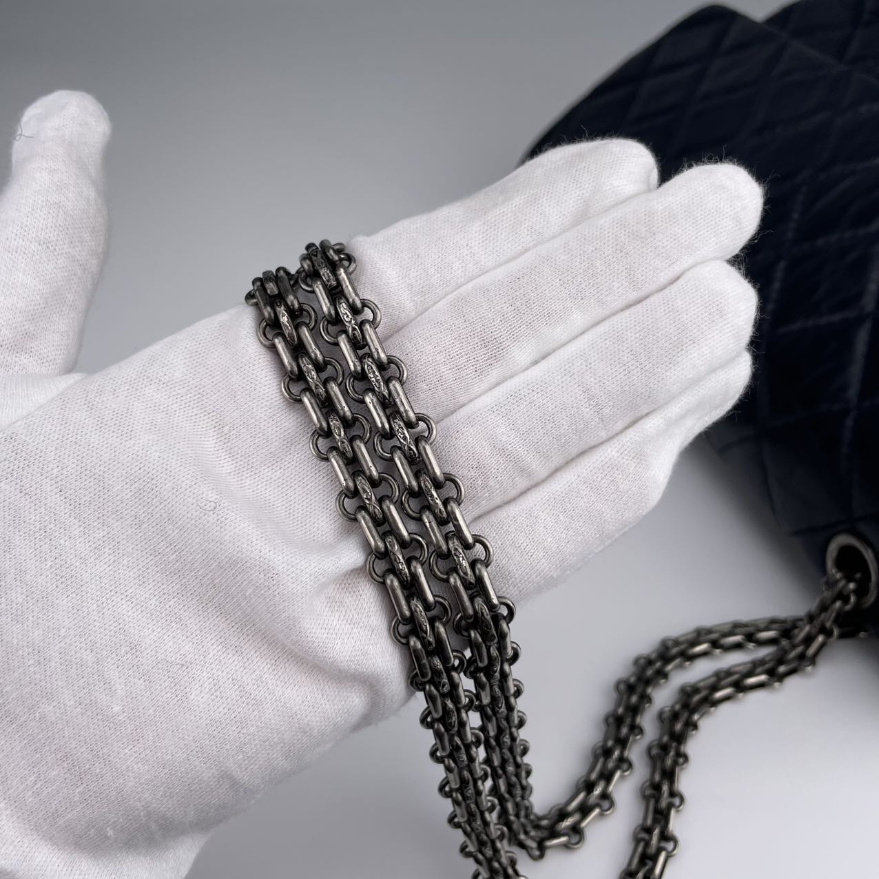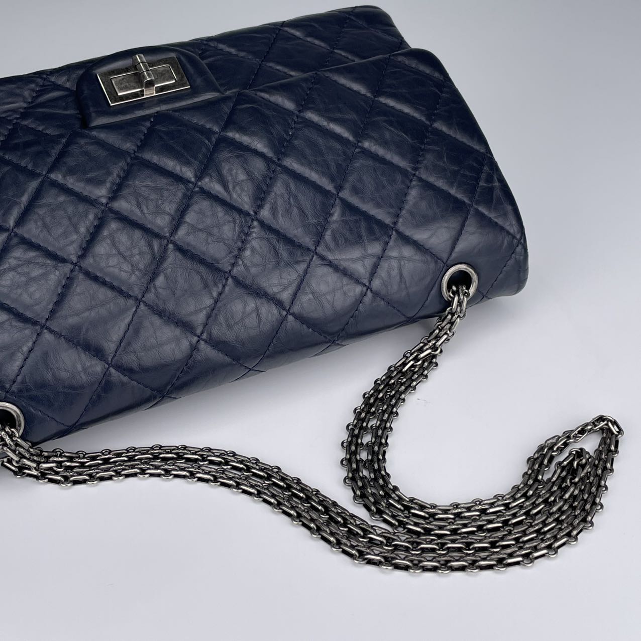 Hardware: Aged silver-tone “Mademoiselle” turn-lock closure and all-metal reissue chain strap — iconic features of the original 2.55 design, offering a vintage-inspired, edgy look.
