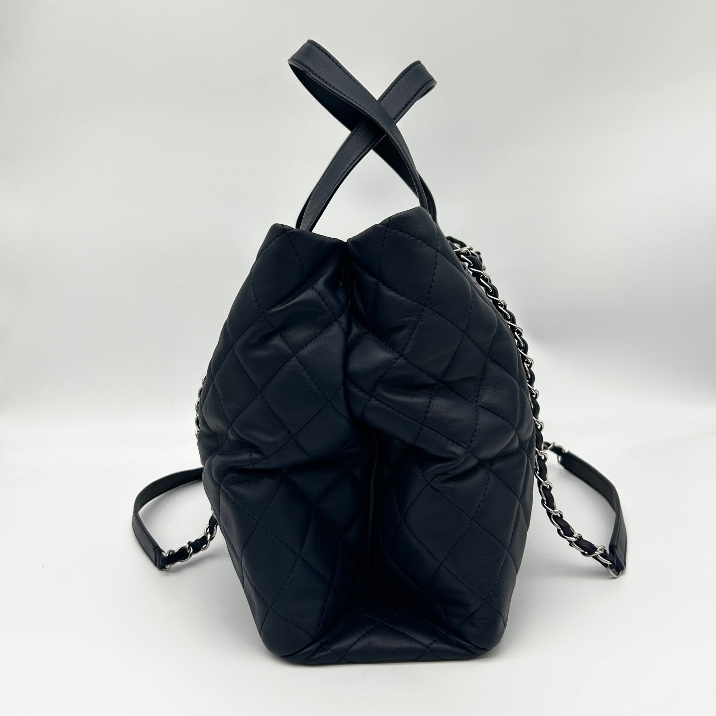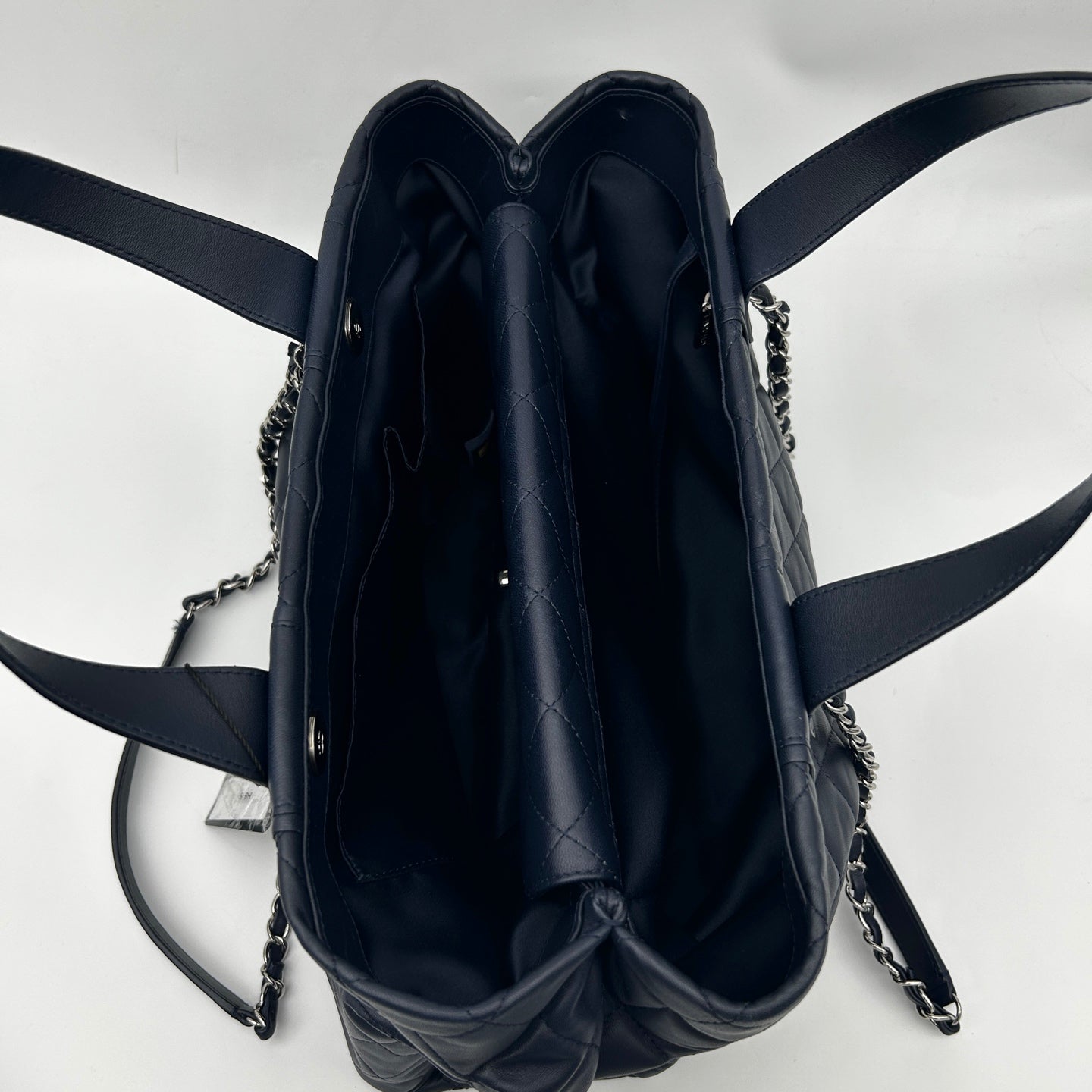 Crafted from navy blue quilted leather with silver-tone hardware, it features a soft yet structured silhouette that’s ideal for travel or everyday use. The chain shoulder straps add a touch of signature CHANEL sophistication, while the spacious interior offers practicality without sacrificing style.