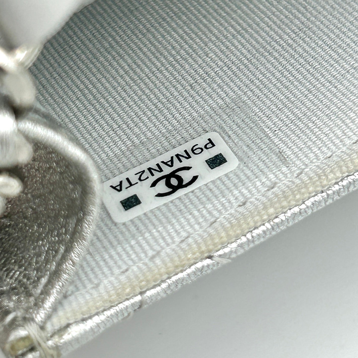 This Chanel 24C Metallic Silver Quilted Star CC Bag features a playful yet edgy design with a five-point star silhouette, finished in shimmering metallic silver leather. The quilted texture and iconic Double C motif highlight Chanel’s contemporary seasonal aesthetic while maintaining its signature elegance.