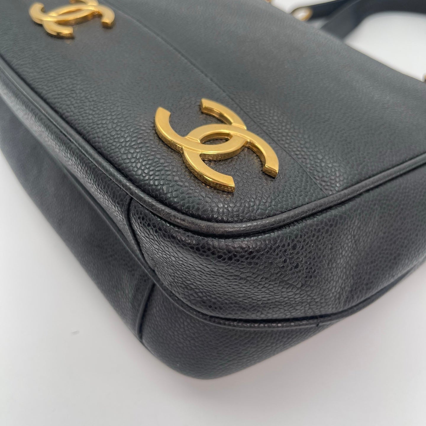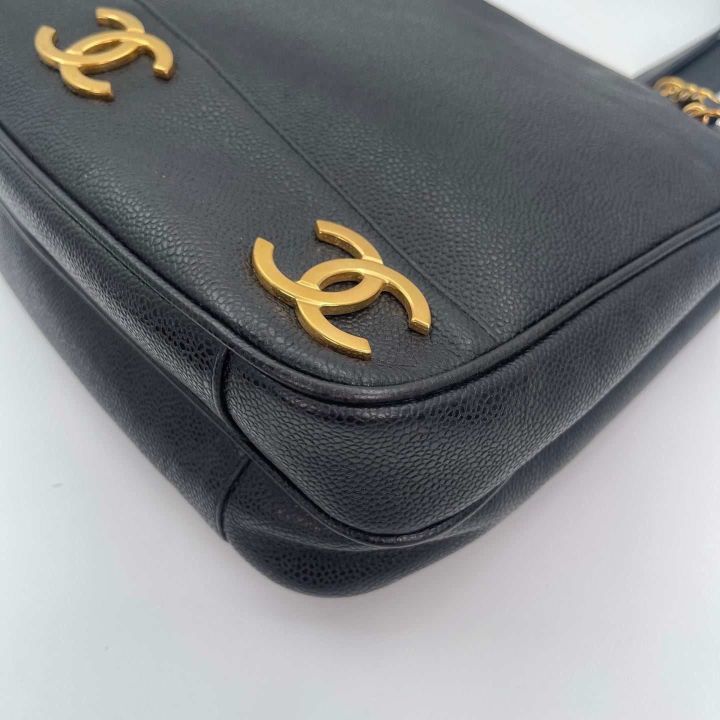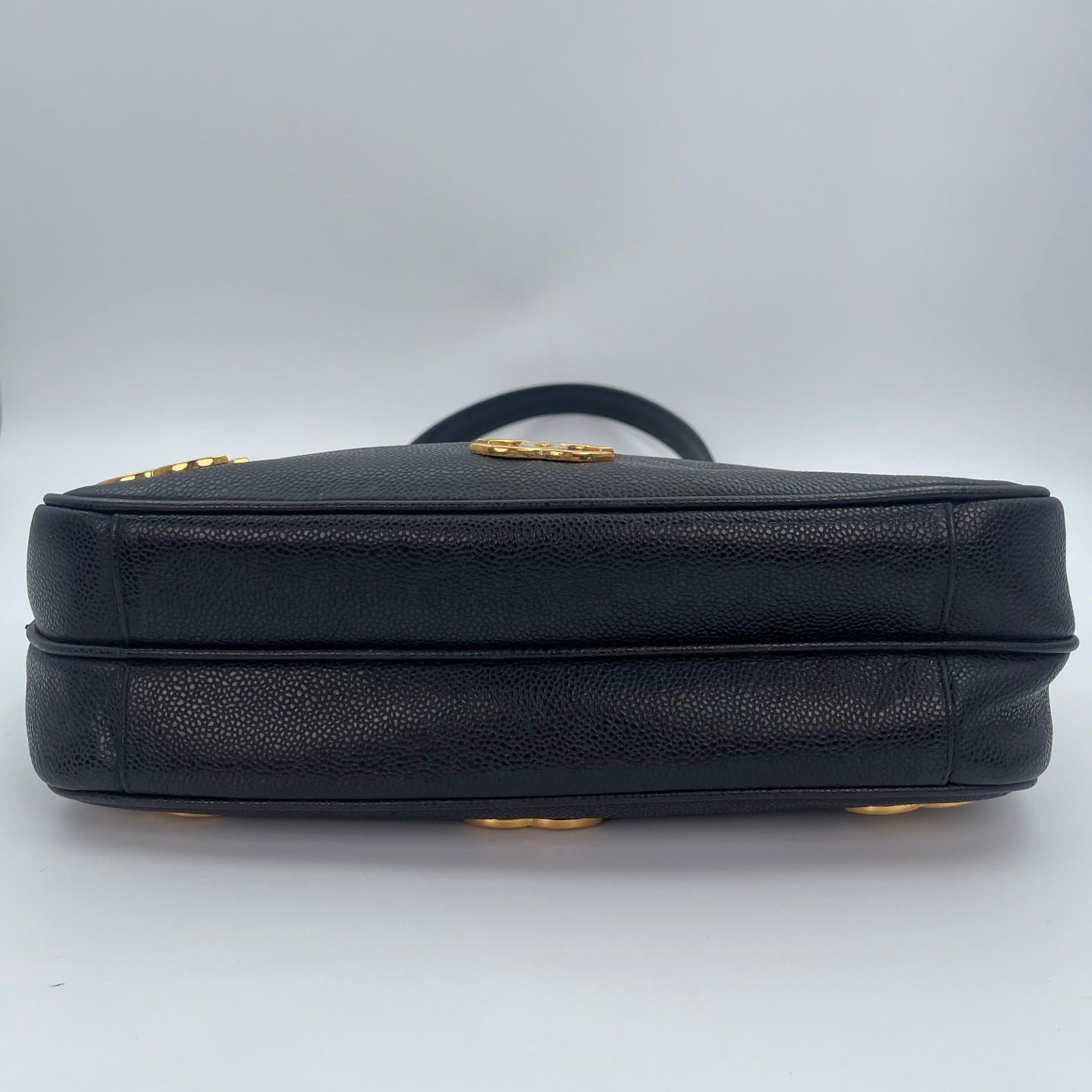 This CHANEL Black Caviar Leather Double-Sided Tote Bag features an exceptionally rare and distinctive design highlighted by three oversized gold CC marks aligned along the bottom and a signature gold ball charm. Crafted from durable and luxurious caviar leather, the bag showcases identical front and back designs, allowing it to be worn comfortably on either shoulder without compromising its aesthetic. The zipper pull is finished with a refined leather tab embossed with the golden CHANEL name, paired with vintage-style 24K gold-plated hardware that adds a rich, collectible character. With its perfectly balanced size and thoughtful double-sided construction, this tote is both highly functional and visually striking, making it a timeless and hard-to-find Chanel piece.