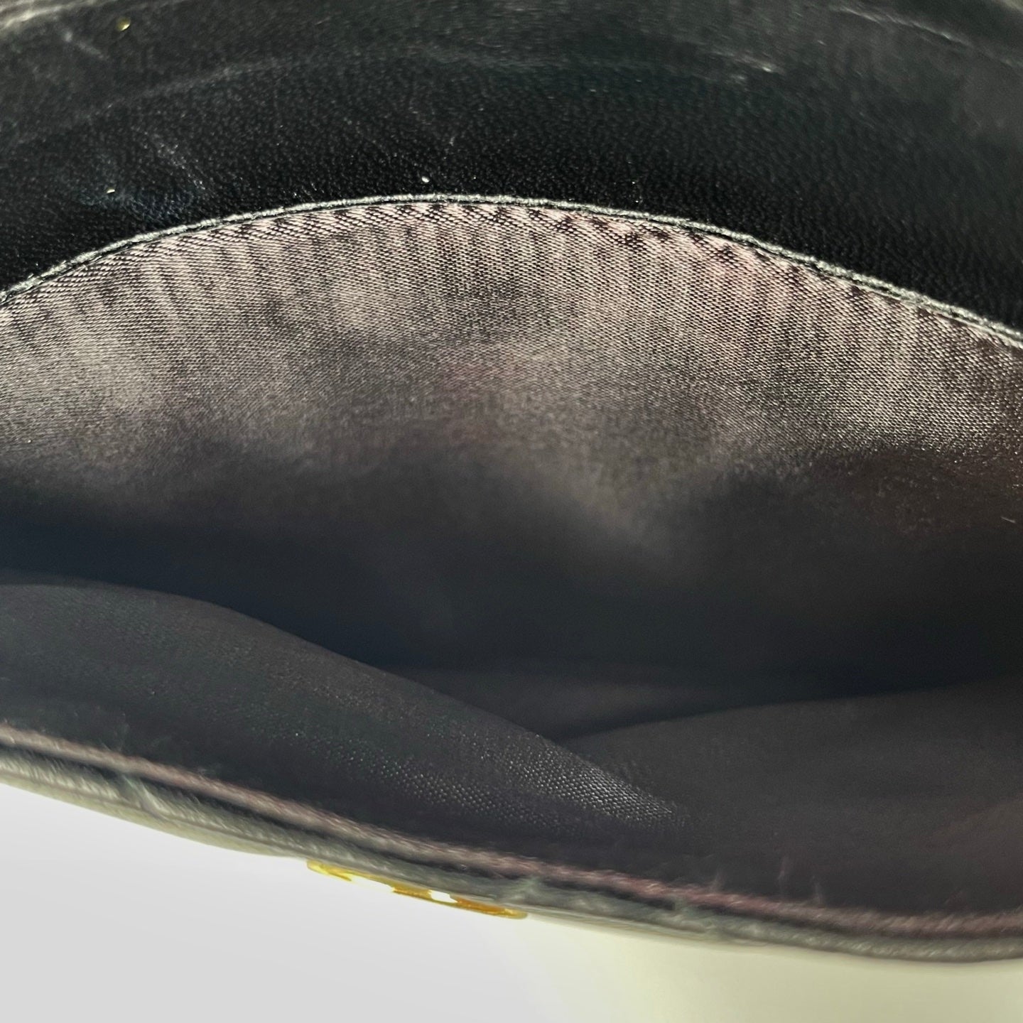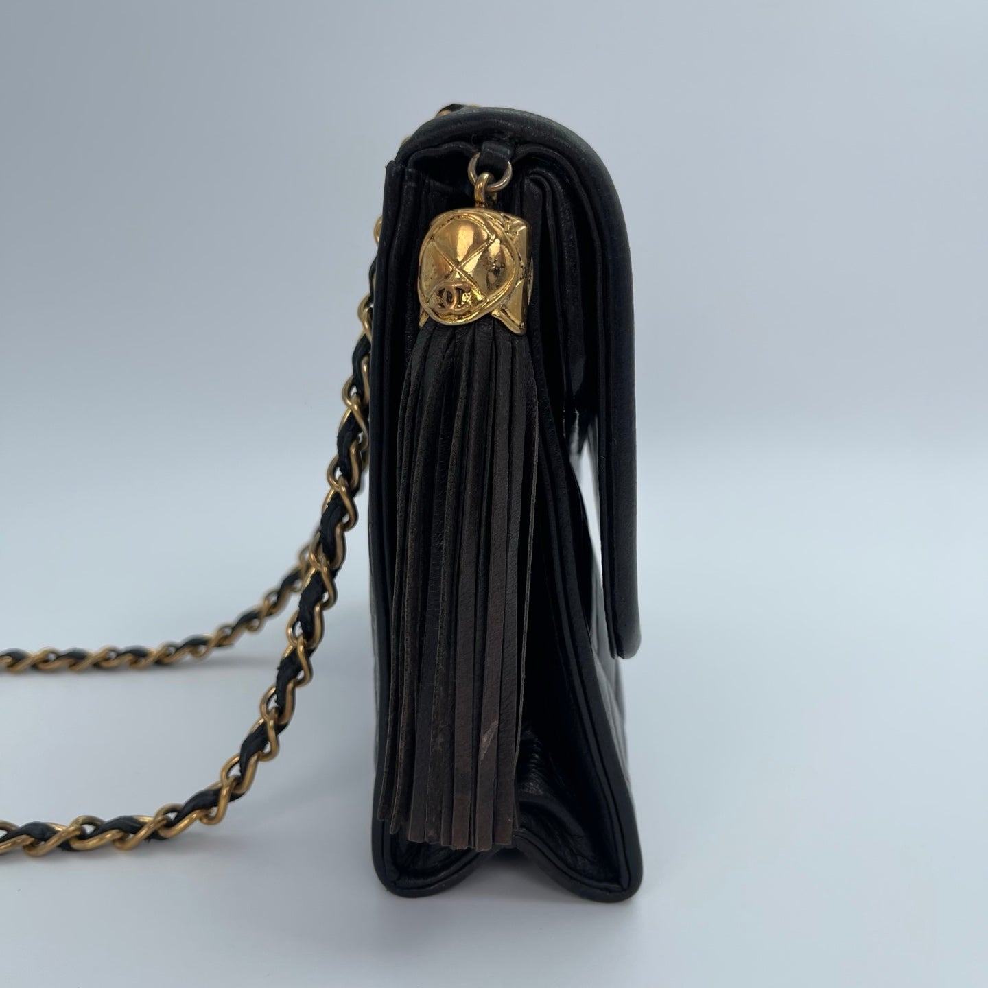 The gold-plated hardware perfectly complementing the deep black tone of the bag. The playful leather tassel, paired with the interlocking CC logos, showcases CHANEL’s vintage charm. The interior is clean with only minimal signs of use.