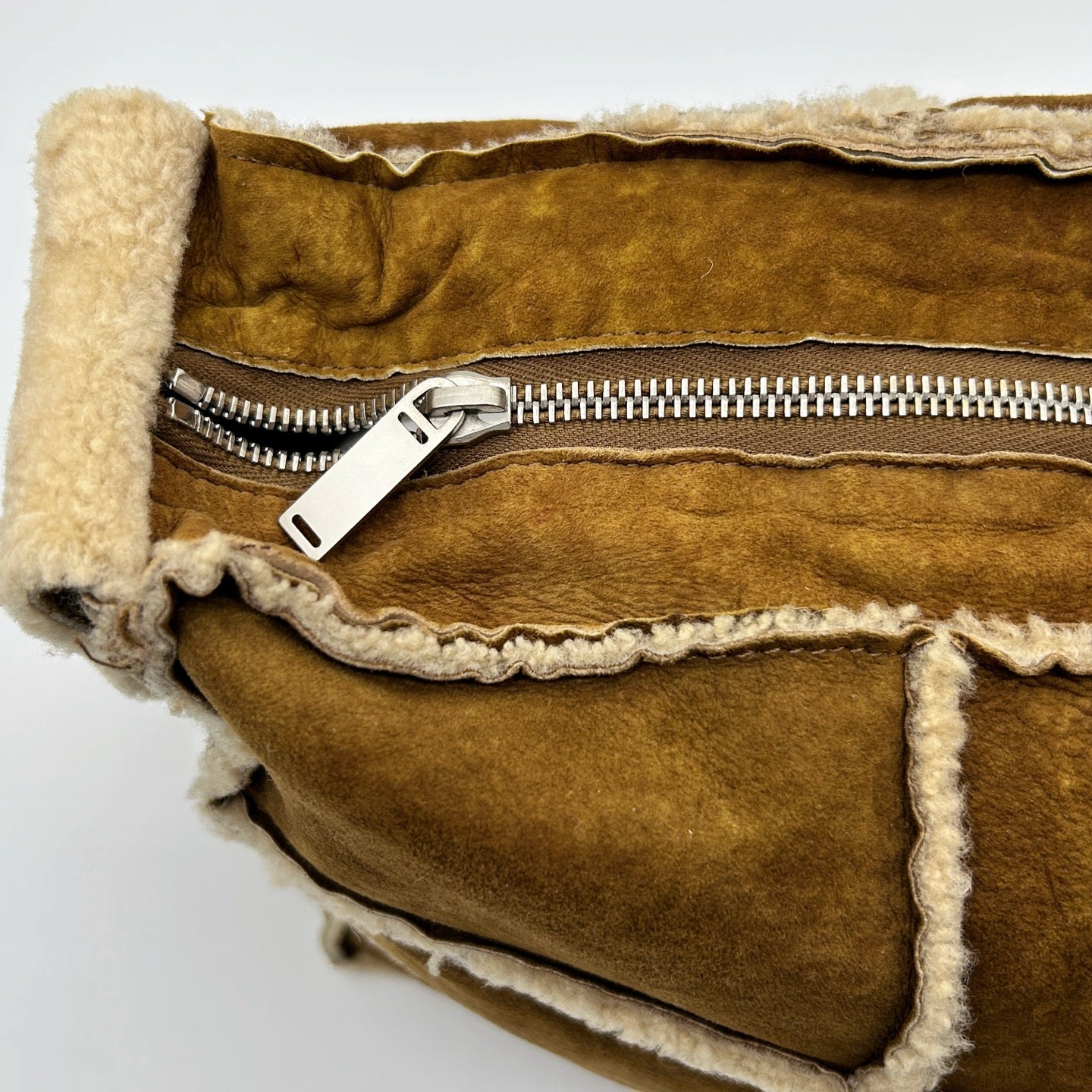 Shearling shows normal signs of wear and light flattening in some areas.