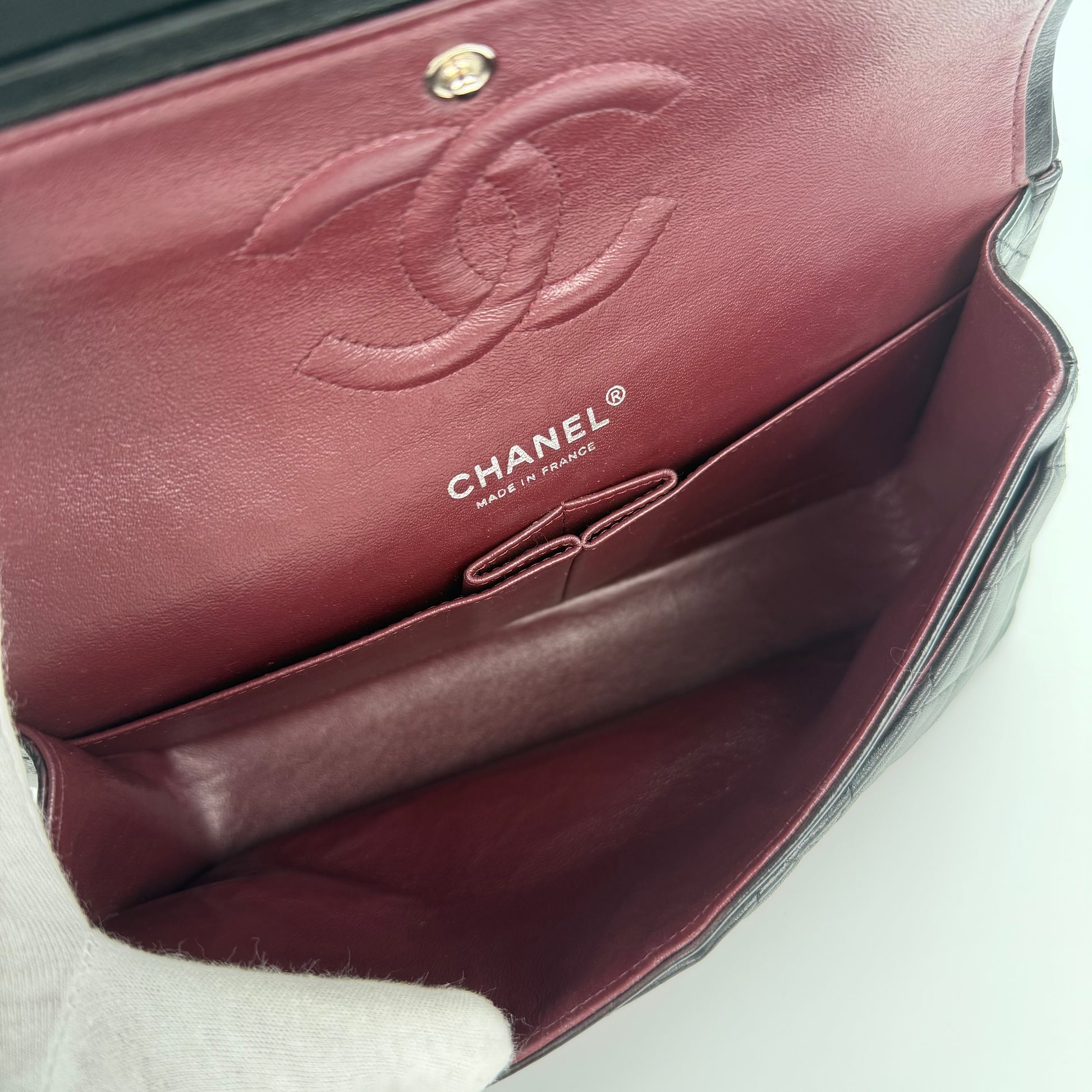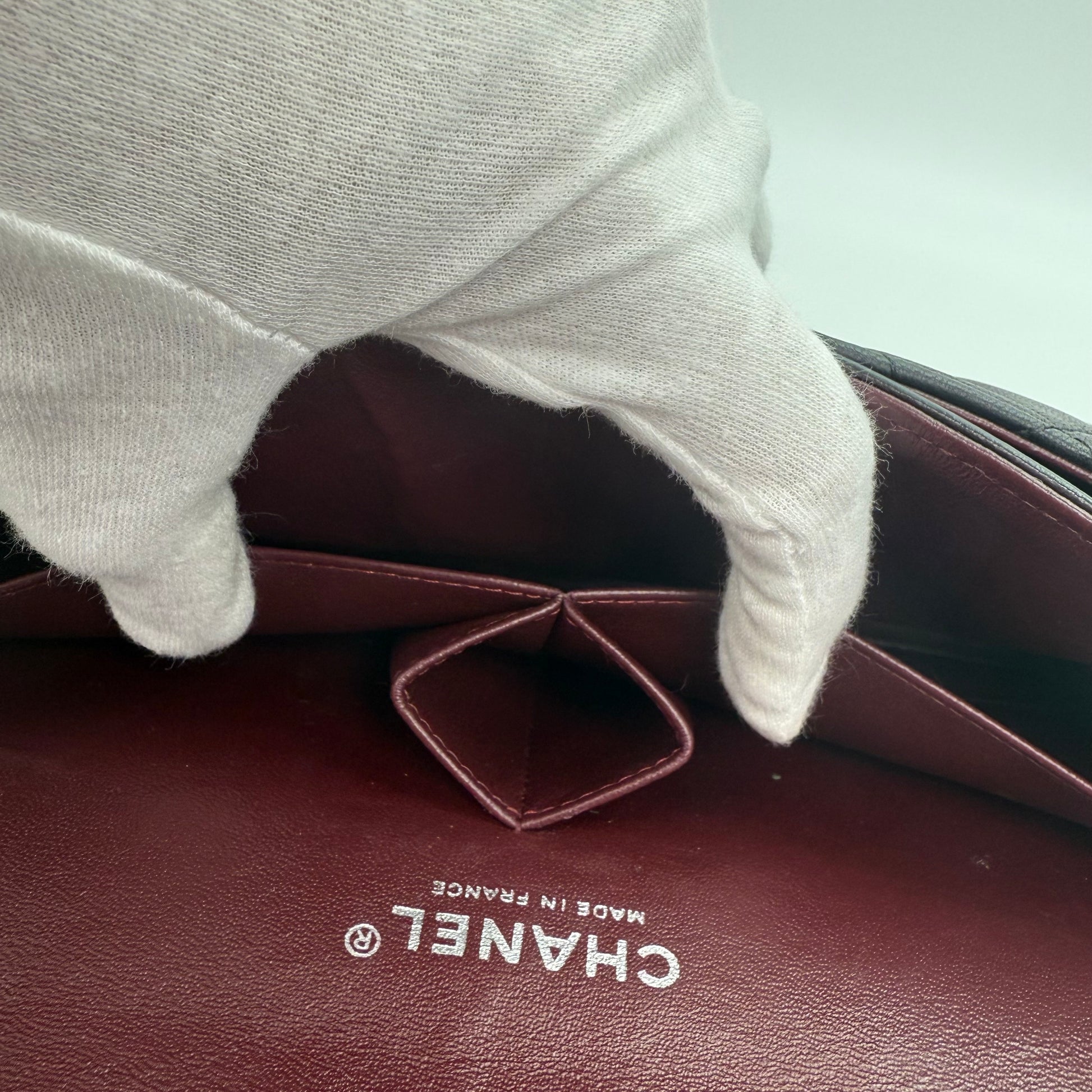 The bag is in excellent pre-owned condition. The lambskin leather is soft and supple, with light creasing and minimal signs of gentle handling. The gold-tone hardware is shiny with only faint surface wear. The interior remains clean and well-kept. This 25cm Classic Flap is a signature Chanel piece—elegant, feminine, and endlessly versatile, making it a timeless addition to any luxury collection.