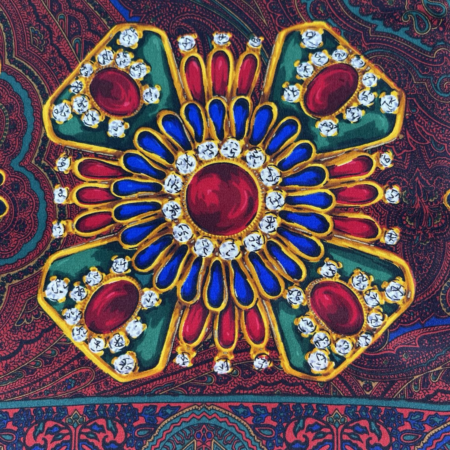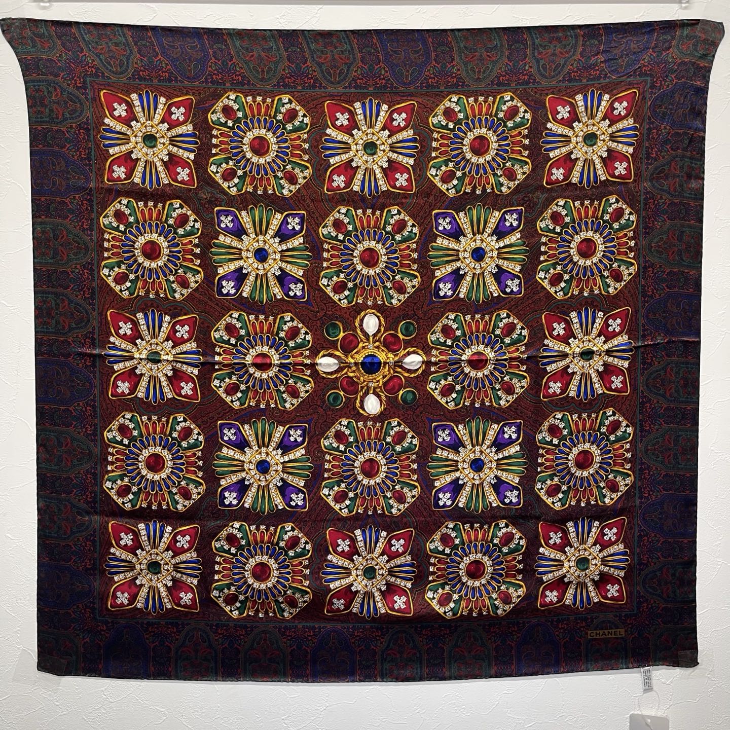 This Chanel silk scarf features an opulent gold jewelry-inspired print set against a rich deep red background. Crafted from luxurious 100% silk, it offers a smooth, elegant drape and a sophisticated sheen. Its generous 90 × 90 cm size allows for versatile styling—worn around the neck, as a headscarf, or tied to a handbag for a chic finishing touch.