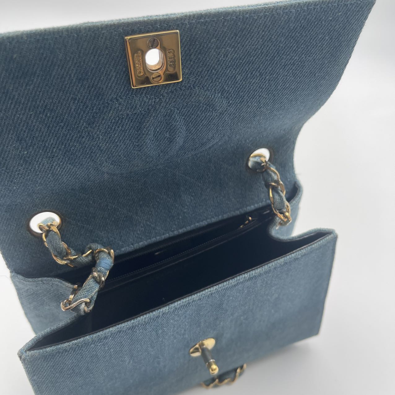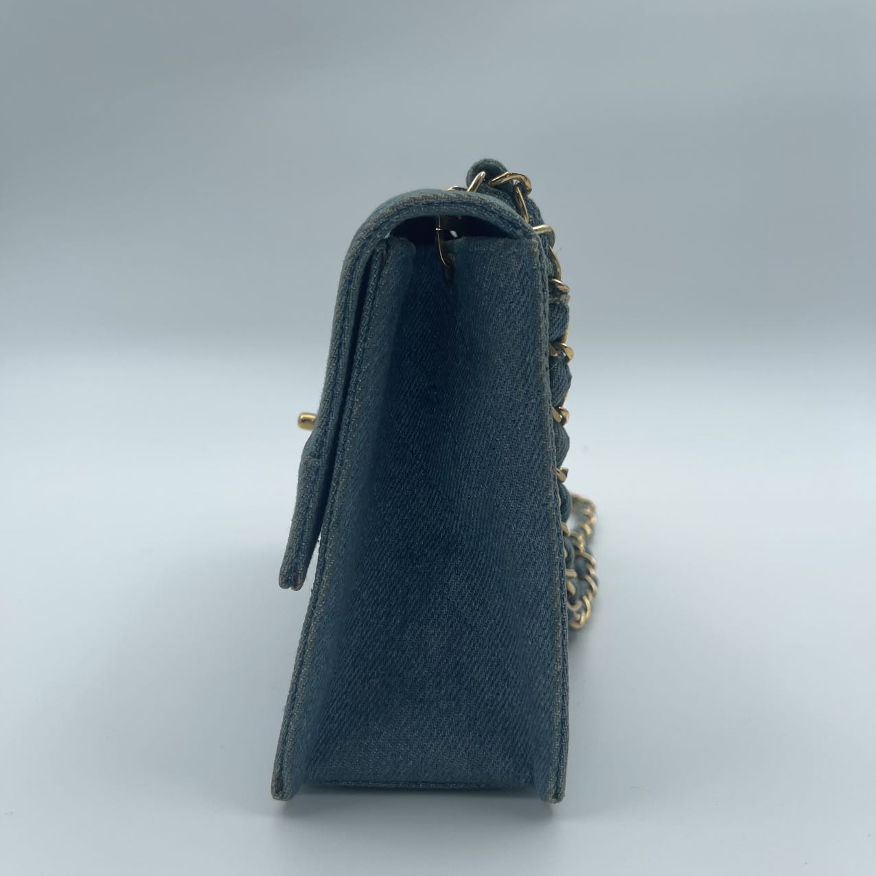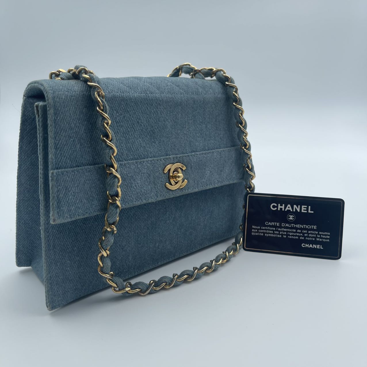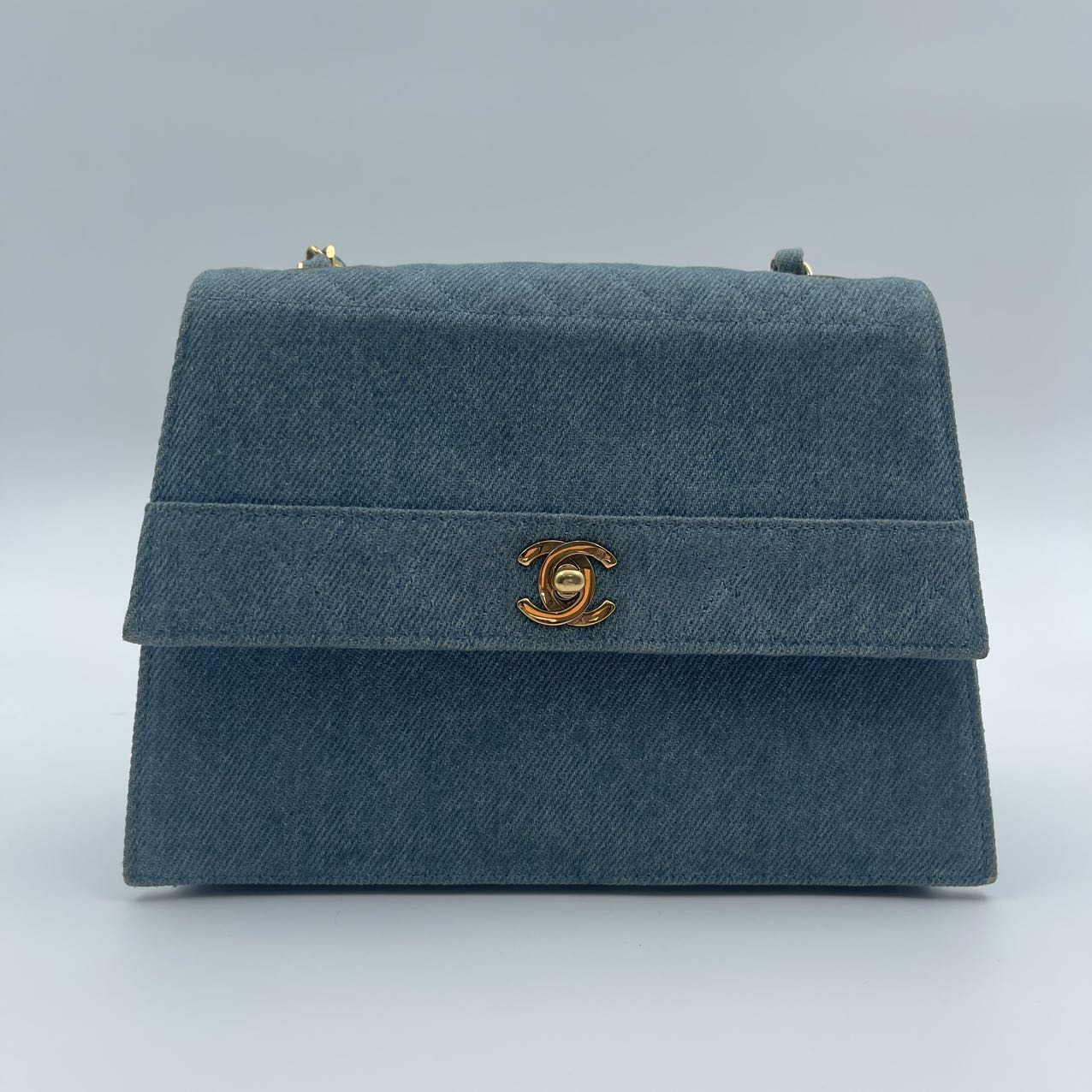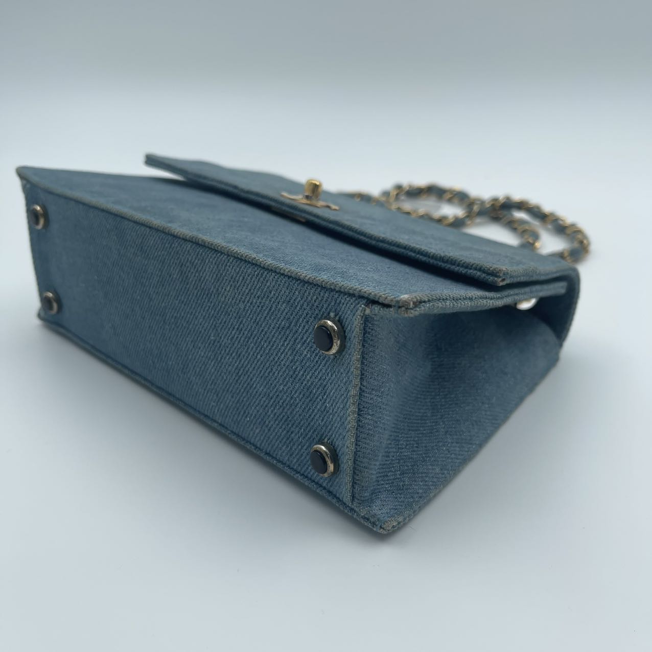 A stylish and contemporary Chanel trapezoid-shaped shoulder bag in light blue denim, combining casual elegance with signature Chanel sophistication.