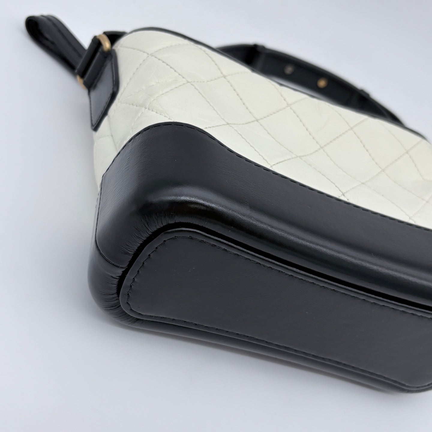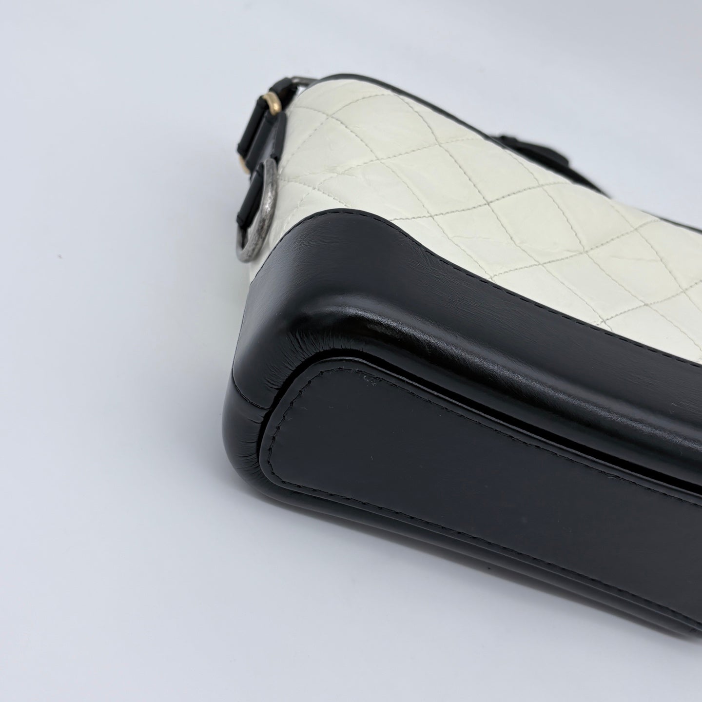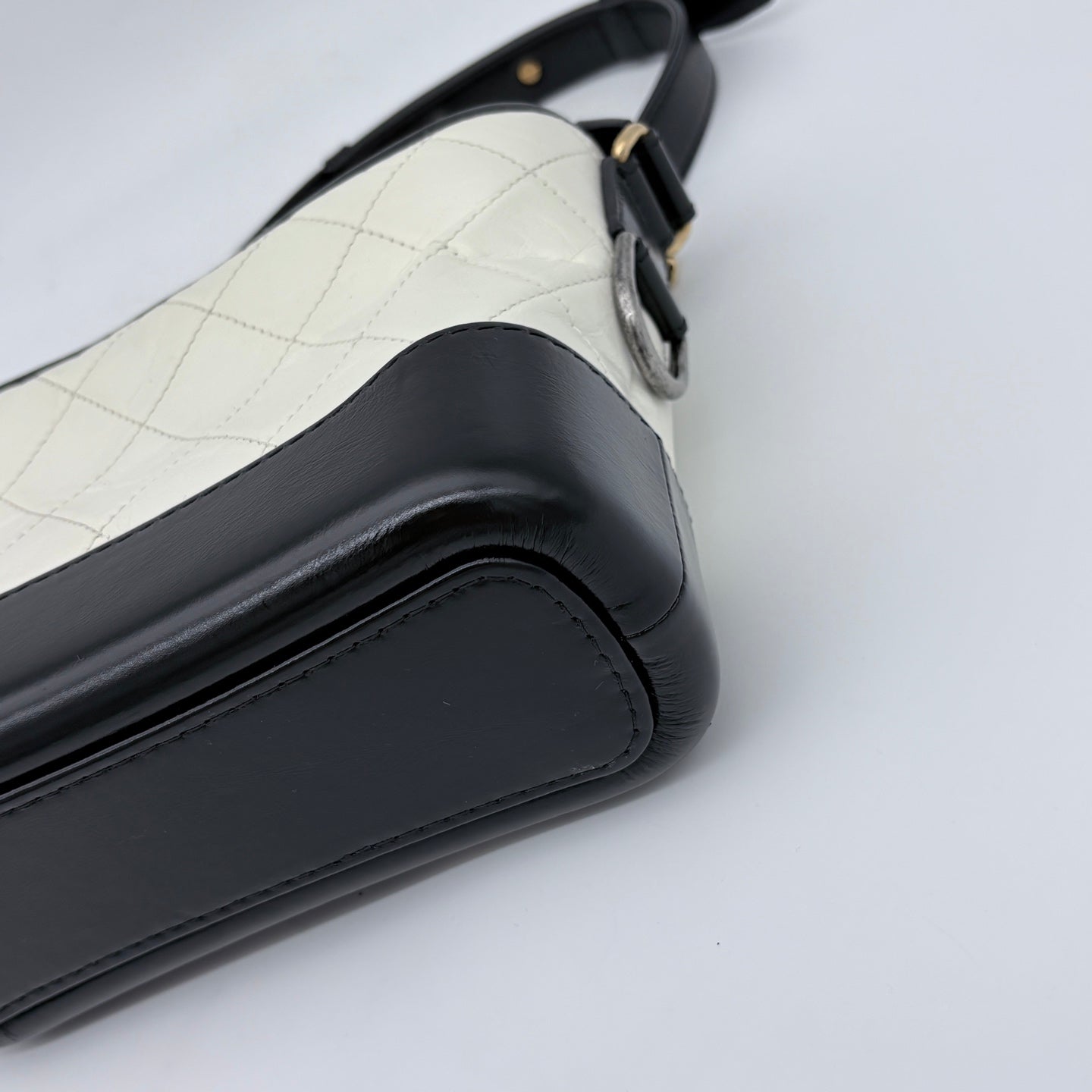This Chanel Gabrielle Small Hobo Bag features a striking black and white color combination, often described as a “panda” colorway for its bold contrast. Please note that “panda” refers solely to the color pairing and does not indicate any printed or illustrated motif.