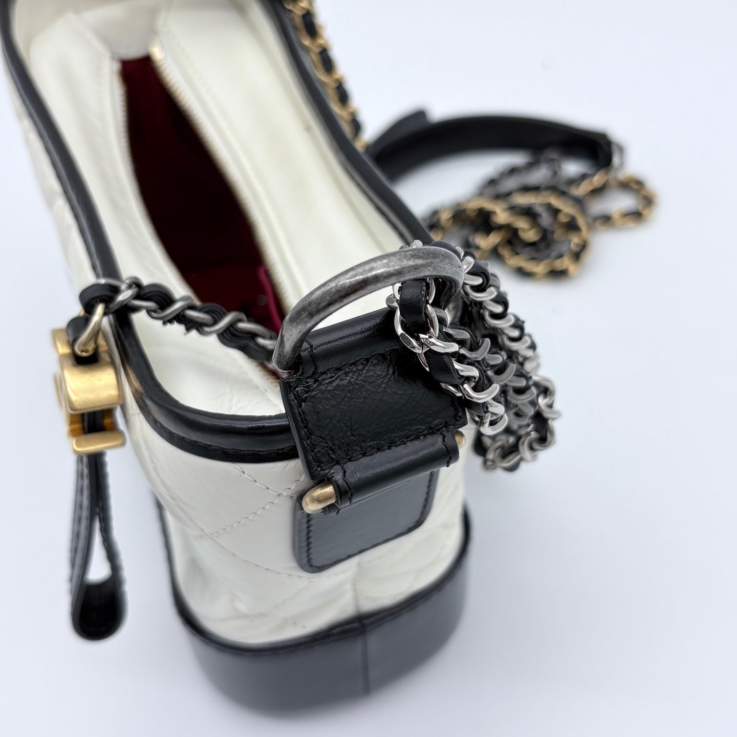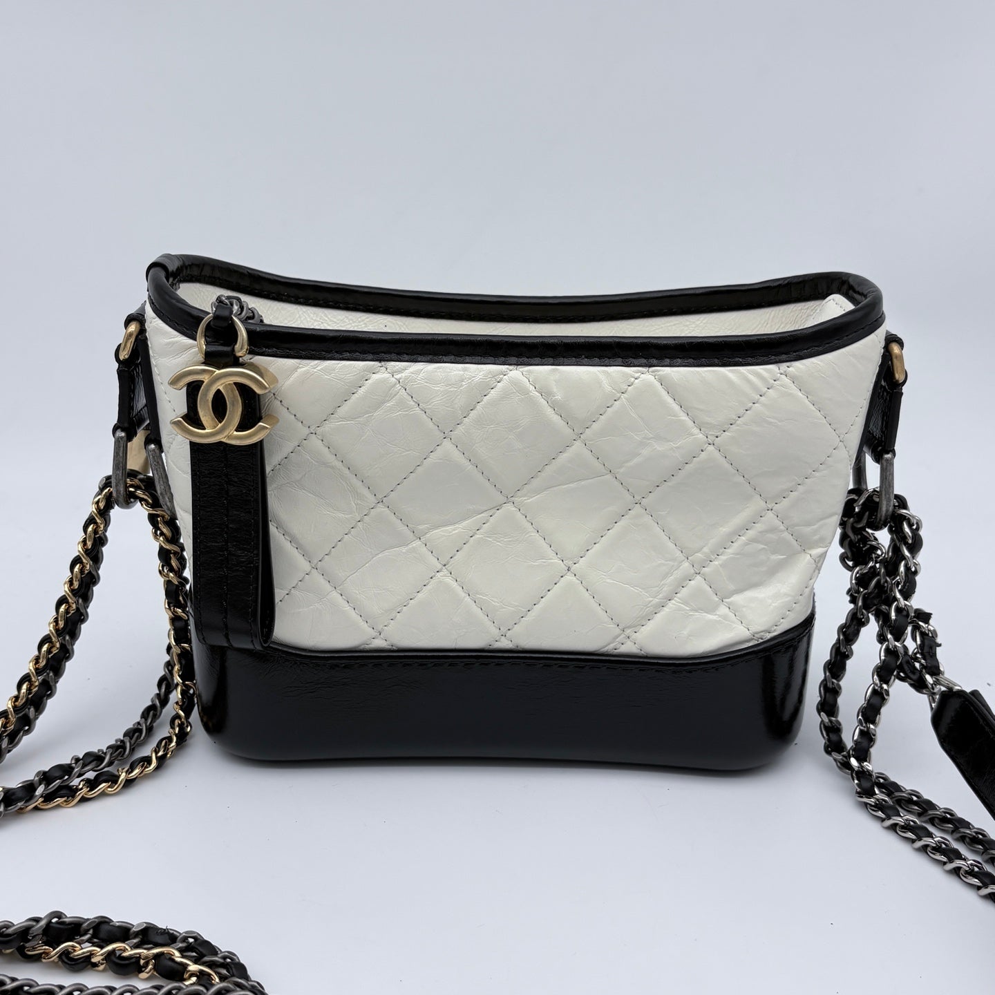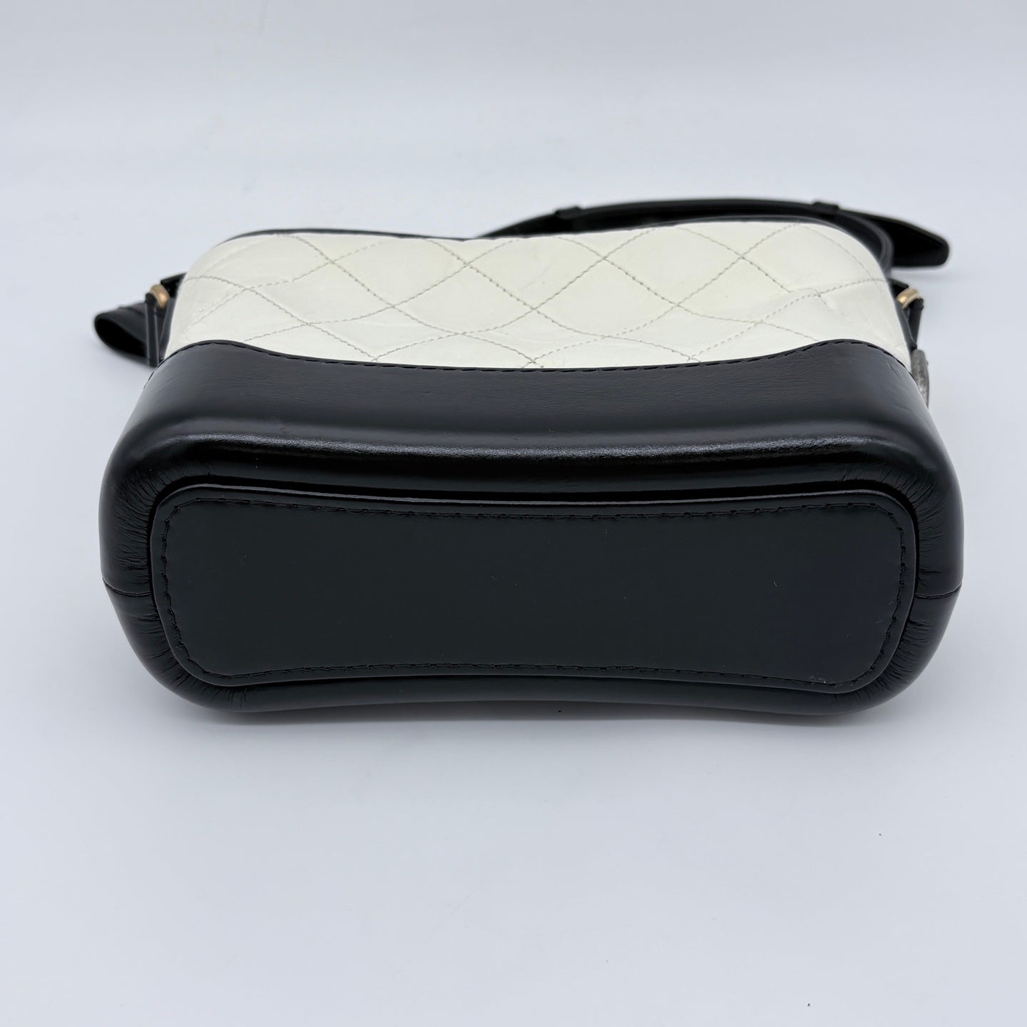 This Chanel Gabrielle Small Hobo Bag features a striking black and white color combination, often described as a “panda” colorway for its bold contrast. Please note that “panda” refers solely to the color pairing and does not indicate any printed or illustrated motif.