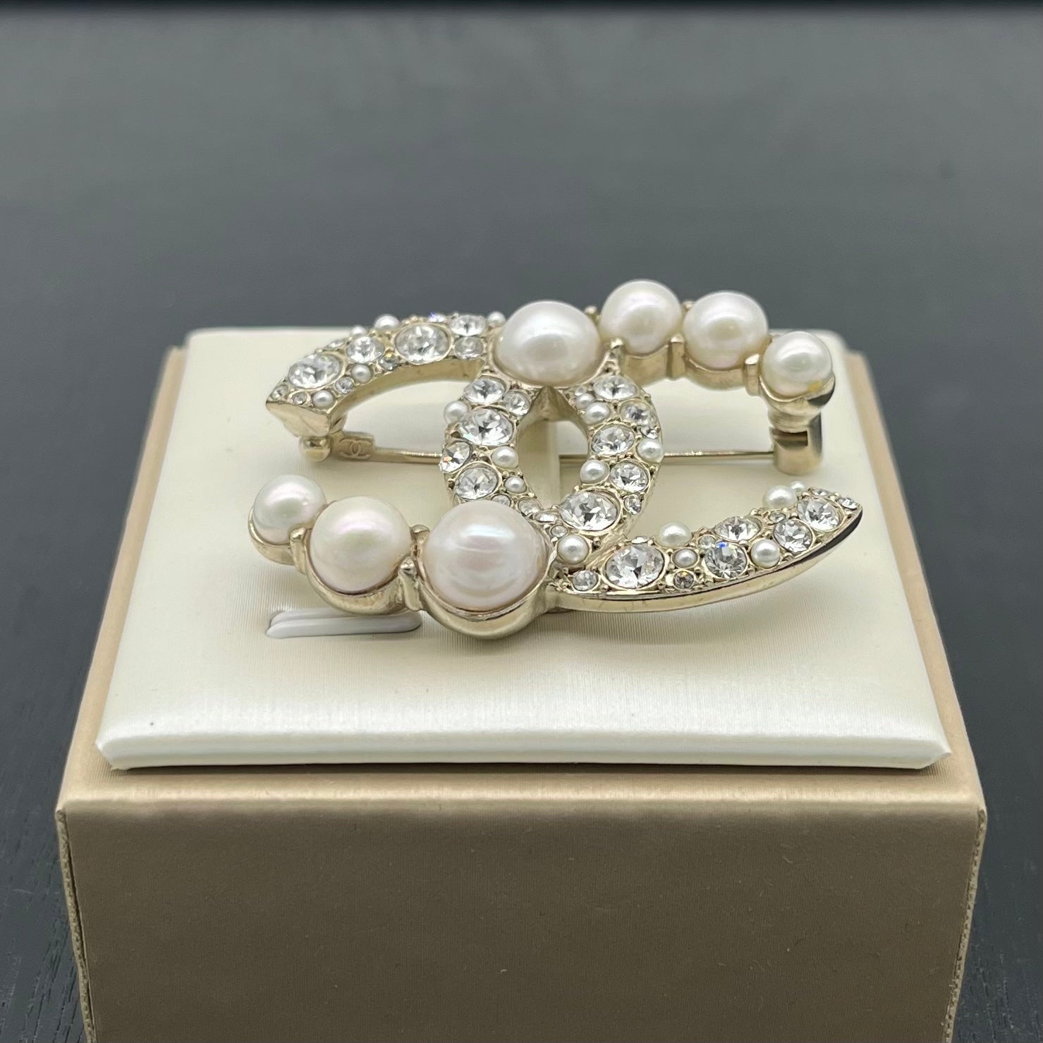 This CHANEL crystal and pearl CC brooch is in excellent pre-owned condition.