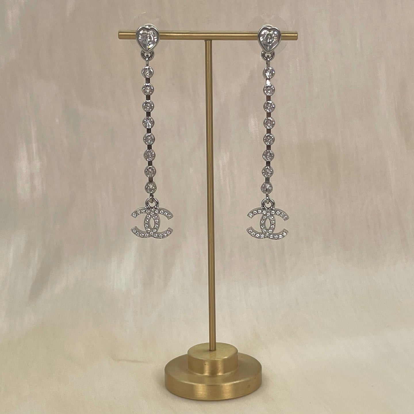 Crafted in silver-tone alloy and fully set with rhinestones, the earrings reflect light beautifully while maintaining a delicate and balanced design. The heart motif adds a feminine touch, while the iconic CC logo anchors the piece in classic Chanel identity. A versatile yet eye-catching pair that works effortlessly for both day and evening styling.