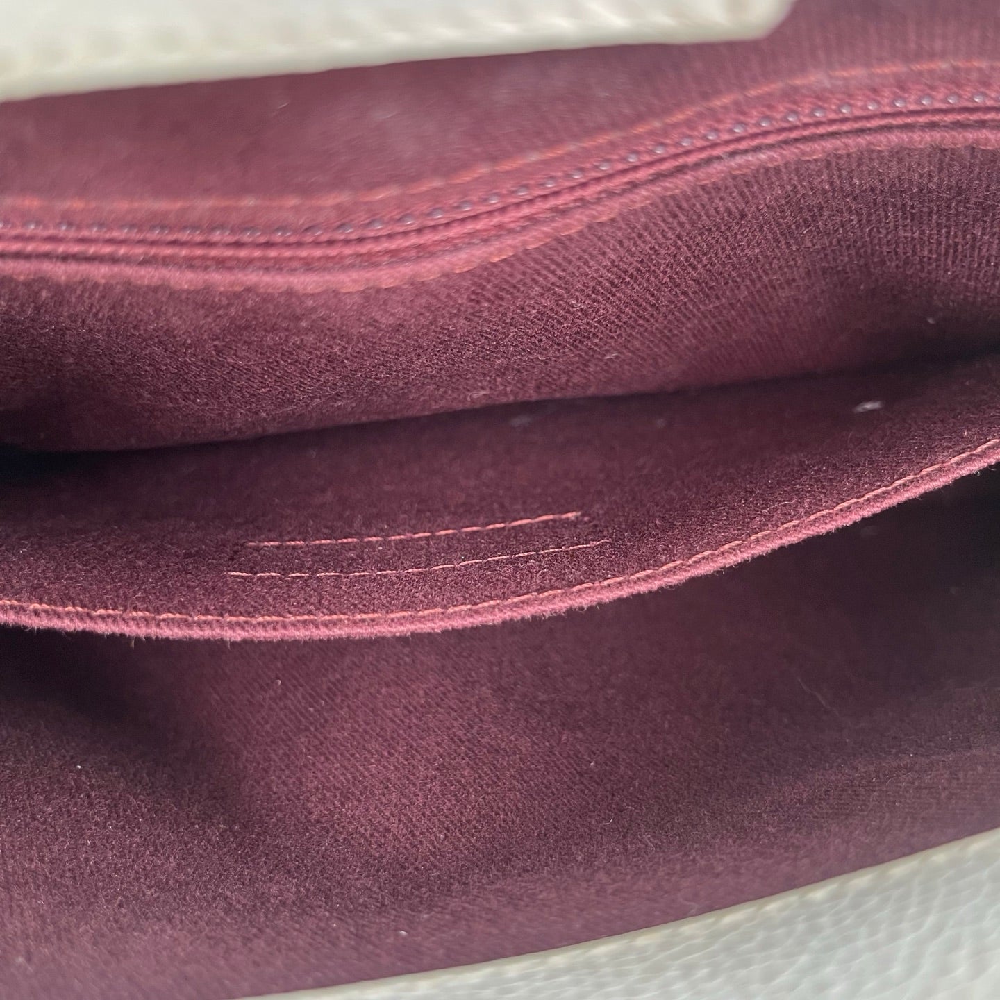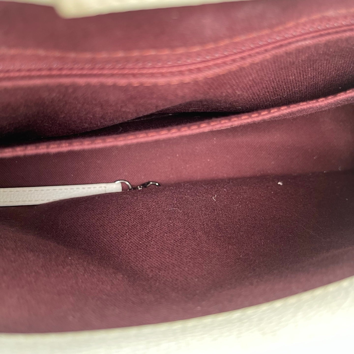 This bag is in good pre-owned condition. Due to the nature of light-colored calfskin, there are minor stains and discoloration along the edges. The overall appearance remains clean, and the leather is well maintained. The metal logo shows minimal signs of wear with almost no visible scratches. Overall, the bag presents well and retains a refined look.
