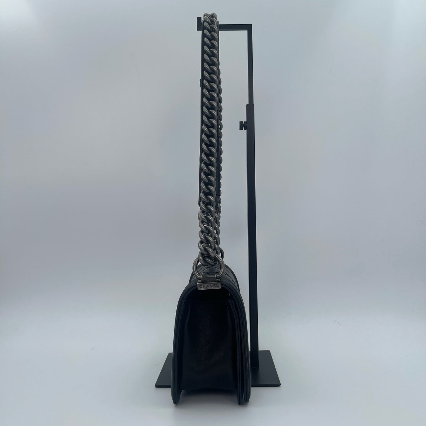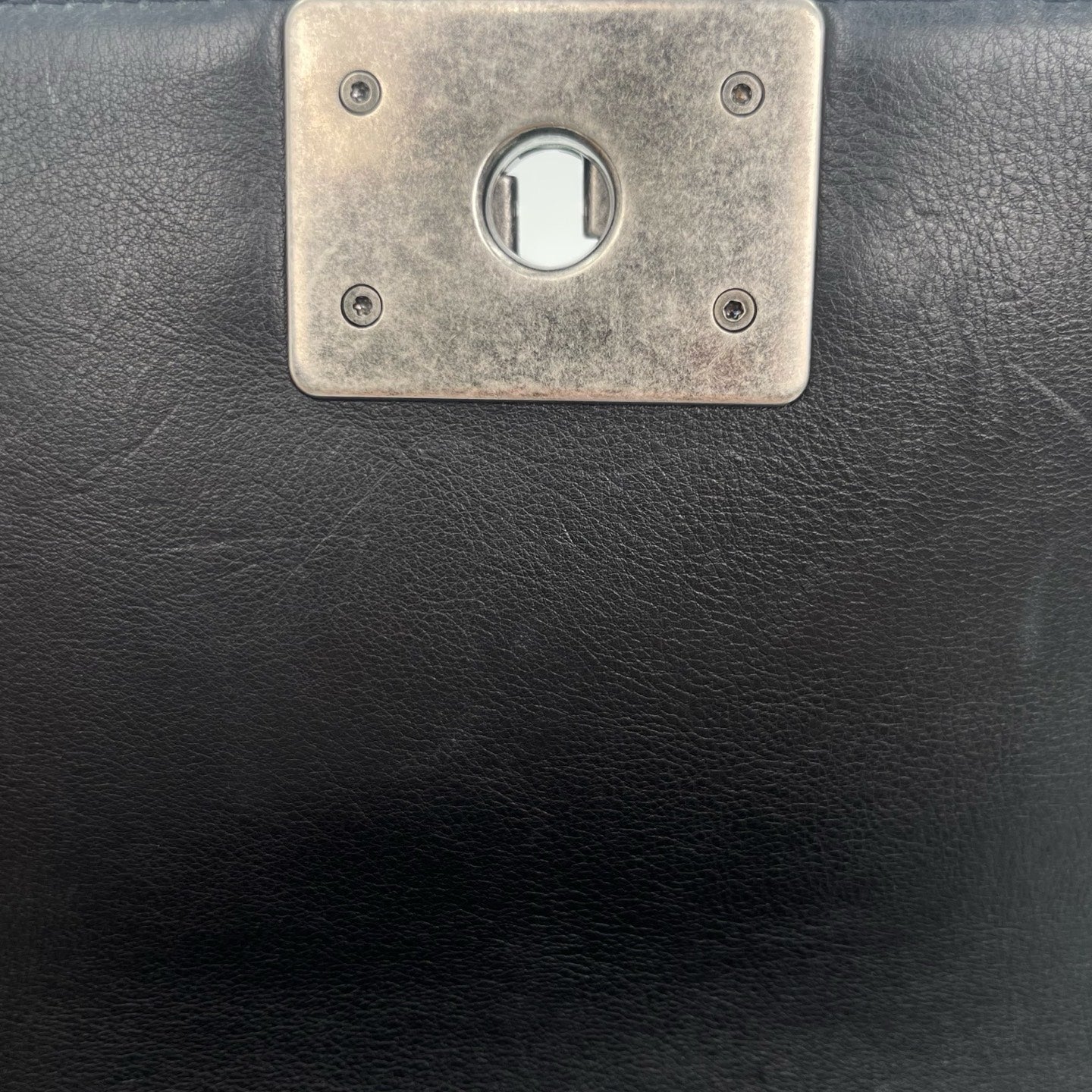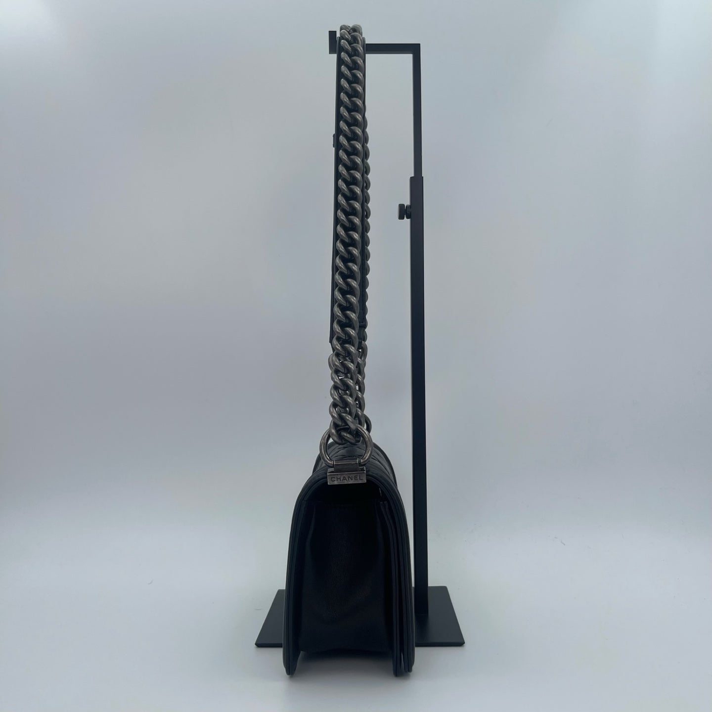 The structured silhouette is complemented by aged silver-tone hardware and the iconic Boy push-lock closure, giving it a modern and slightly edgy aesthetic. The chain strap allows for both shoulder and crossbody wear, offering versatility for daily styling.
