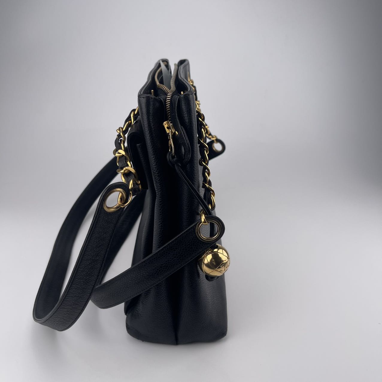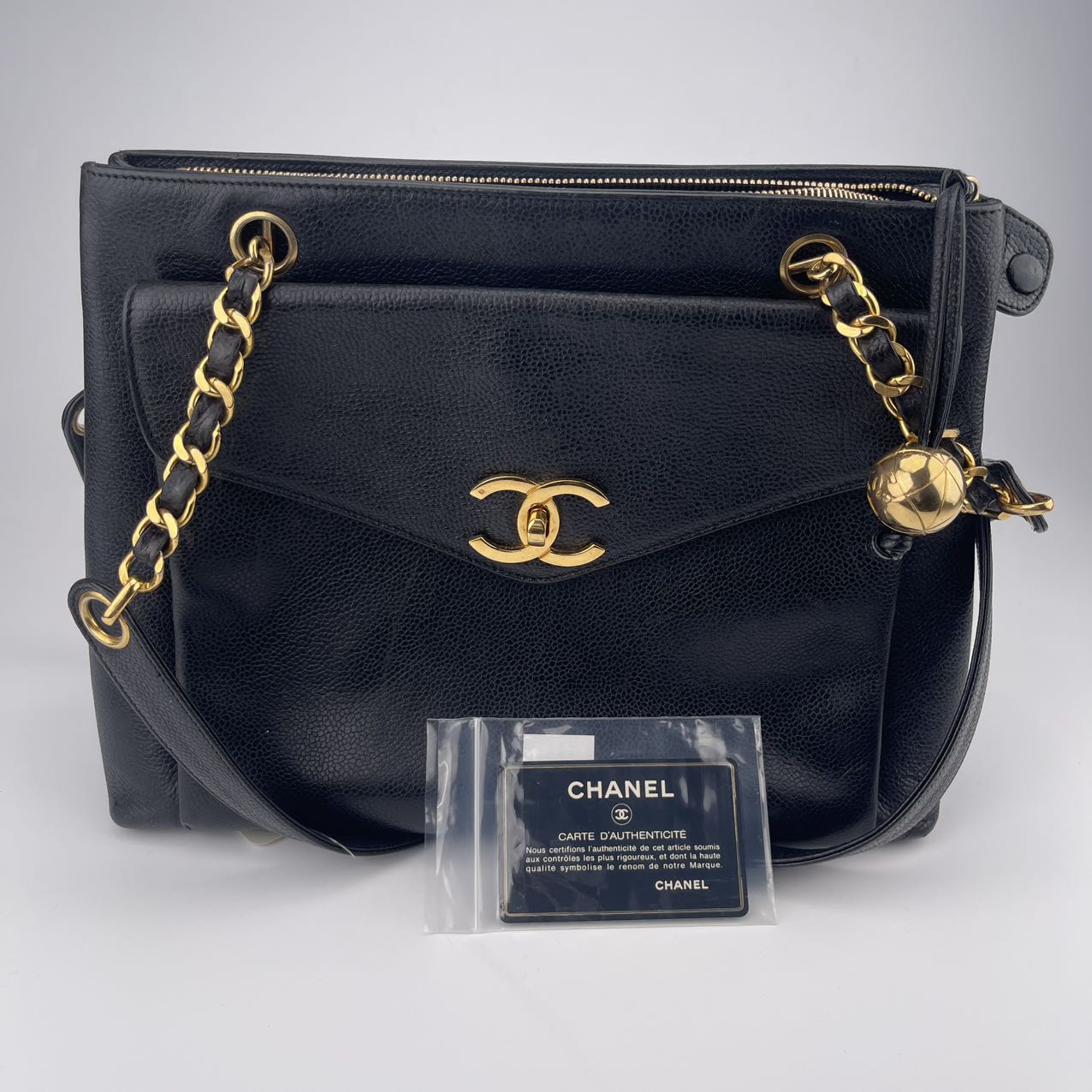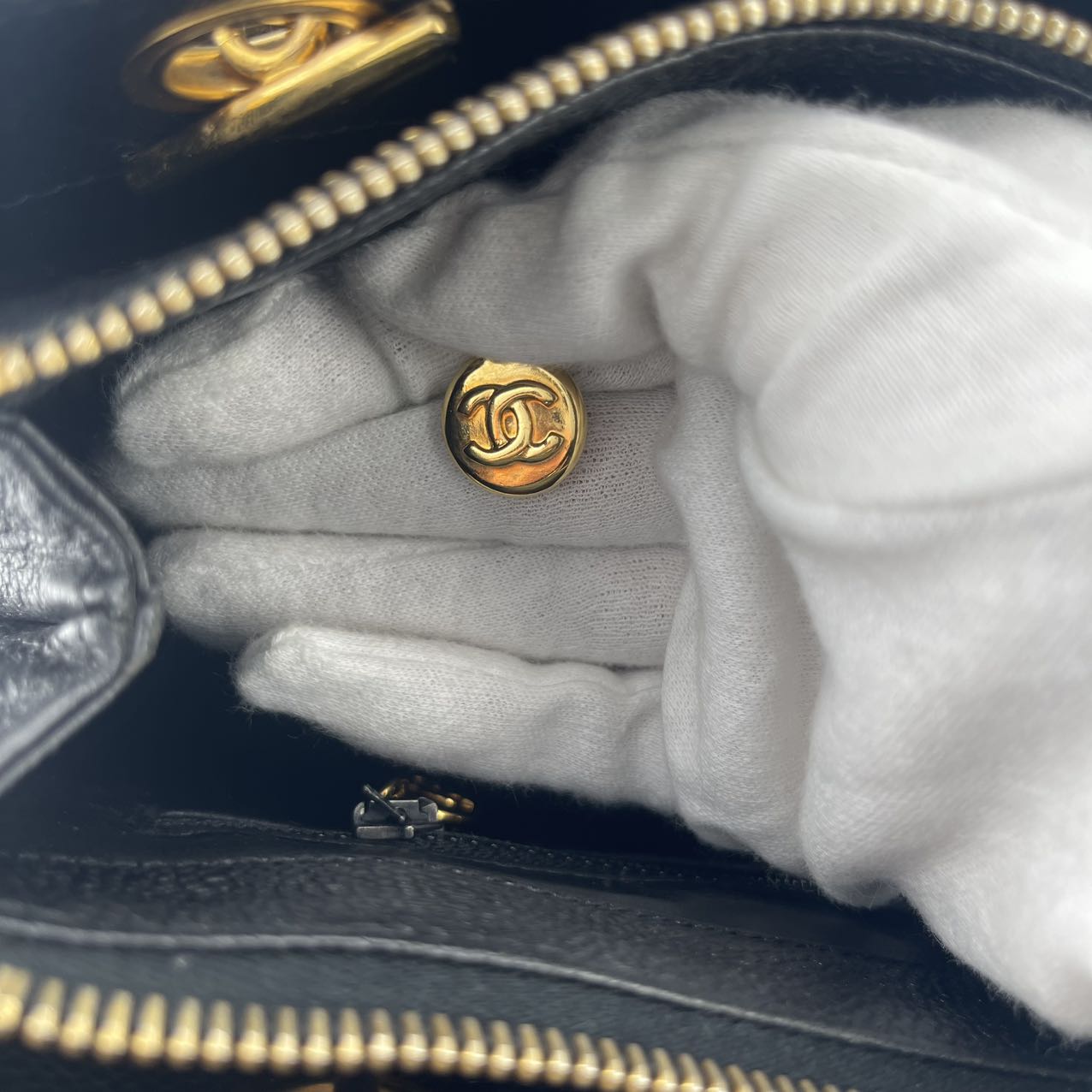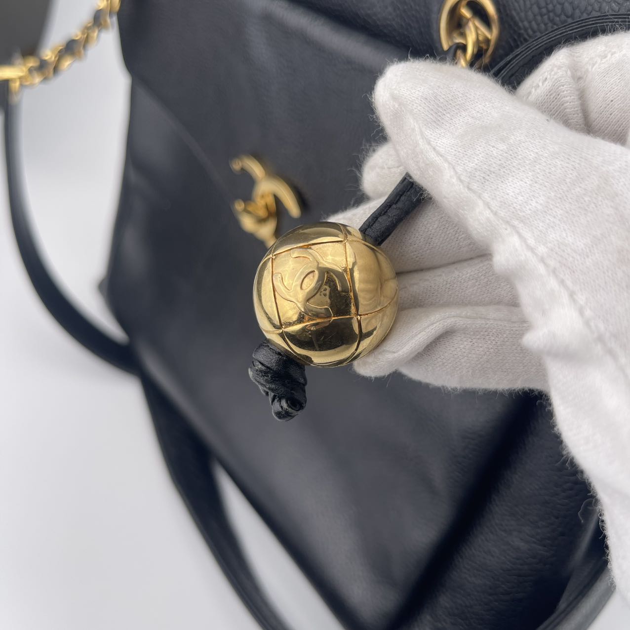 Hardware: Gold-tone hardware, including the signature Chanel gold ball detail, providing a warm and eye-catching contrast against the deep black leather.