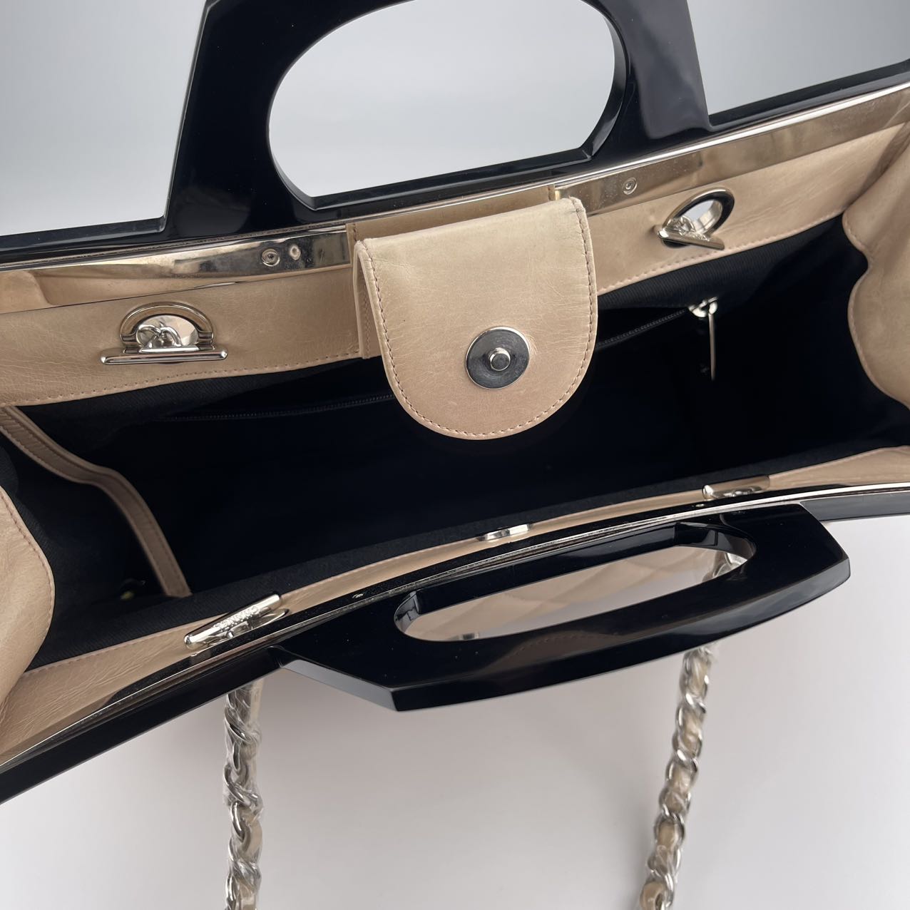Hardware: Gold-tone hardware, including the interlocking CC logo and chain shoulder strap with leather threading.