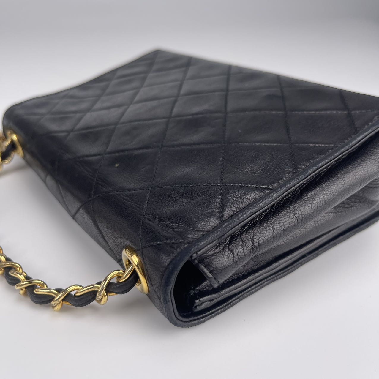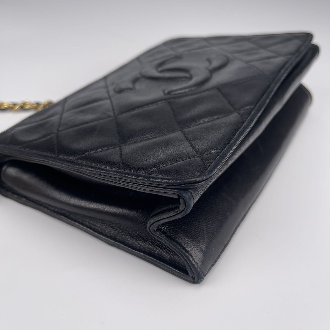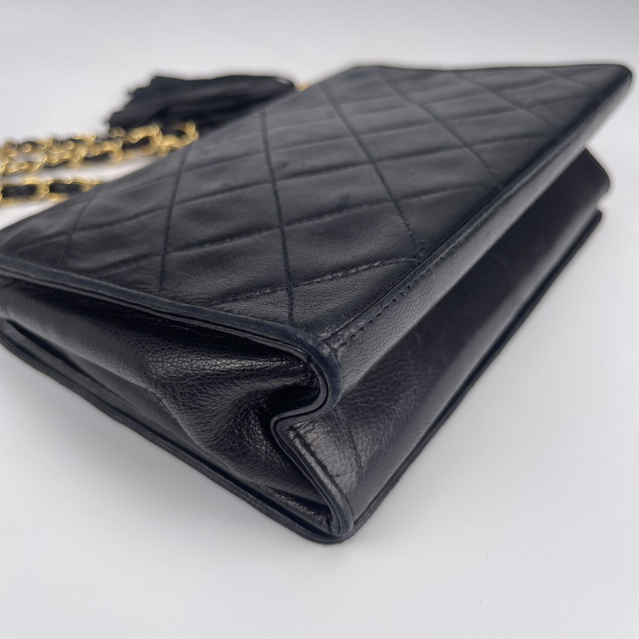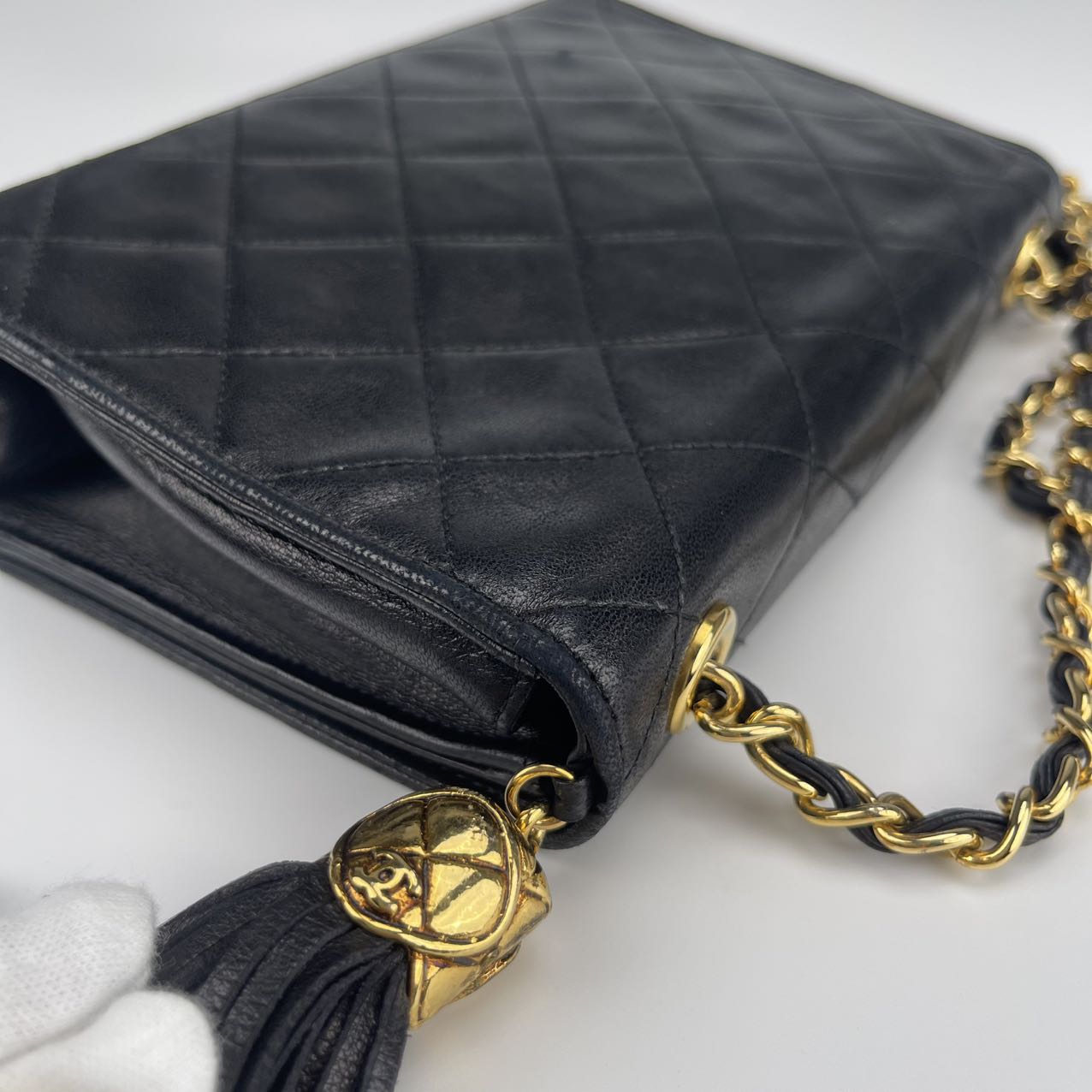 Classic Chanel Matelassé (quilted) chain shoulder bag in sleek black lambskin.