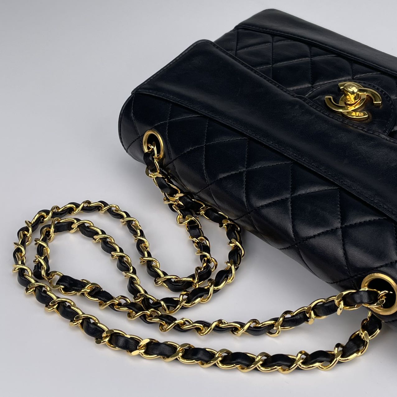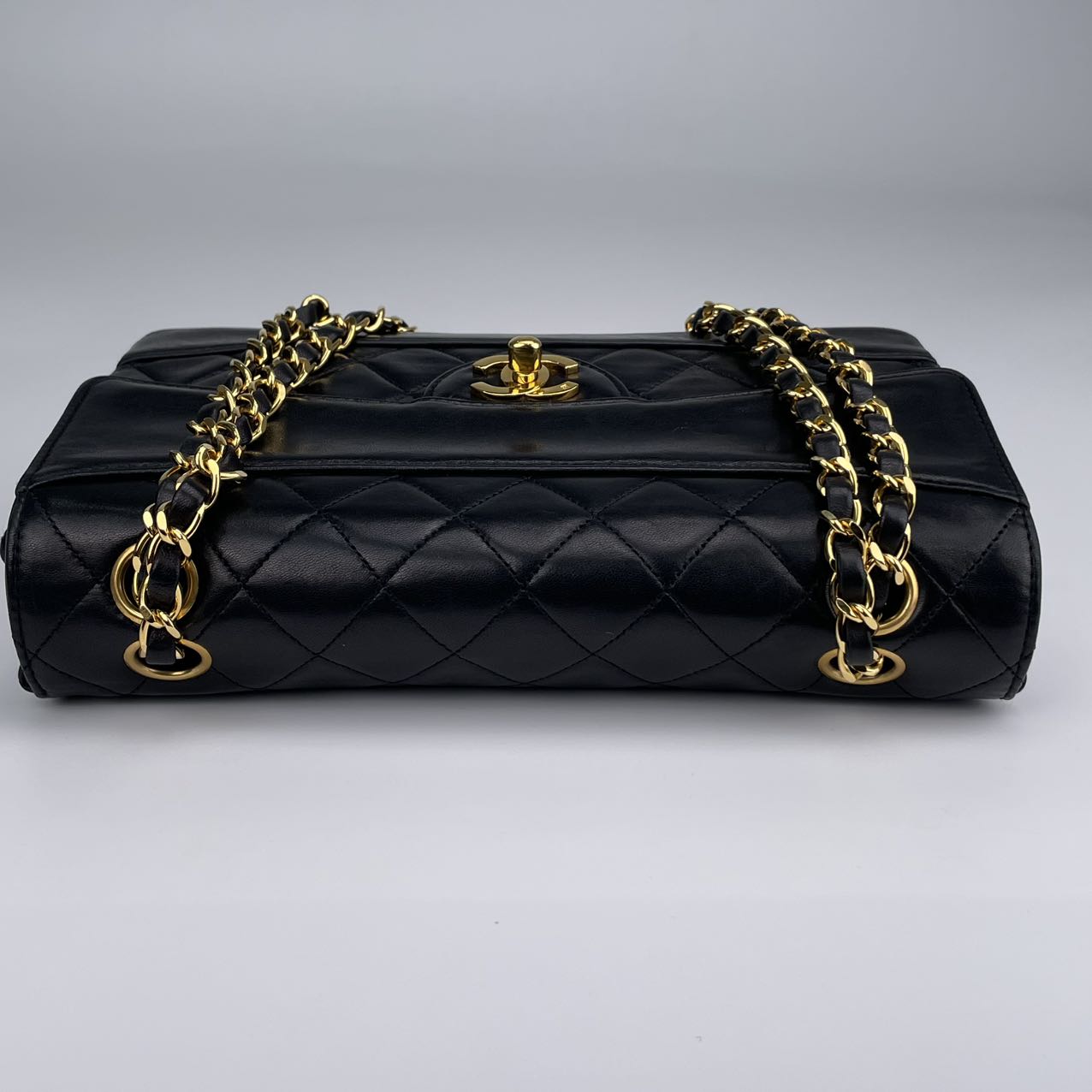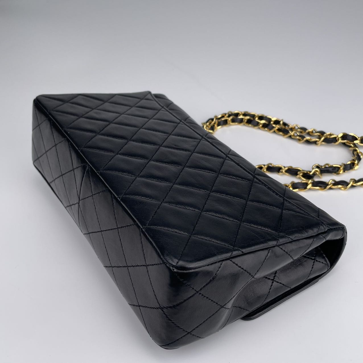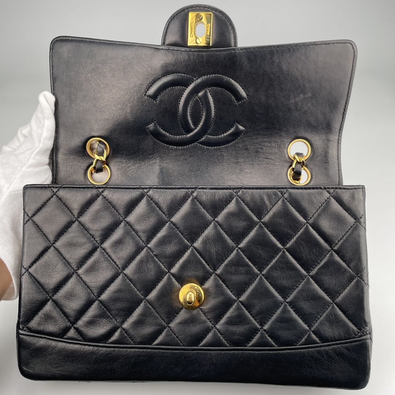 Classic Chanel quilted shoulder bag crafted in supple black lambskin.