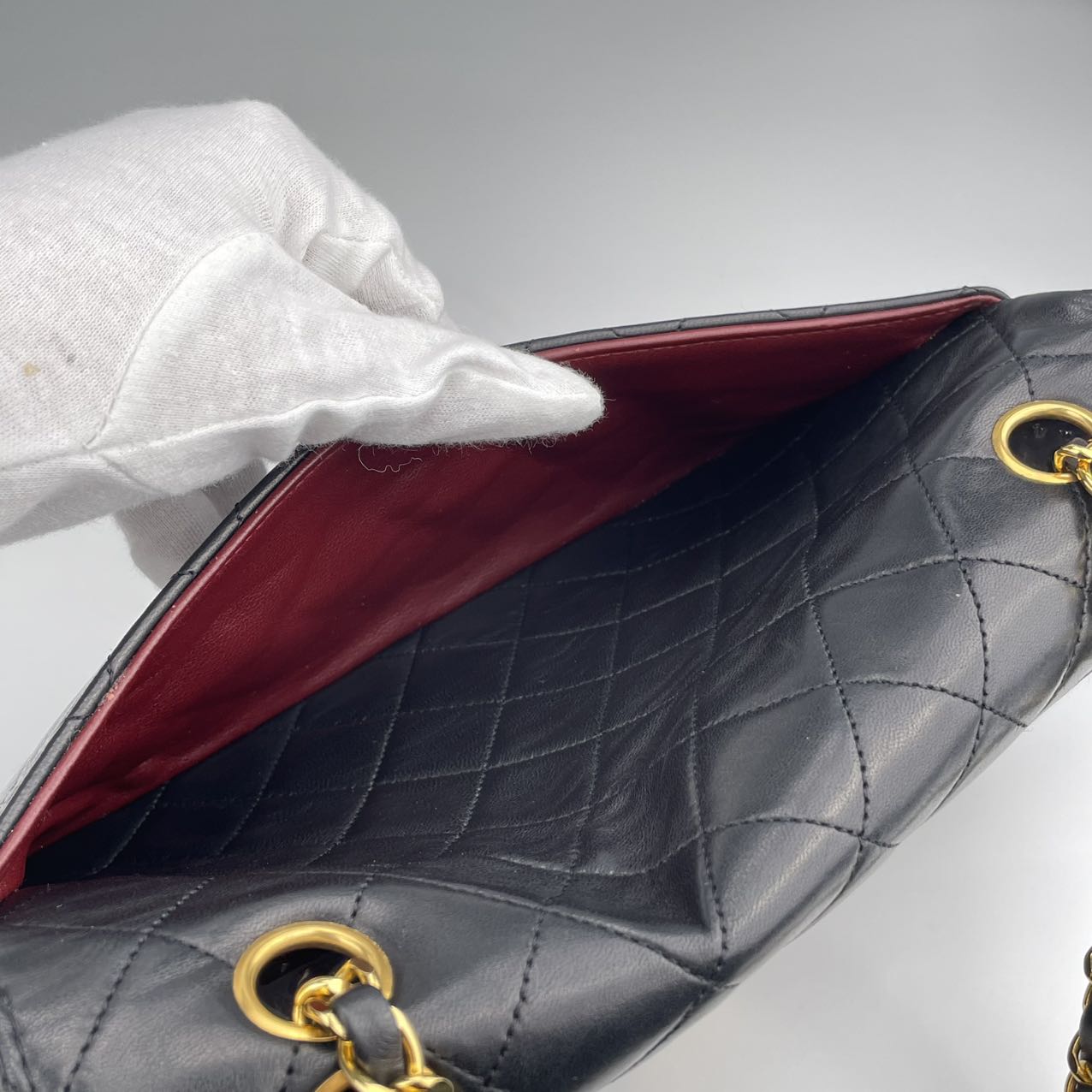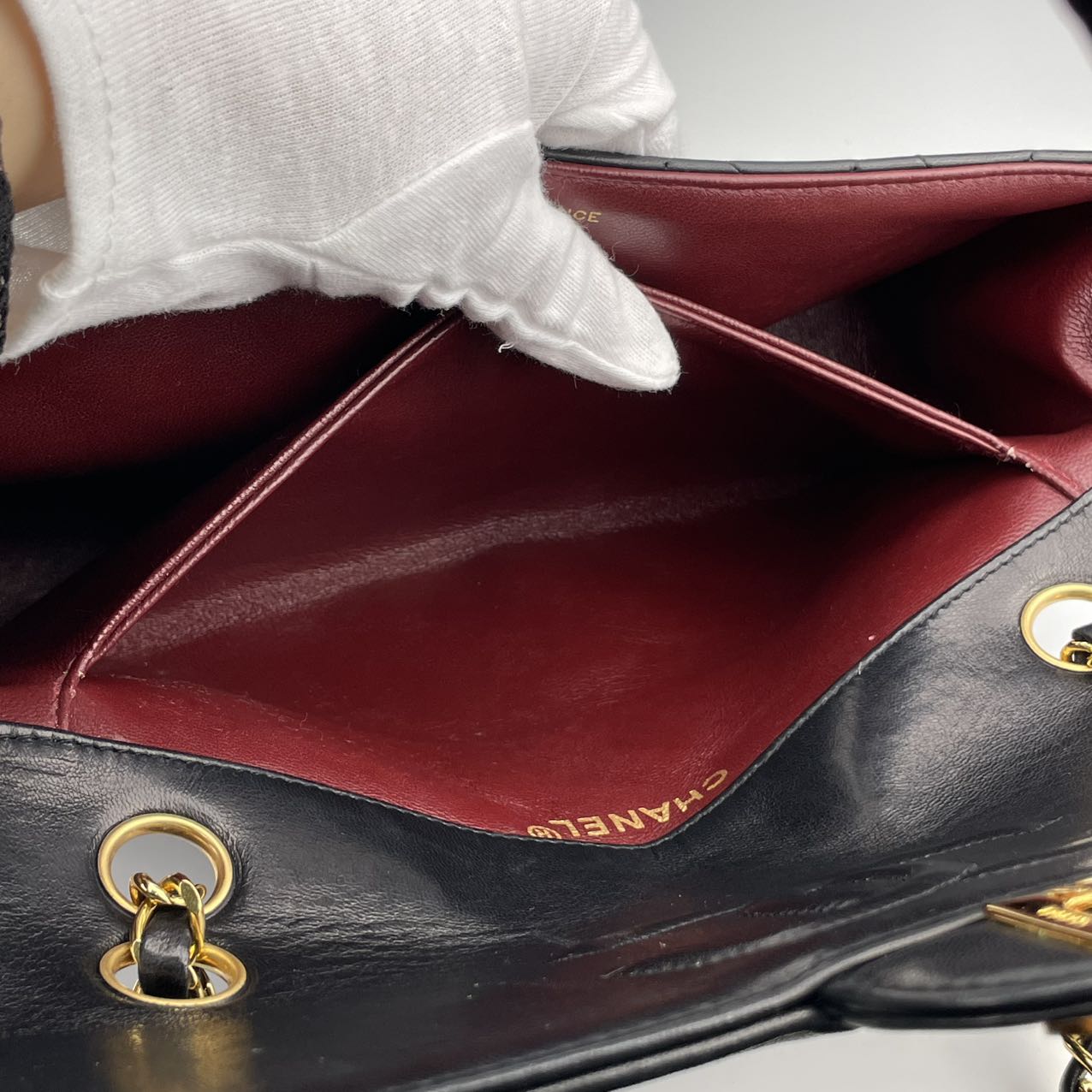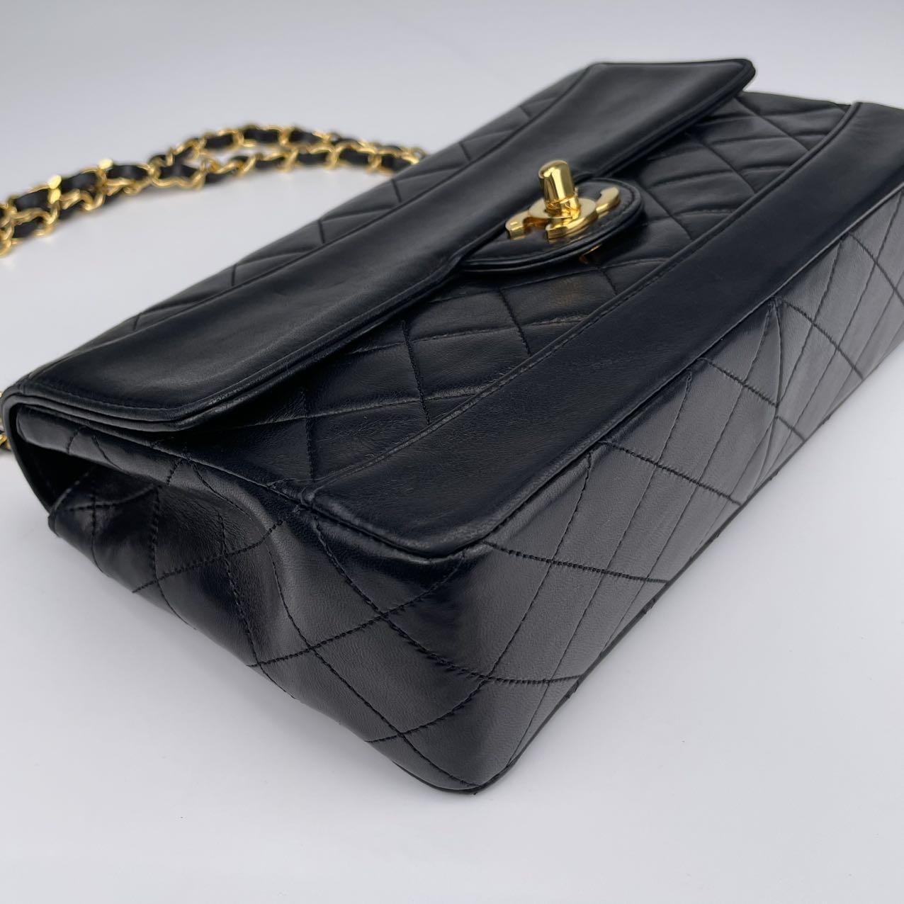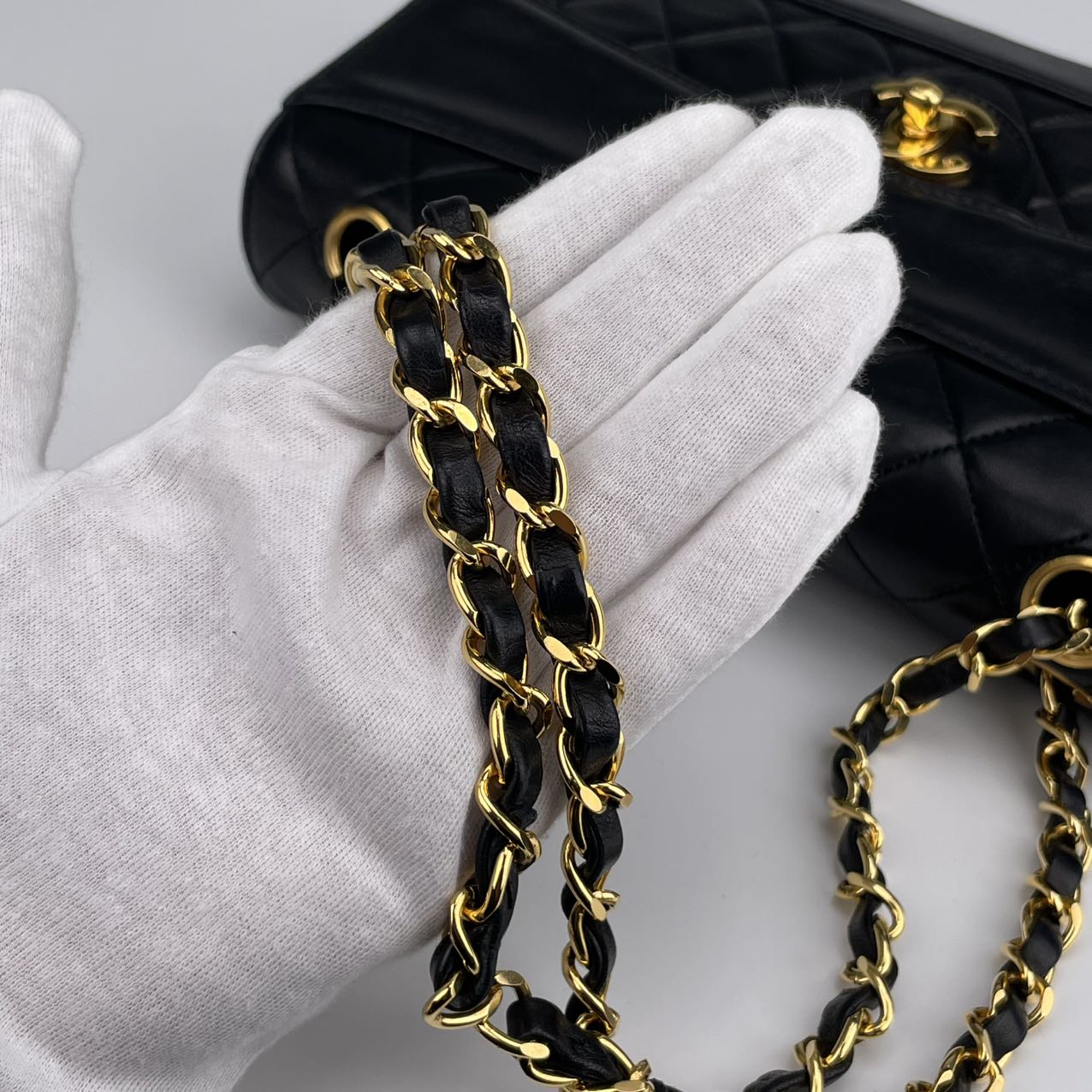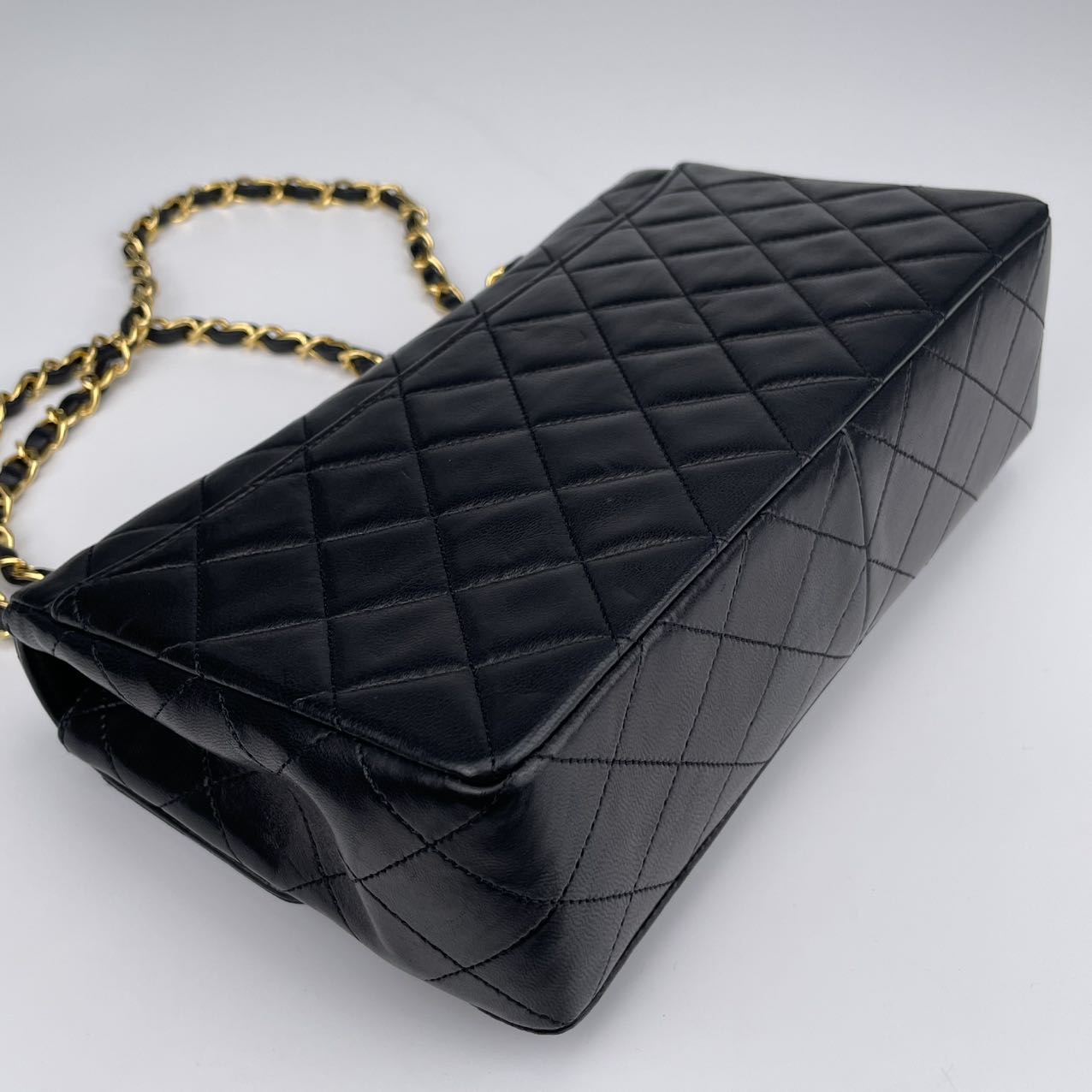 Classic Chanel quilted shoulder bag crafted in supple black lambskin.