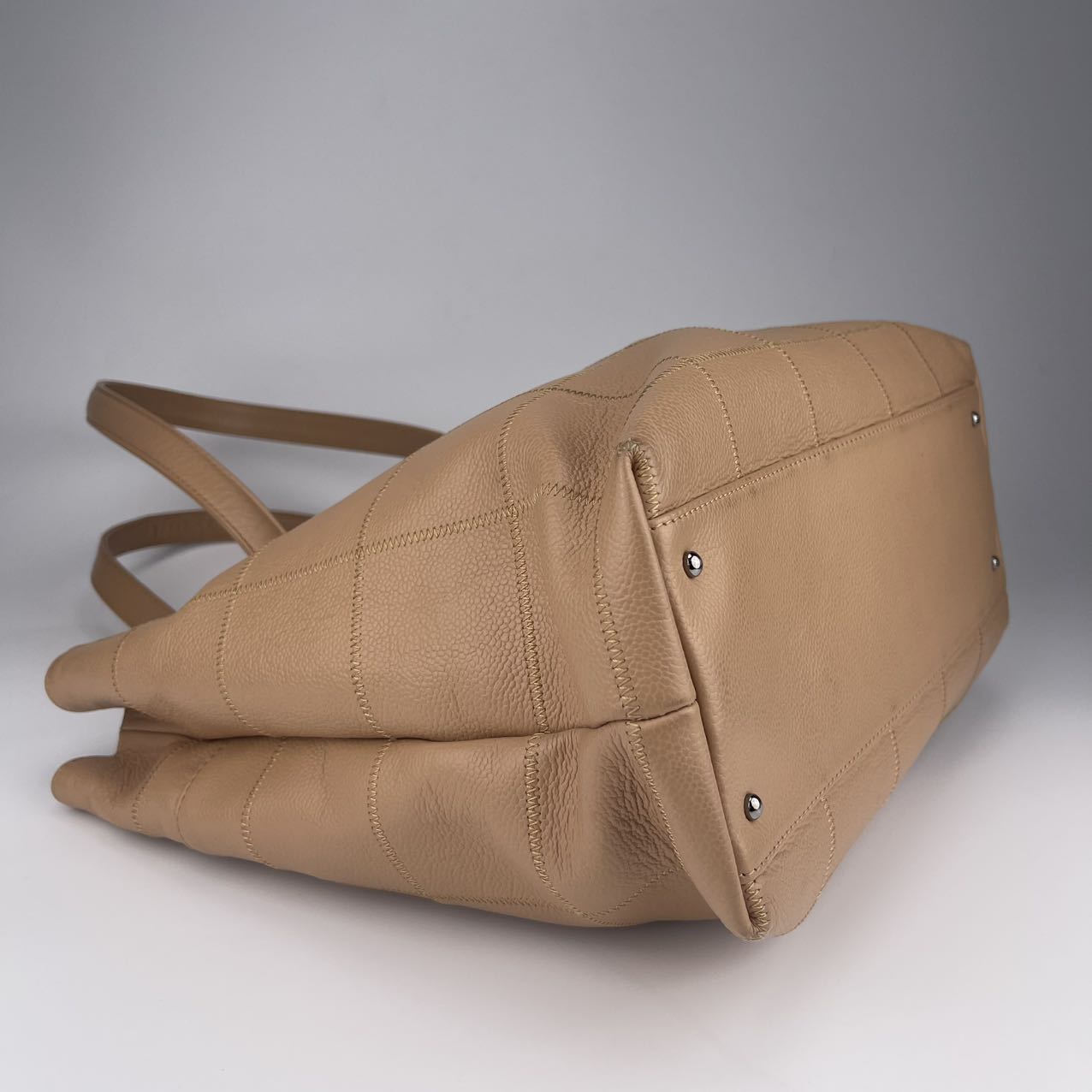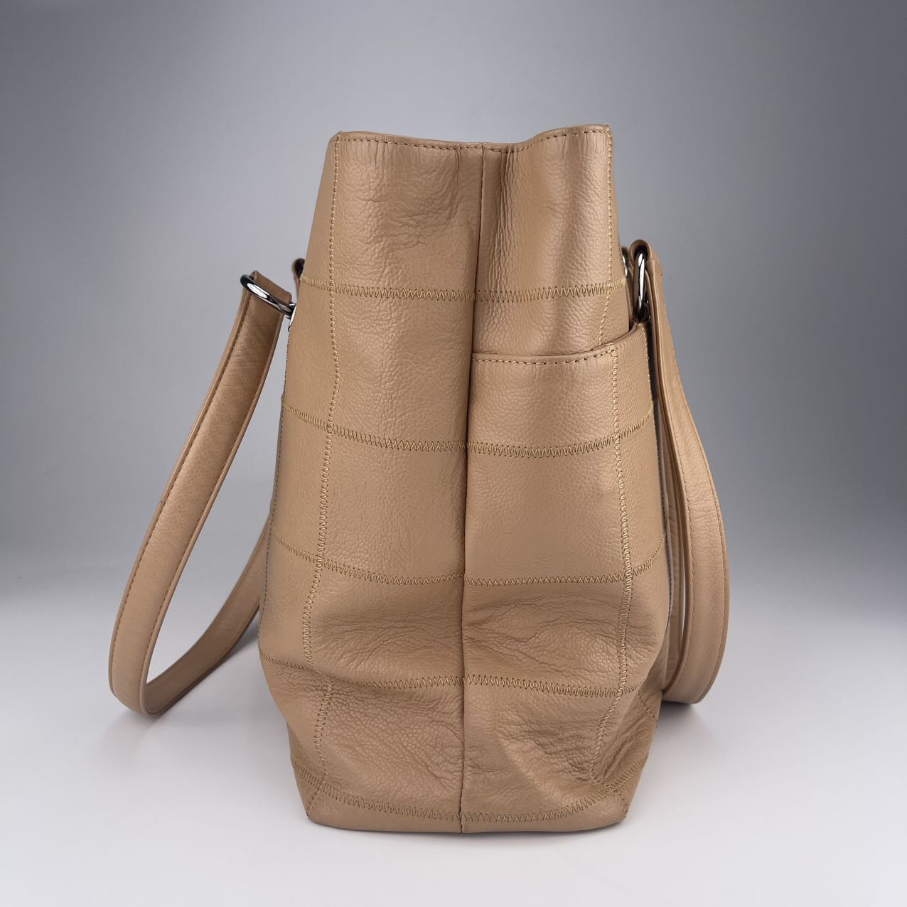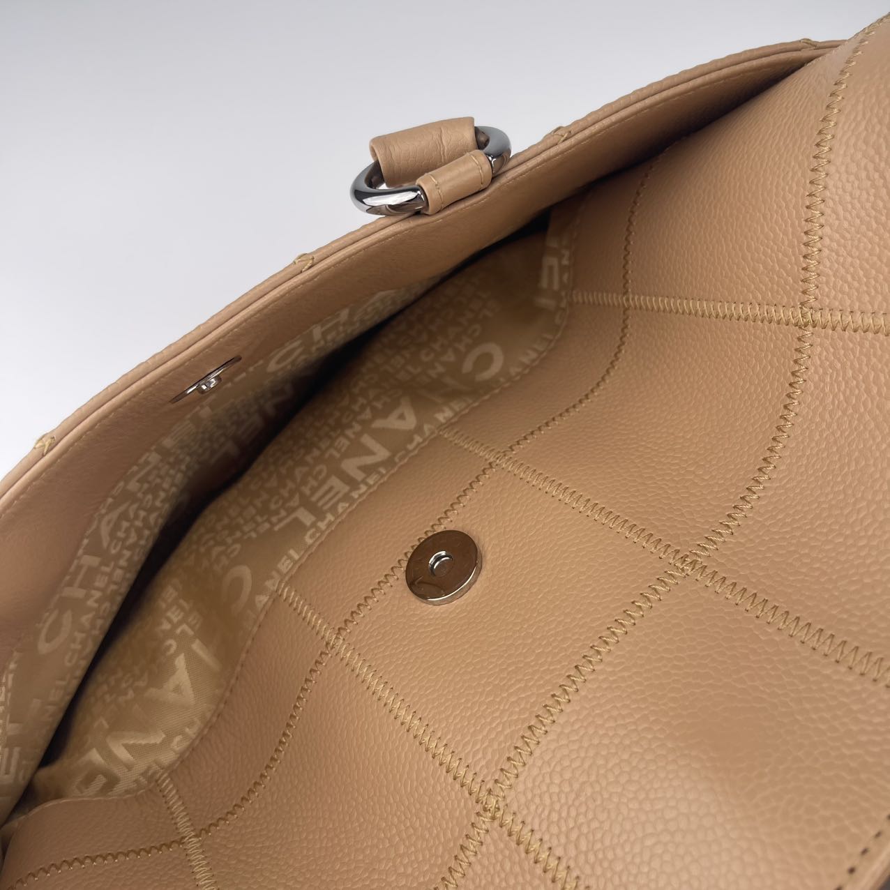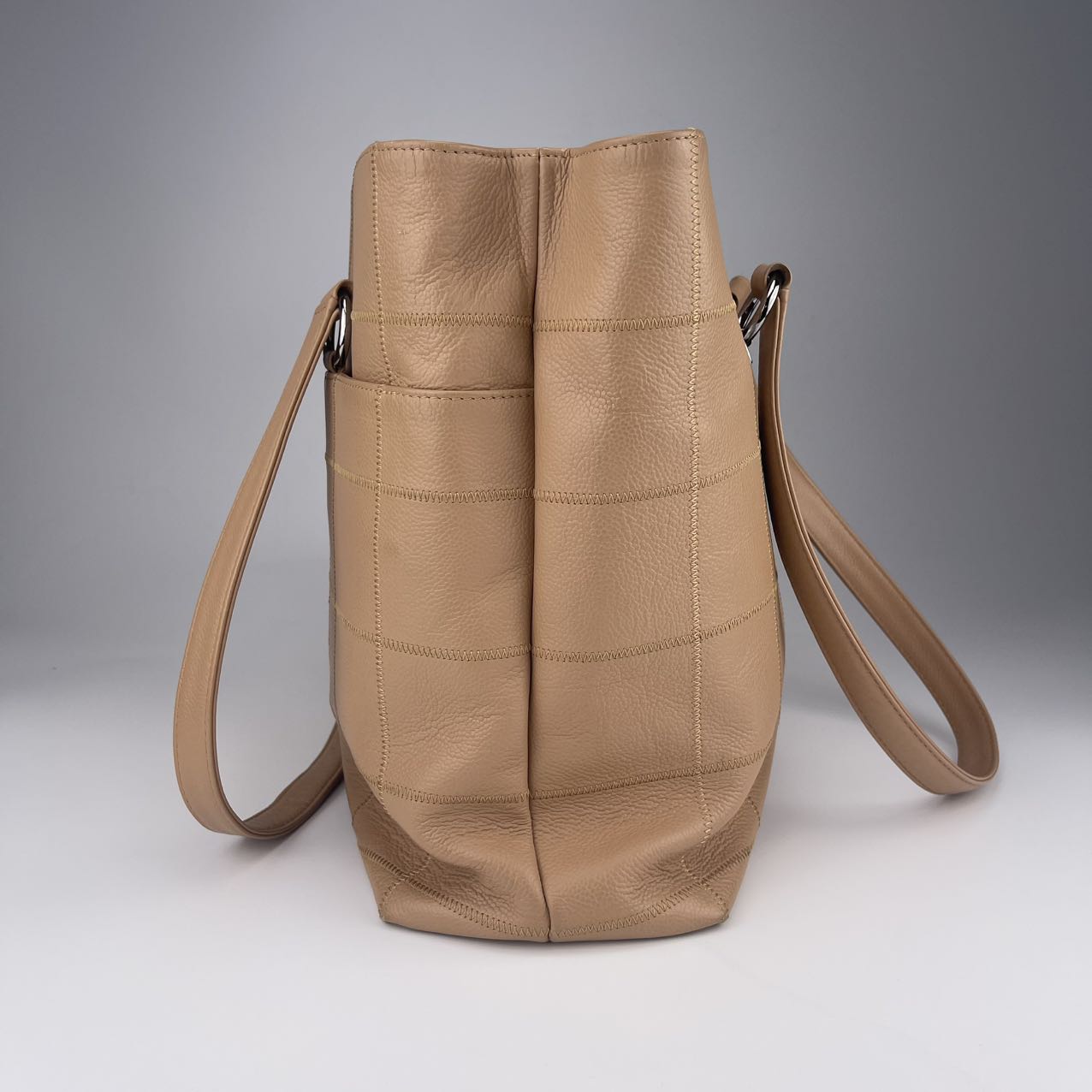 Hardware: Silver-tone hardware, offering a sleek, modern contrast to the gentle beige leather.