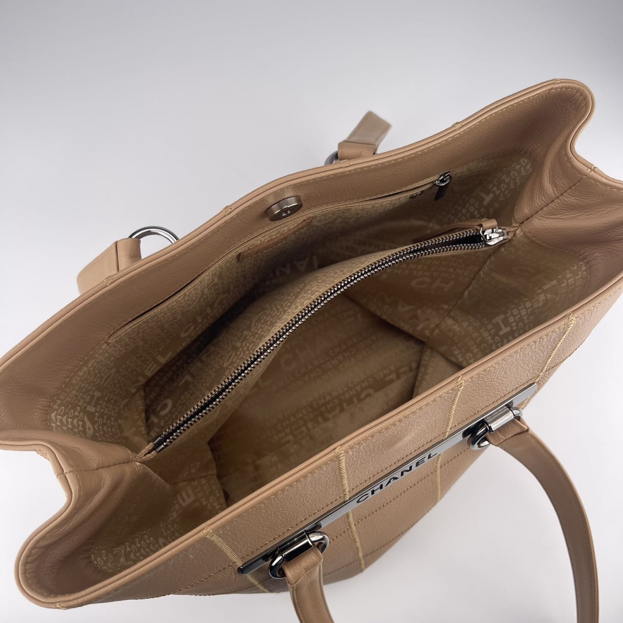 Specifications: Chanel Ice Cube tote in a rare milk tea beige calfskin. Features the signature geometric paneling, top zipper closure, and dual leather handles for shoulder or hand carry. Spacious and structured — perfect for daily use, work, or stylish weekend outings.