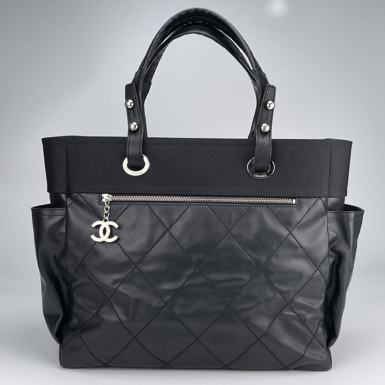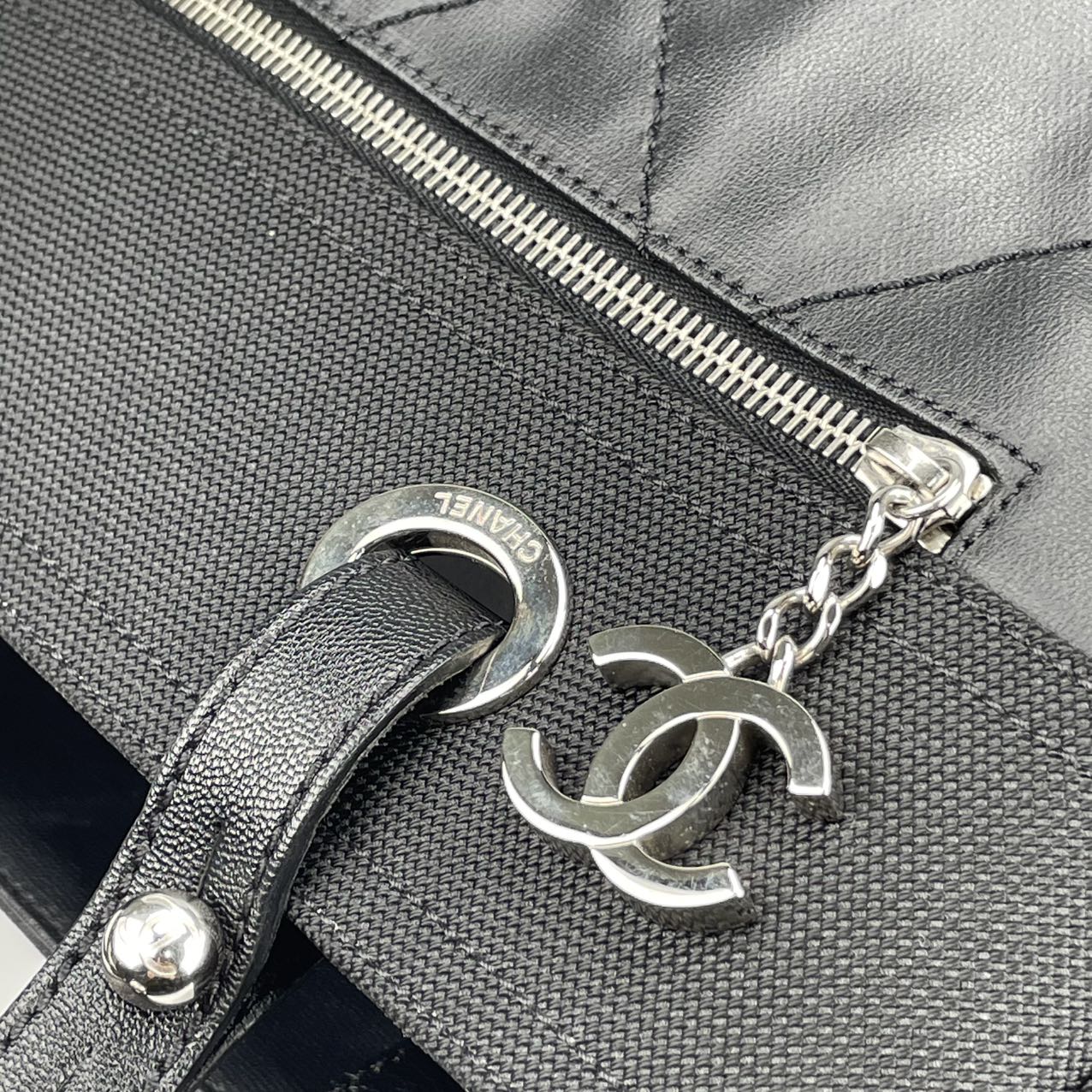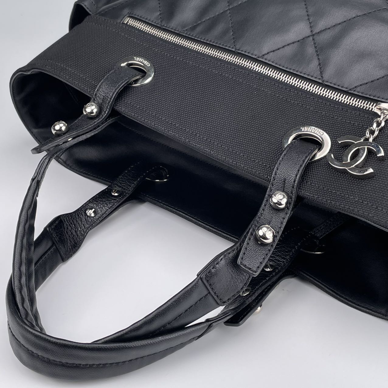 Spacious and elegant Chanel Paris-Biarritz GM tote bag, crafted in black canvas with refined calfskin leather accents.