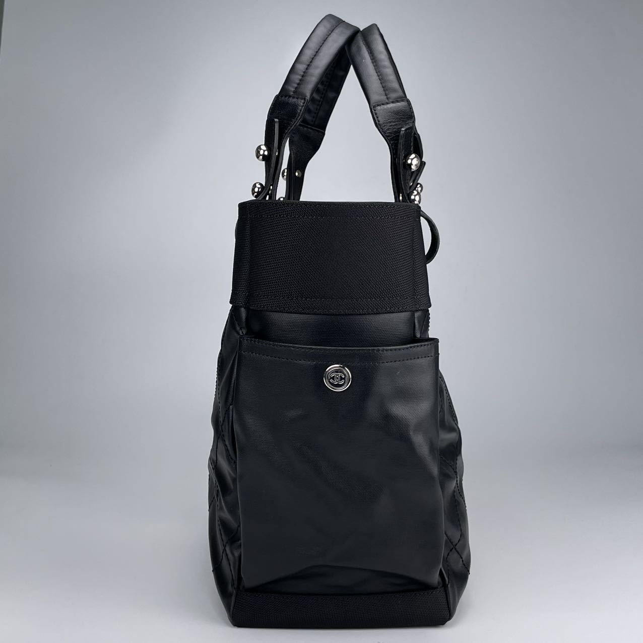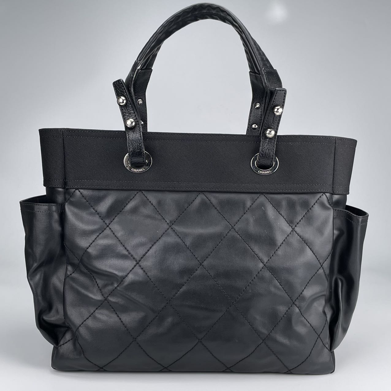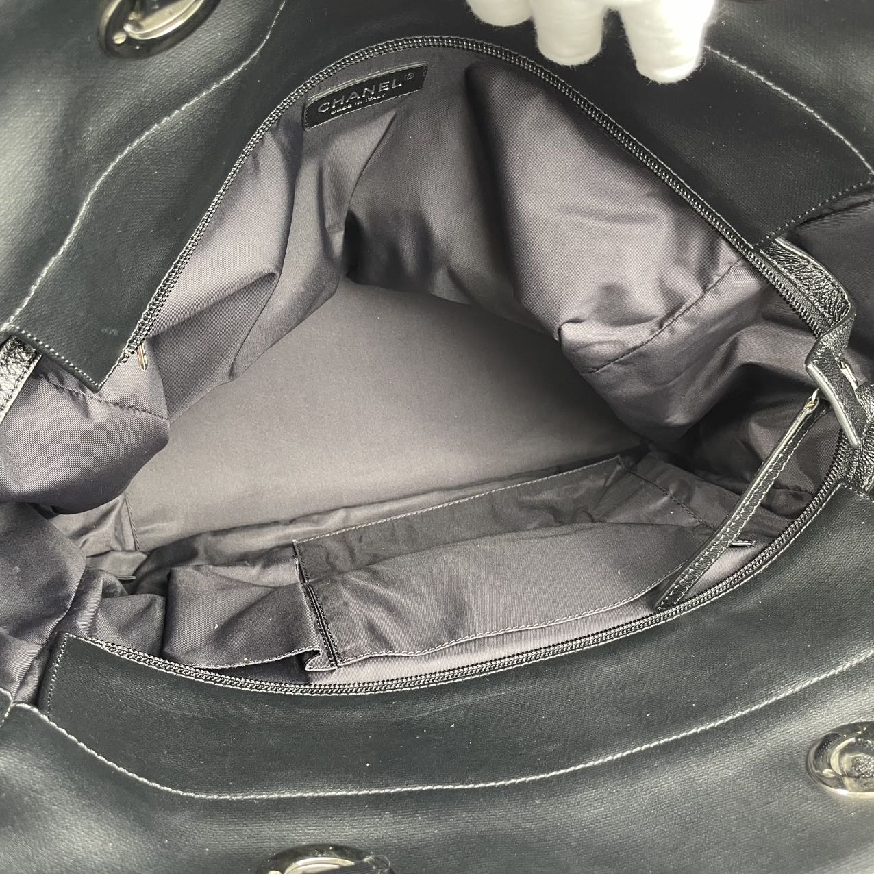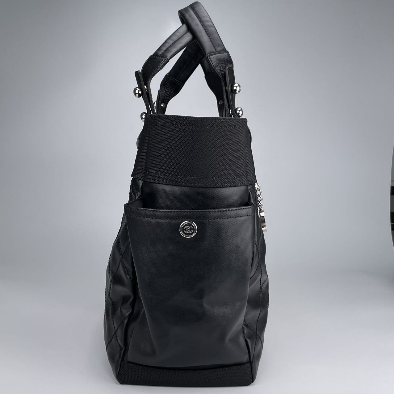 Spacious and elegant Chanel Paris-Biarritz GM tote bag, crafted in black canvas with refined calfskin leather accents.