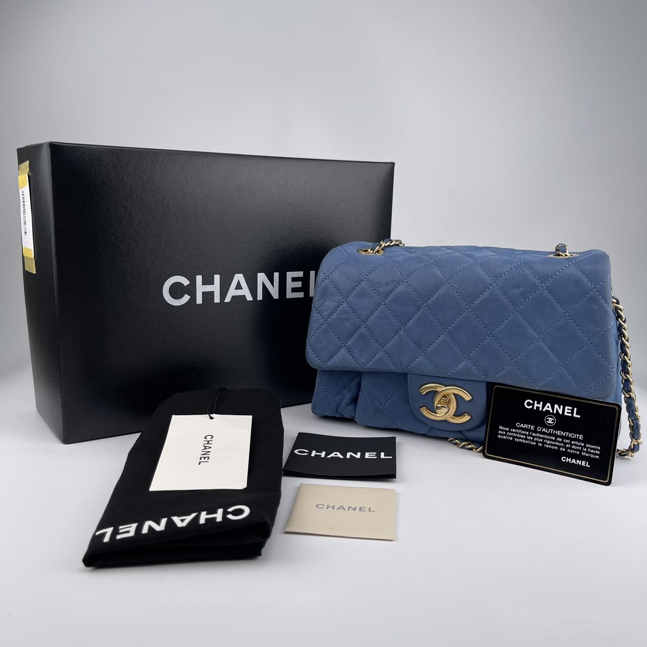 This pre-loved item carries visible signs of use, but these slight imperfections do not detract from its charm. The pearl blue leather gives it a unique and elegant look, and the full set makes it a great addition to any collection. Purchasing this item promotes sustainability and allows you to own a timeless Chanel piece.