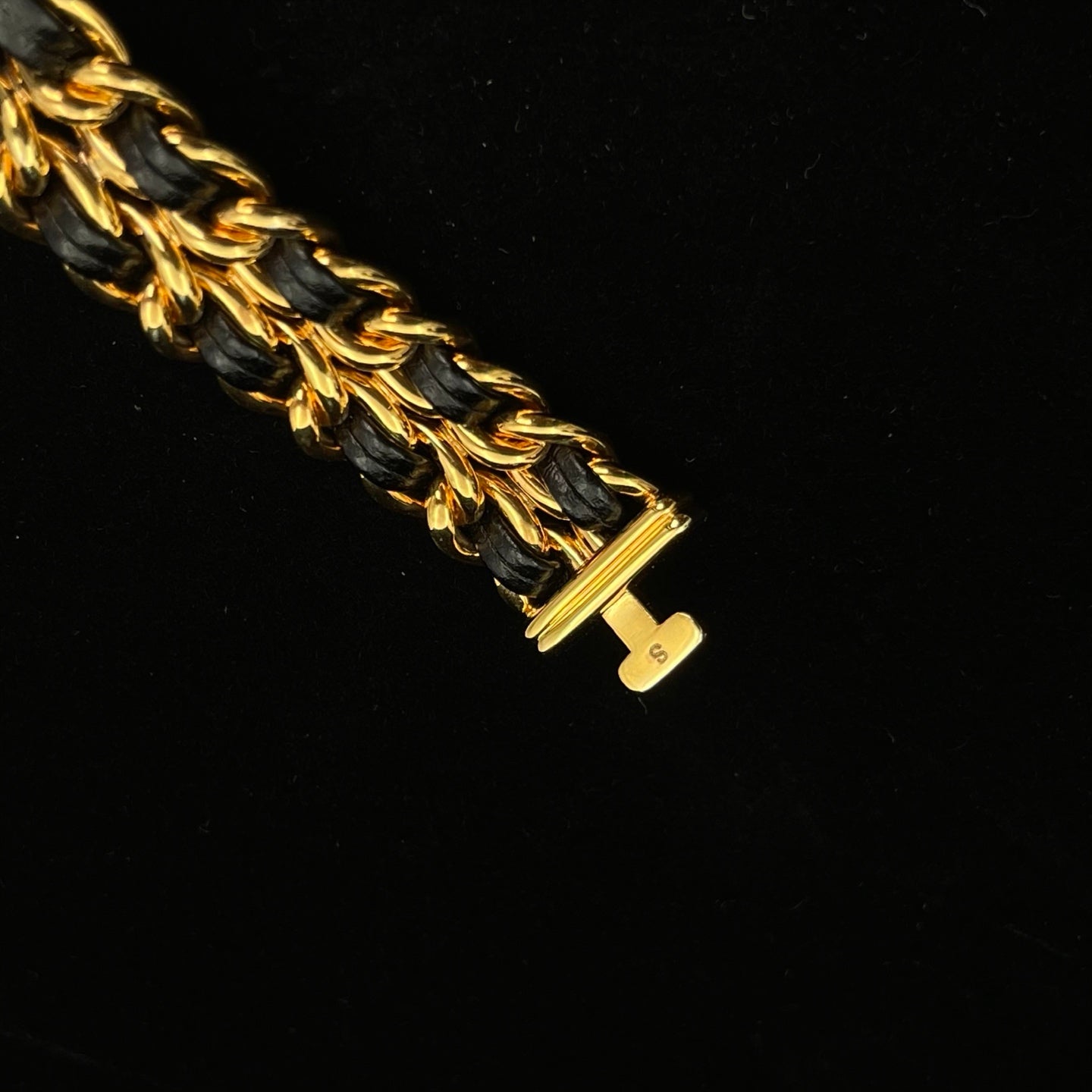 The watch features a classic black leather strap interwoven with a gold-tone chain, giving it a jewelry-like appearance that seamlessly blends watchmaking with CHANEL’s signature elegance. Sophisticated yet versatile, this piece is suitable for both daily wear and formal occasions.