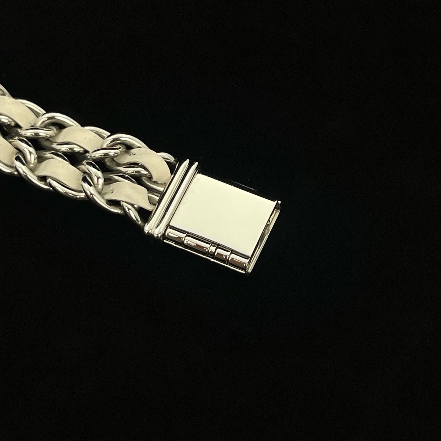 The dial is crafted from white mother-of-pearl, offering a natural iridescent sheen that subtly changes under different lighting. Paired with polished silver-tone hardware and the signature chain-style bracelet interwoven with leather, the watch embodies Chanel’s refined balance between fashion and horology.