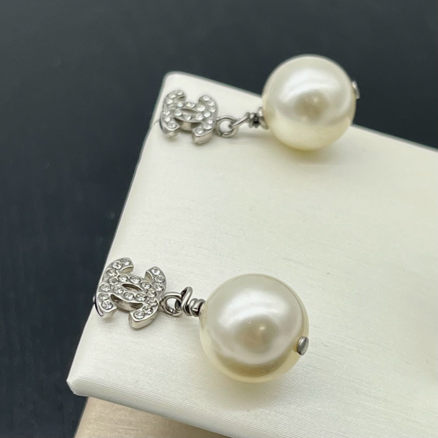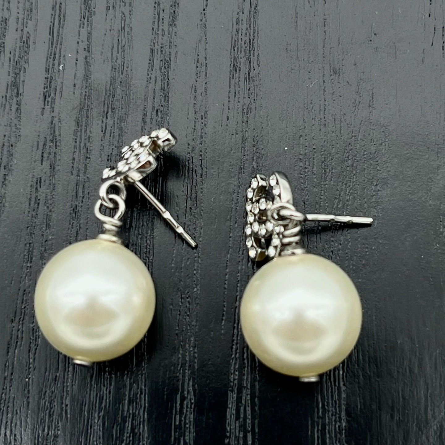 Crafted from silver-tone metal, each earring showcases a crystal-encrusted interlocking CC logo with a large white faux pearl pendant, creating a graceful and luminous effect.
