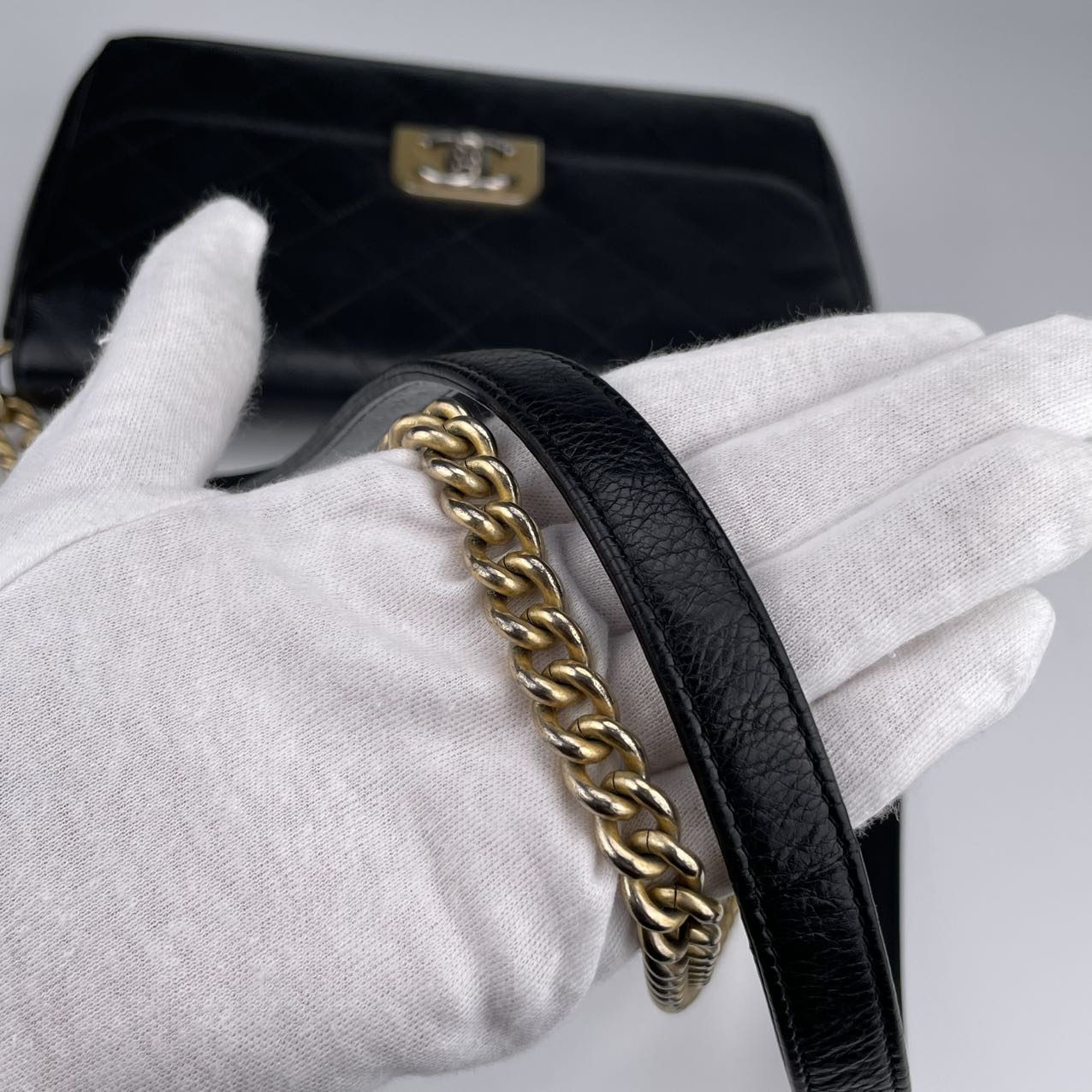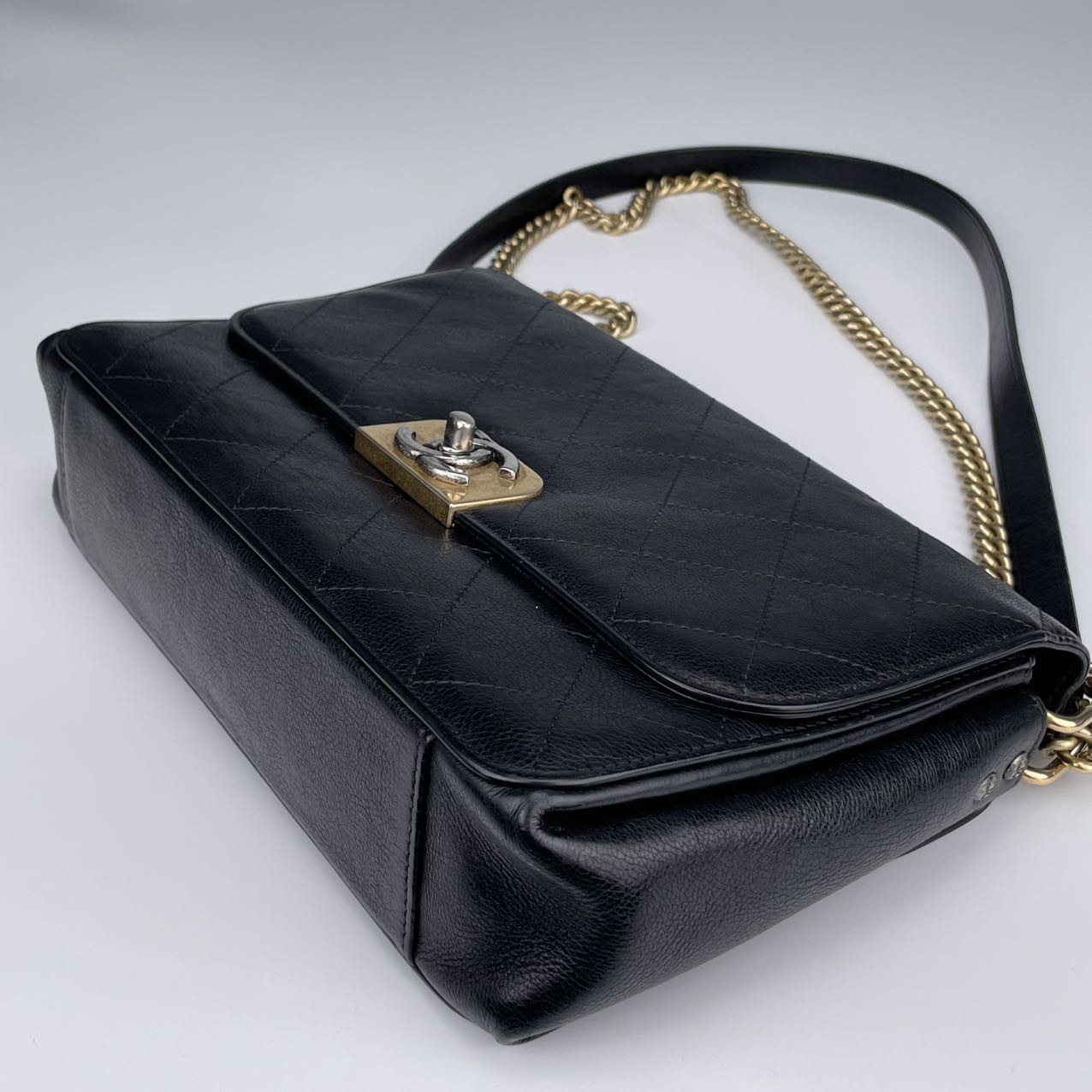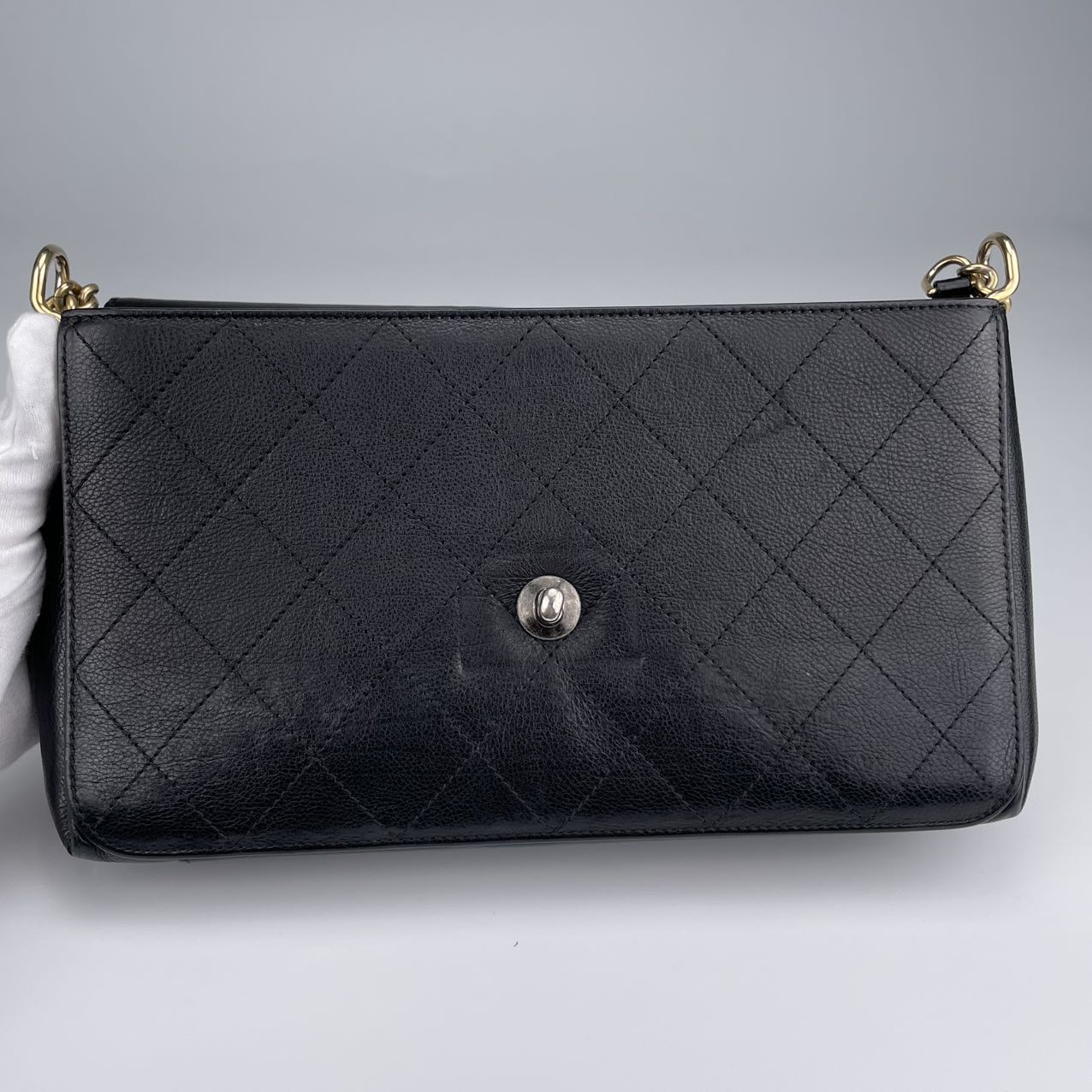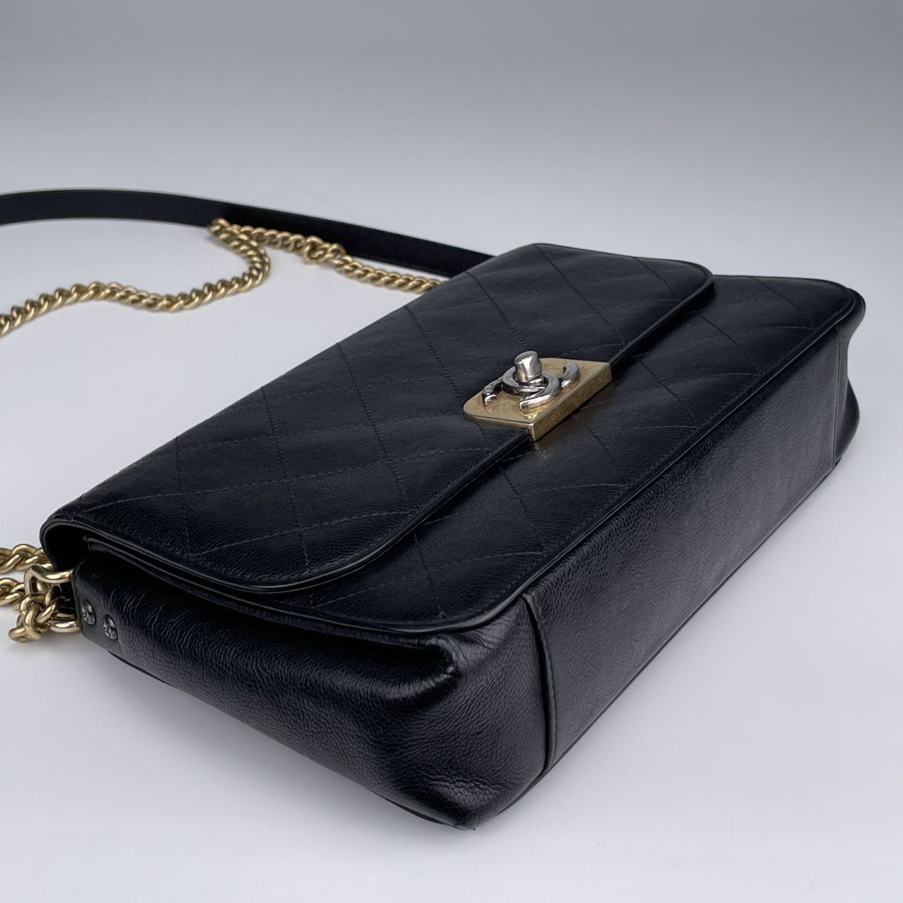 Hardware: Gold-tone turn-lock closure with subtle CC logo detail. The leather-woven chain strap adds classic Chanel elegance.