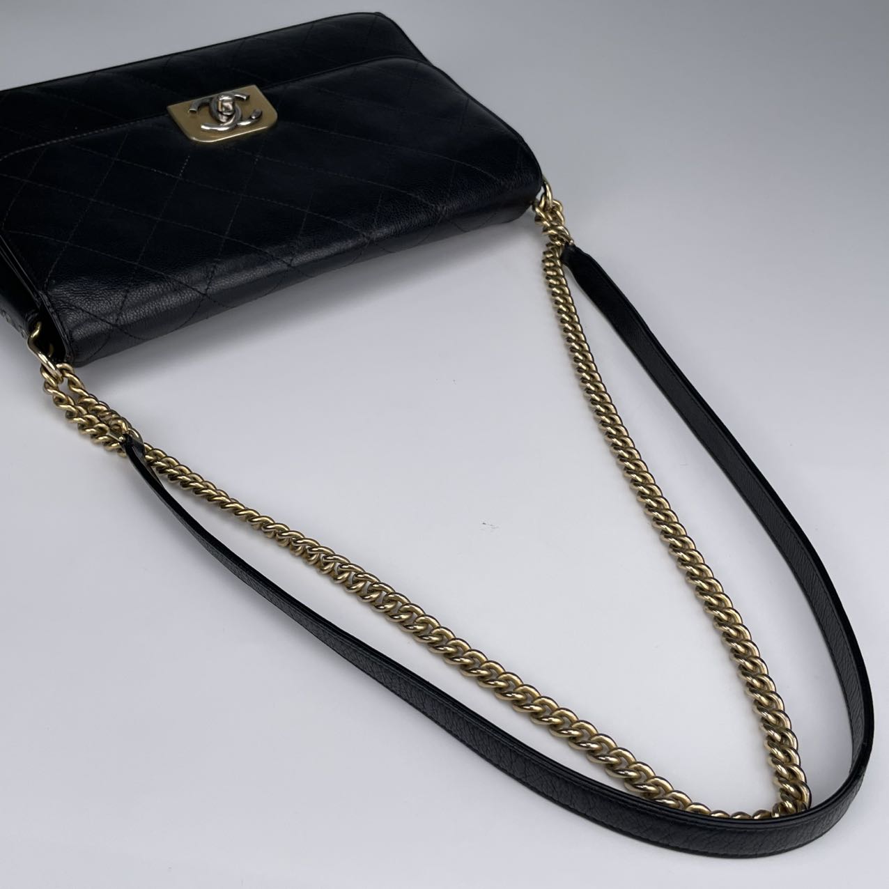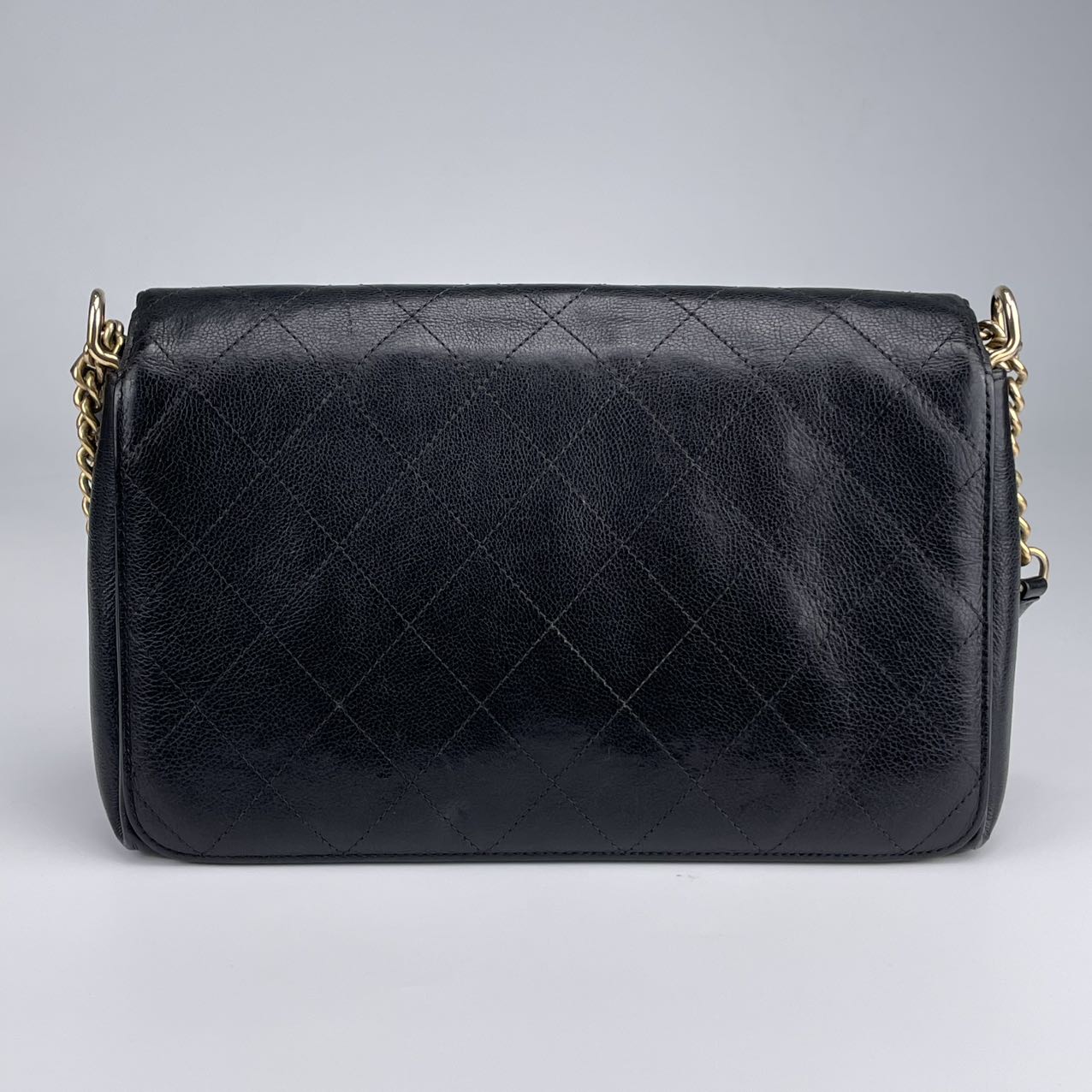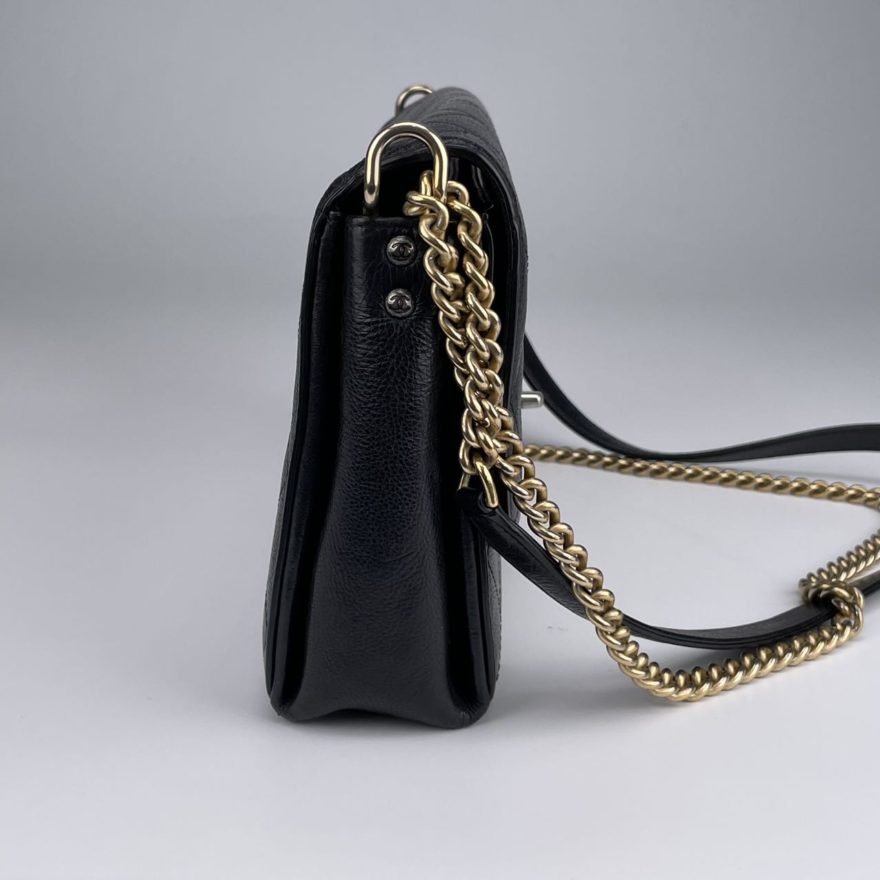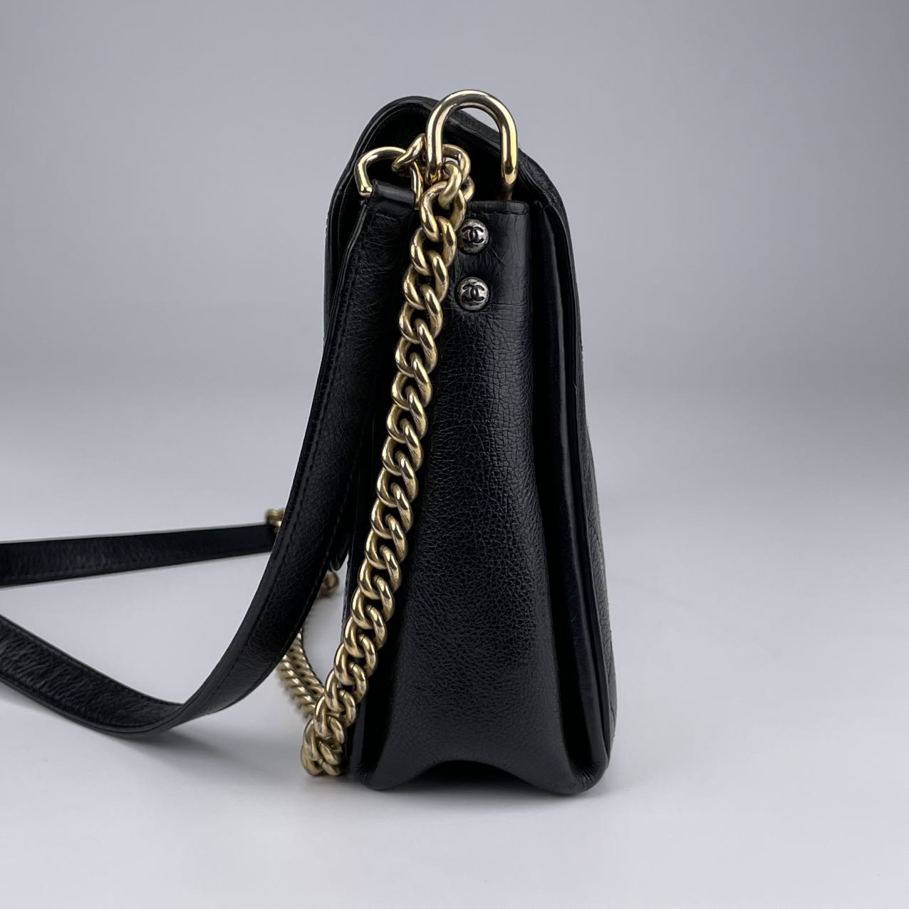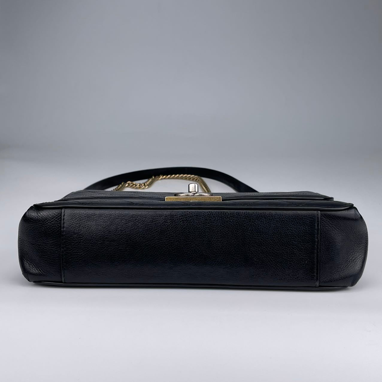 Hardware: Gold-tone turn-lock closure with subtle CC logo detail. The leather-woven chain strap adds classic Chanel elegance.