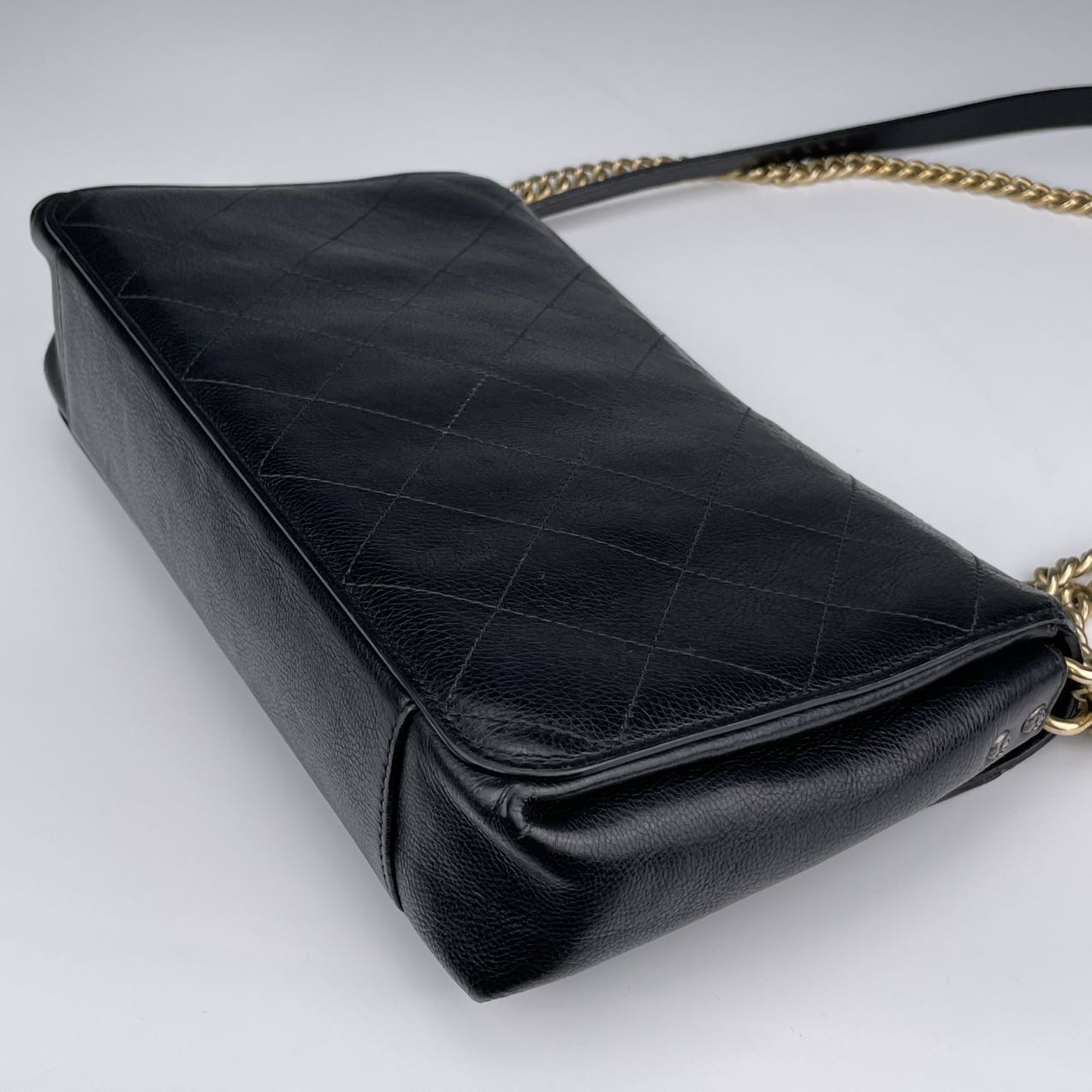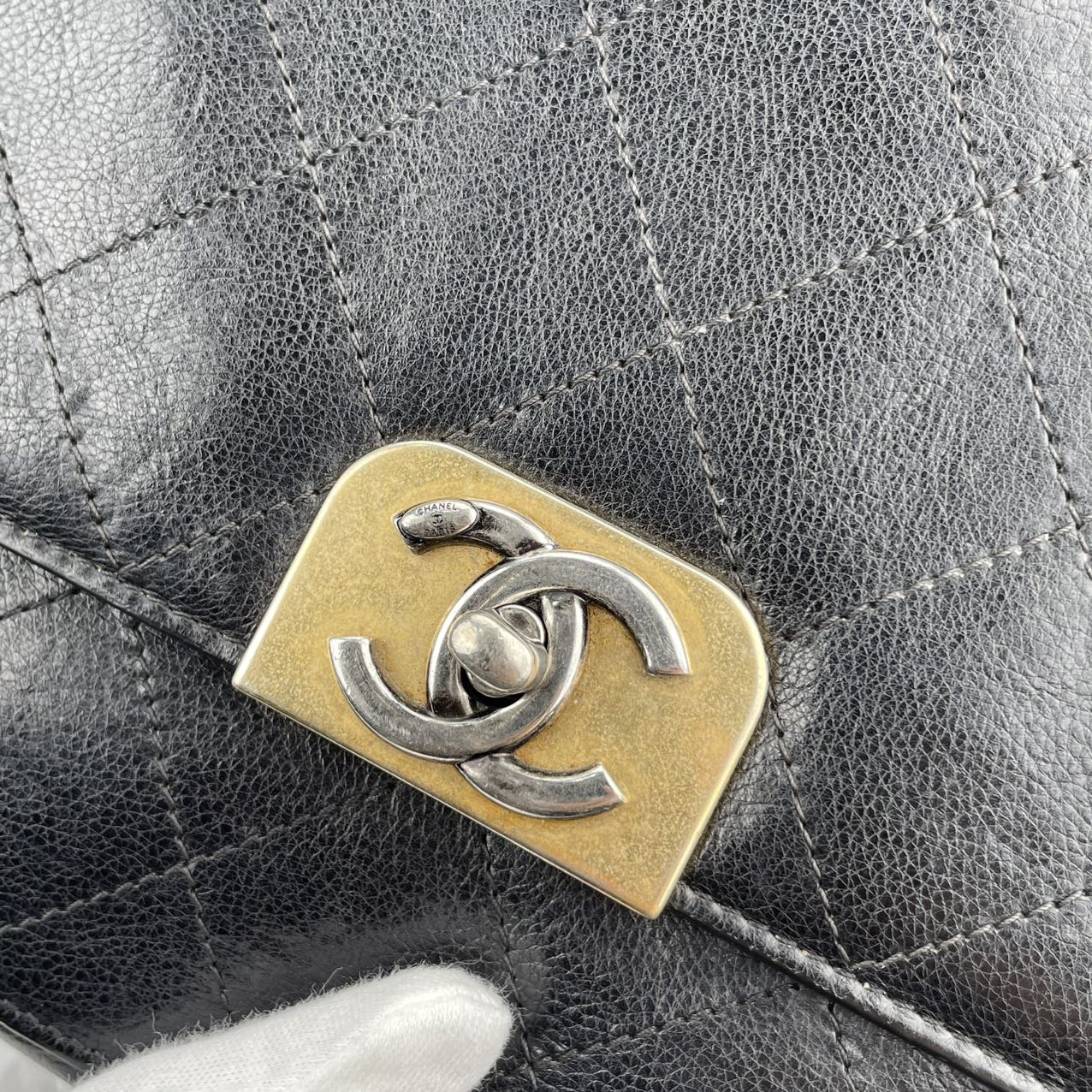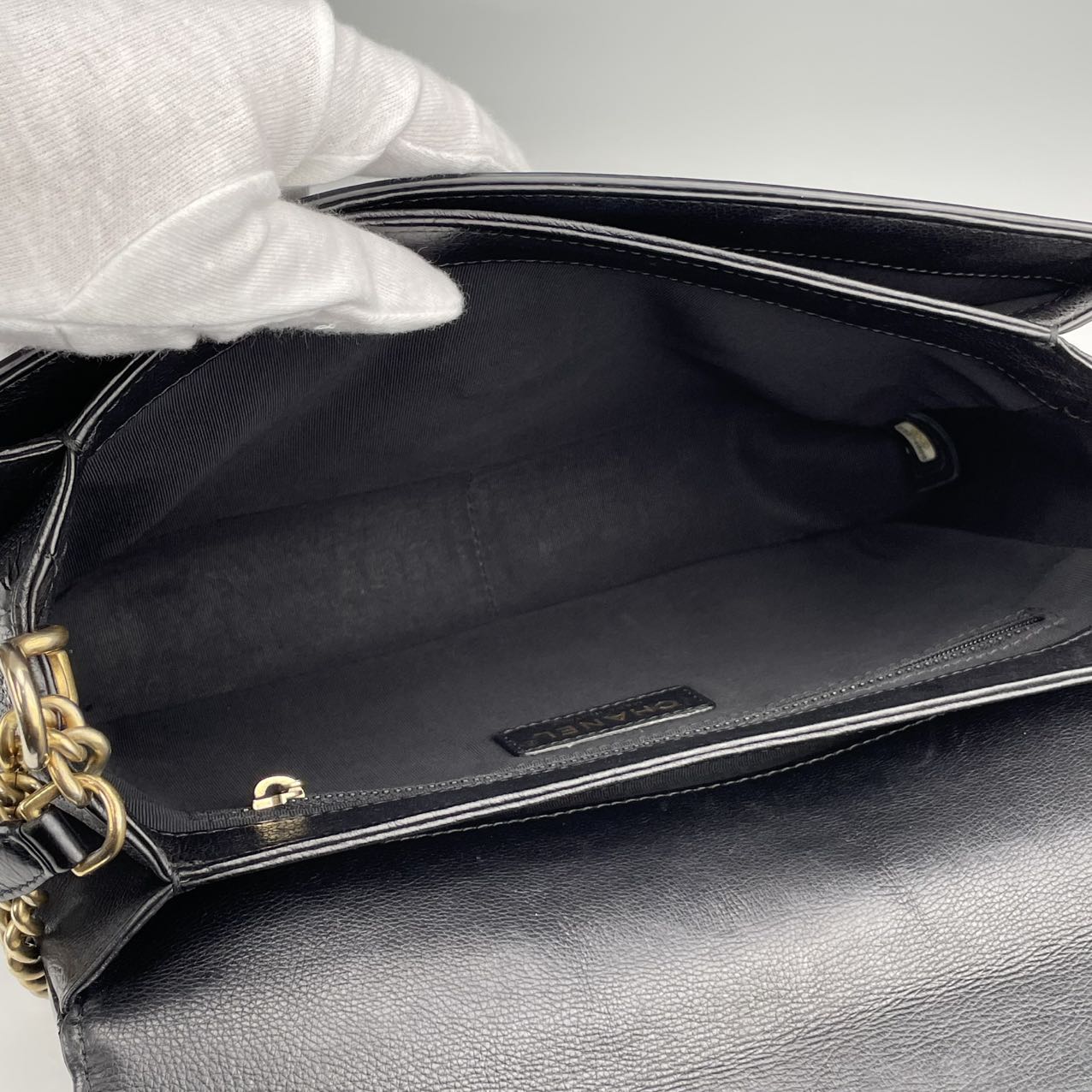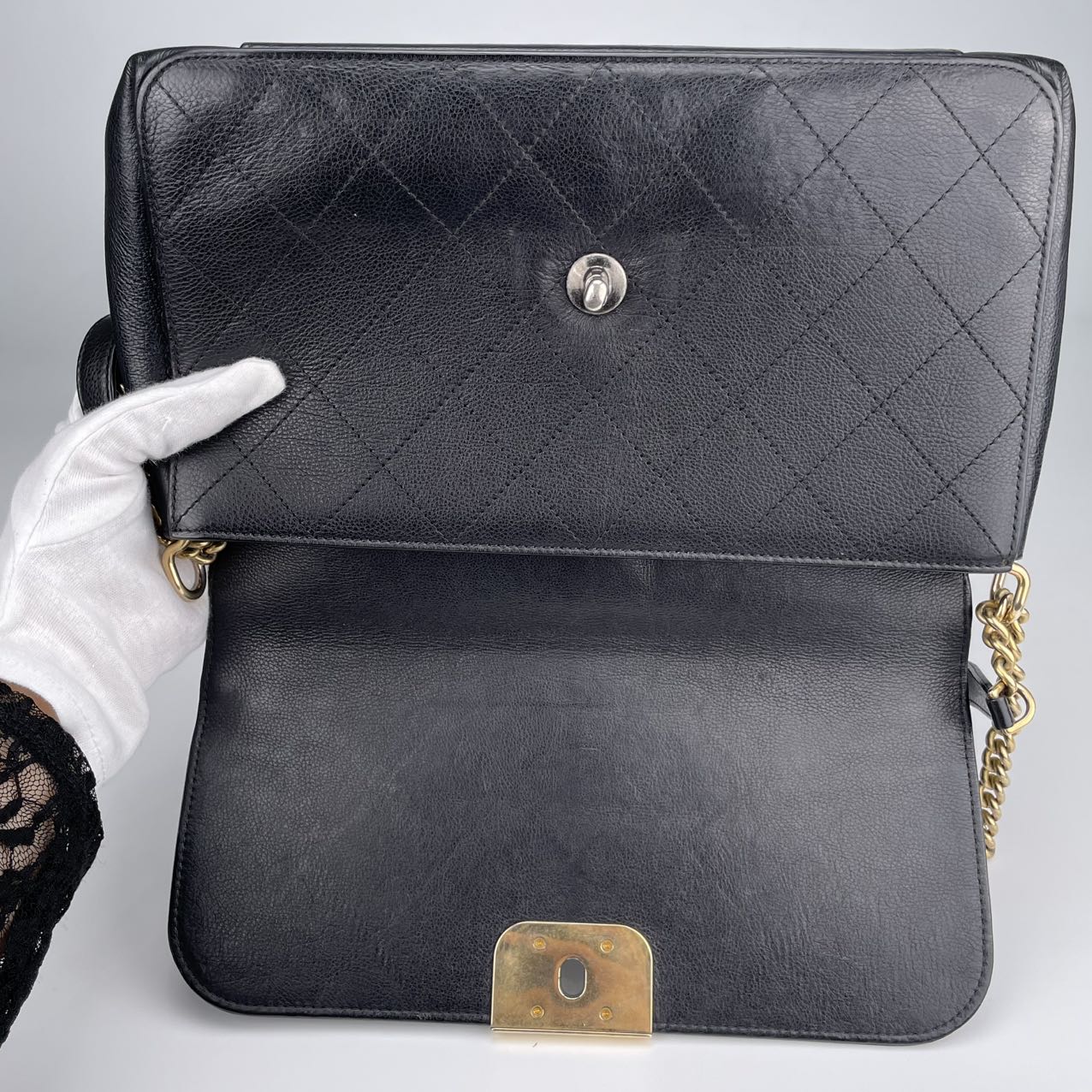 Hardware: Gold-tone turn-lock closure with subtle CC logo detail. The leather-woven chain strap adds classic Chanel elegance.