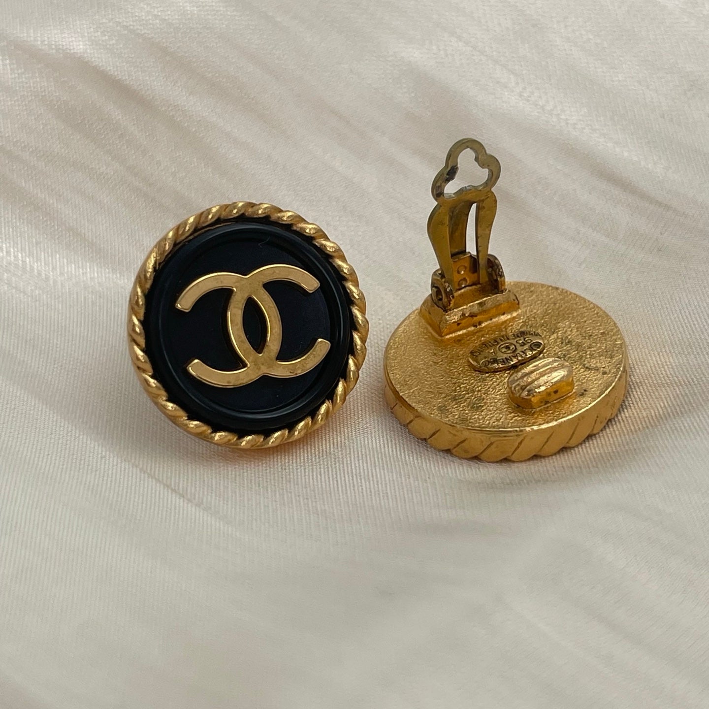 These CHANEL vintage black and gold woven edge CC button clip-on earrings are in good pre-owned condition.