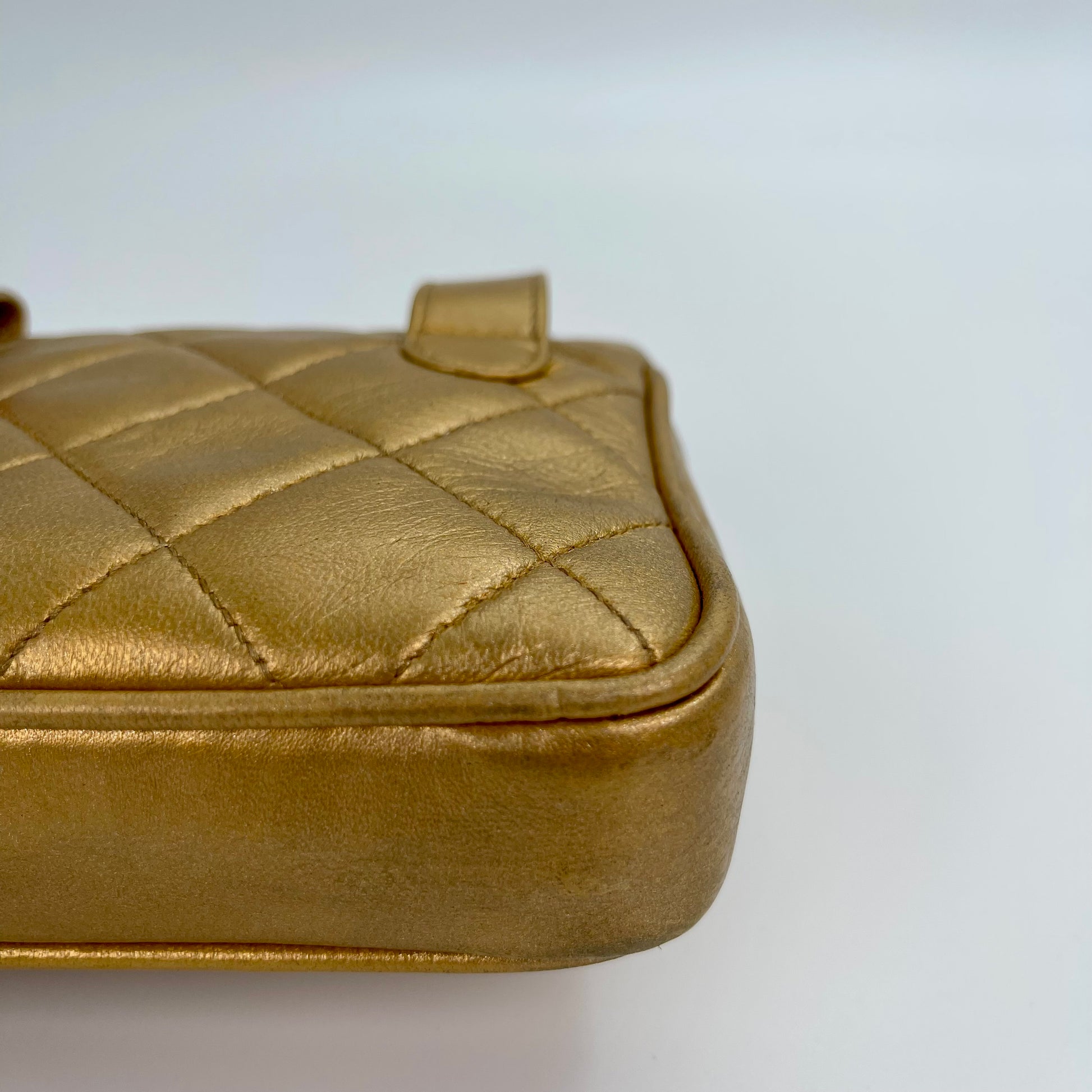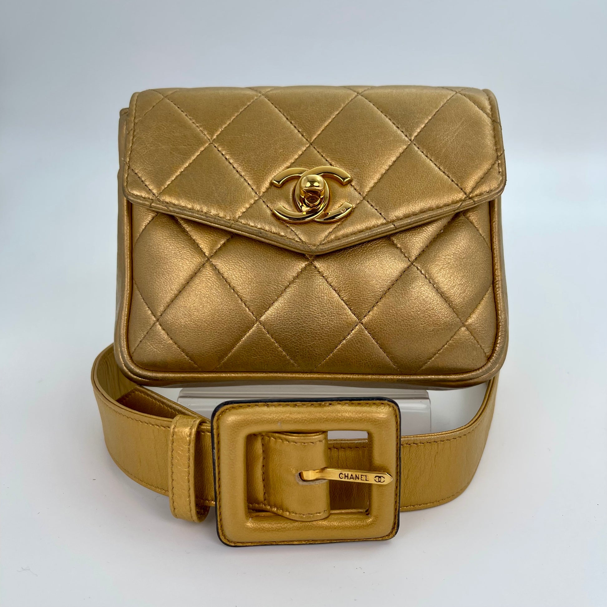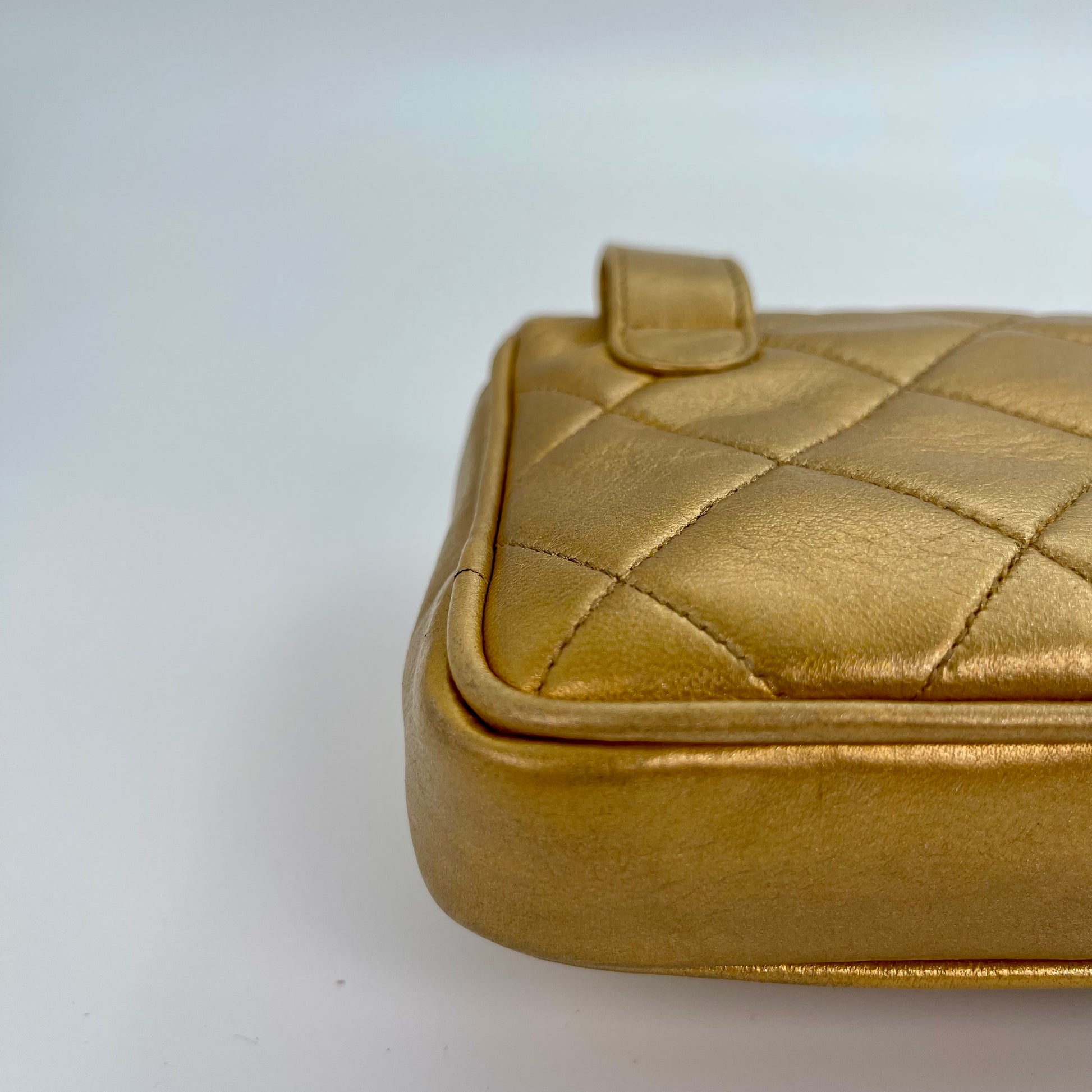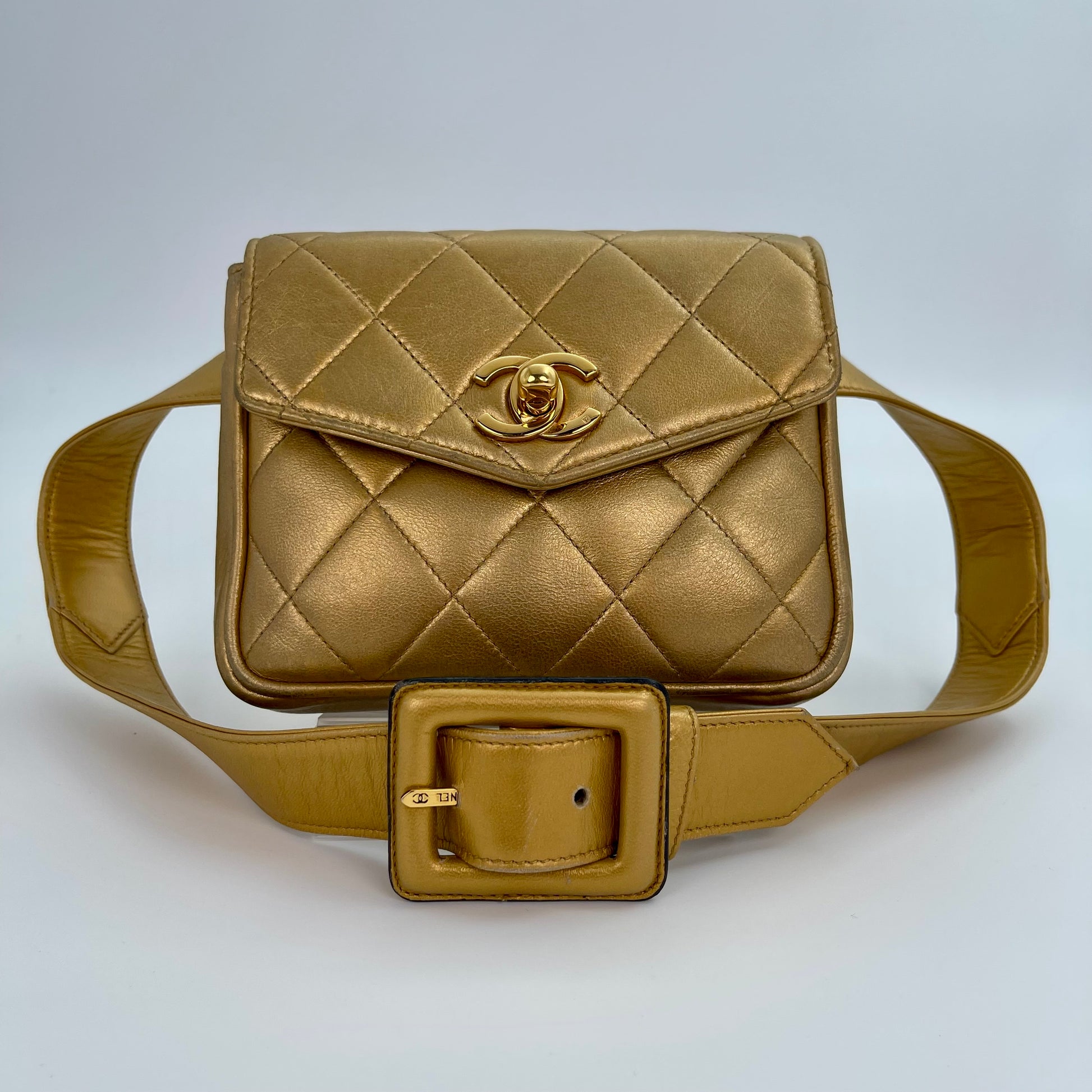 Chic and compact Chanel waist bag in metallic gold lambskin.