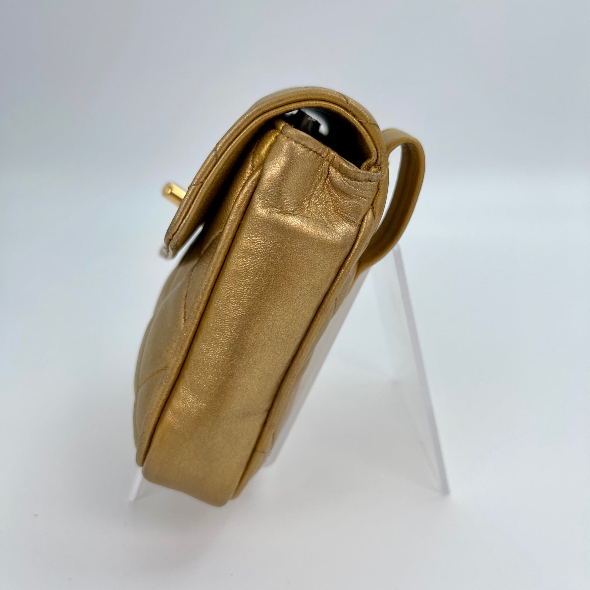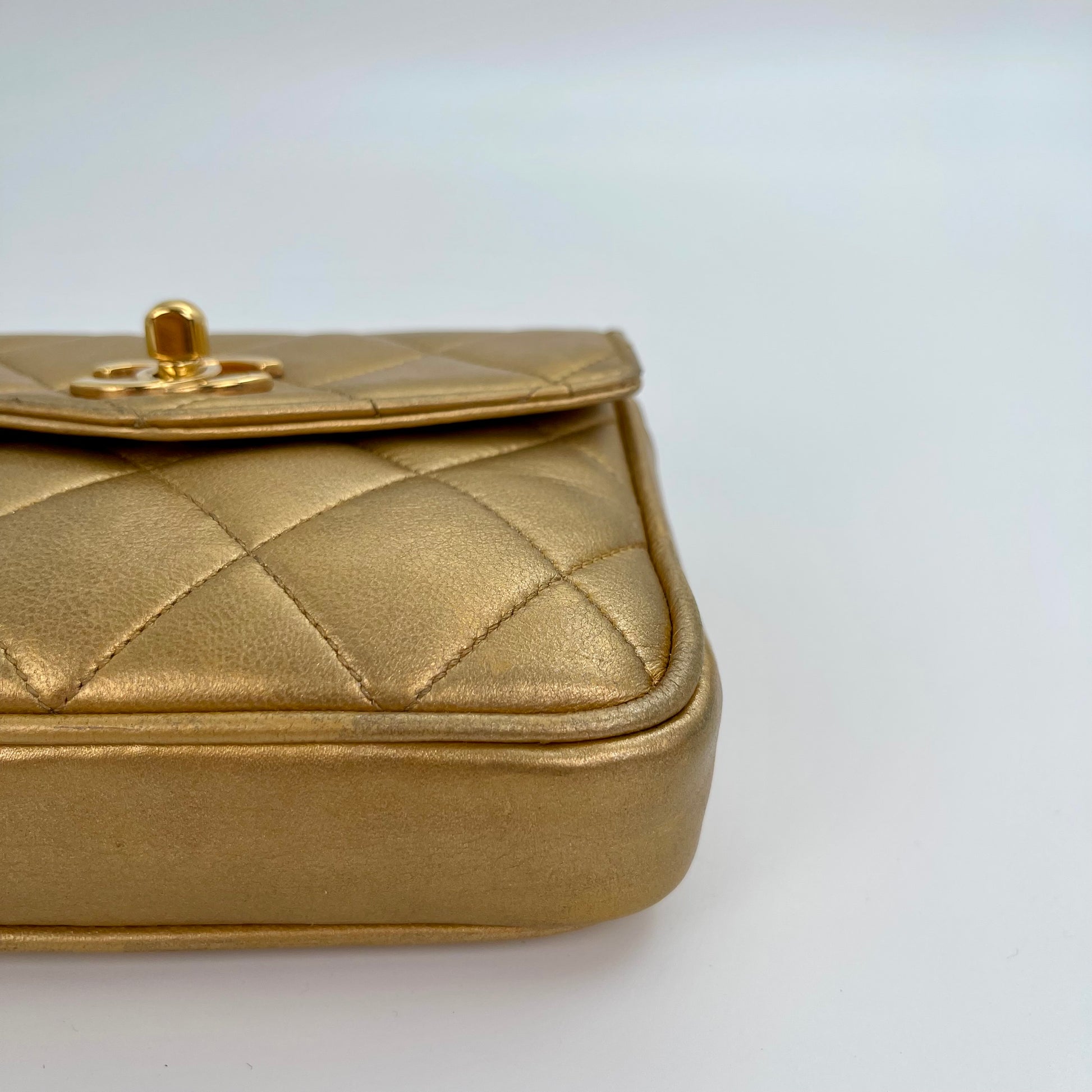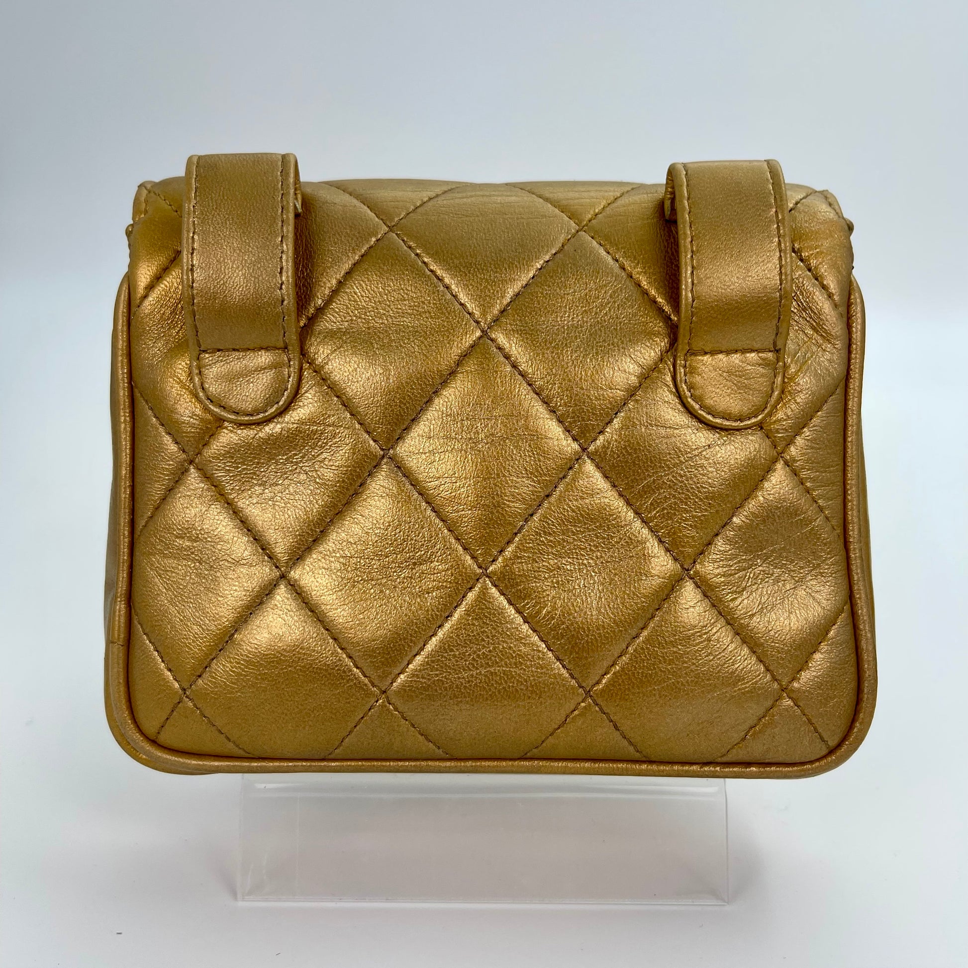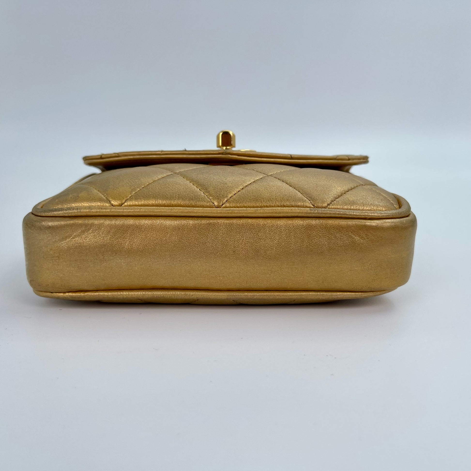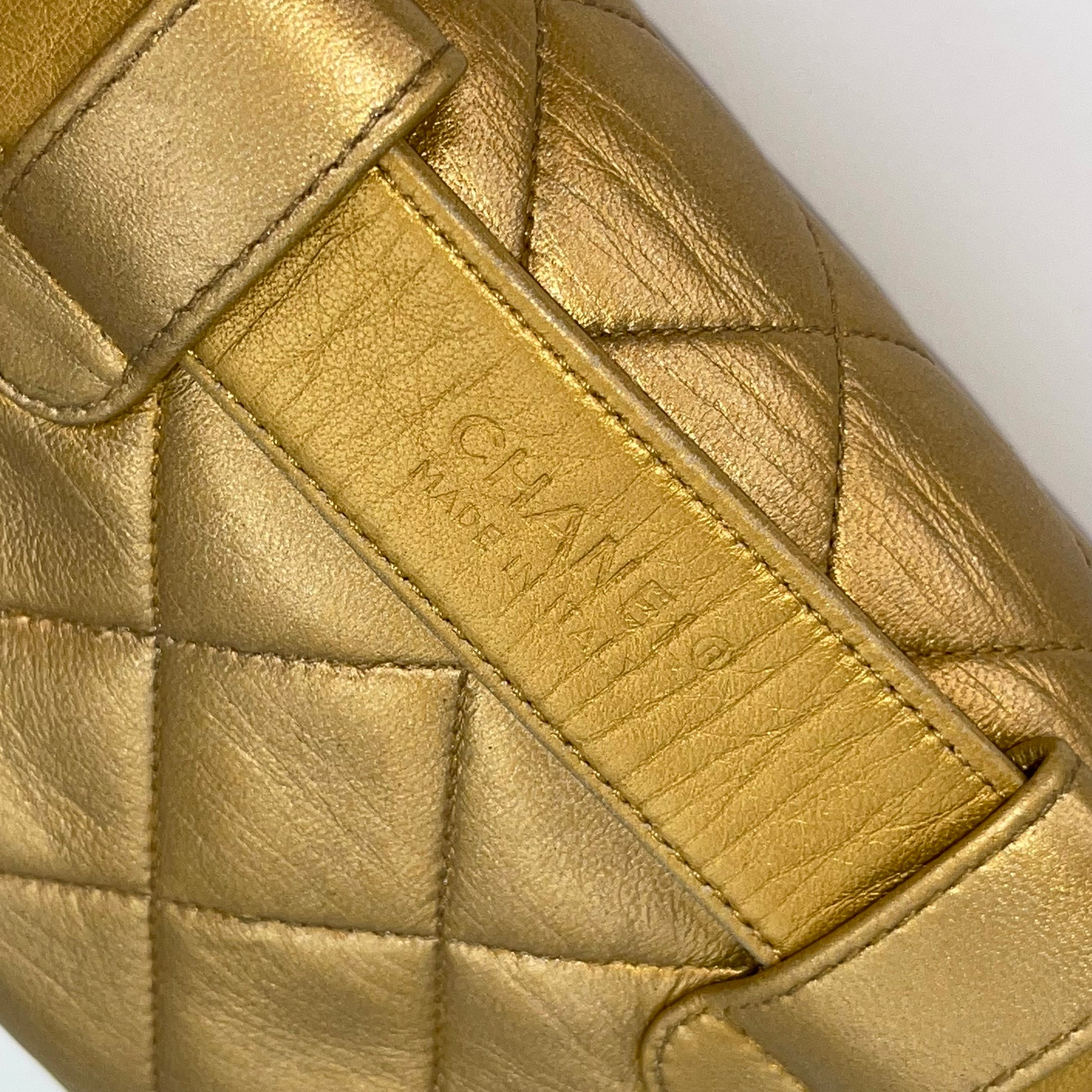 Chic and compact Chanel waist bag in metallic gold lambskin.
