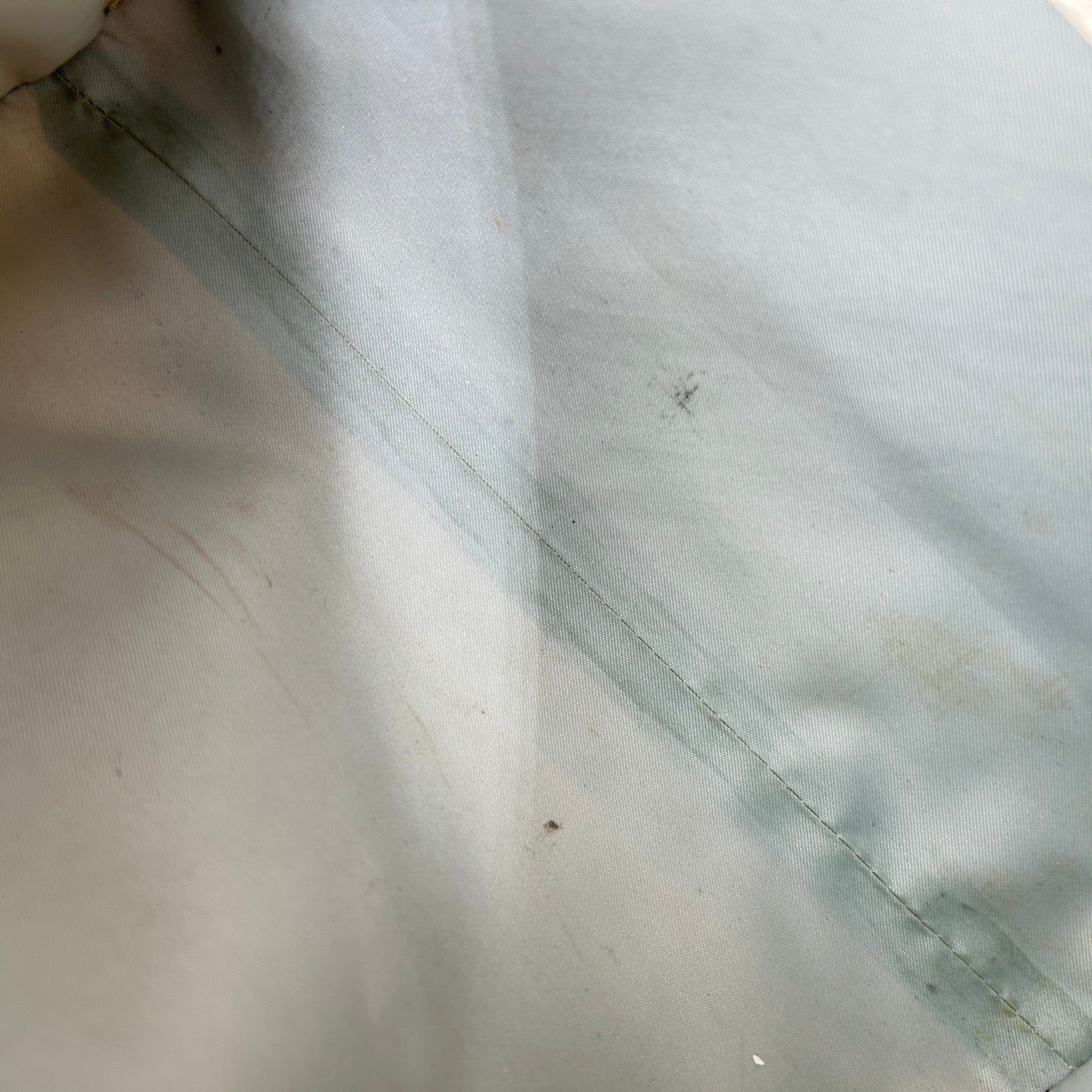 Signs of use are present, including yellowing on the leather trim, minor surface wear, and light discoloration. Hardware shows minimal wear. Overall still in wearable condition.