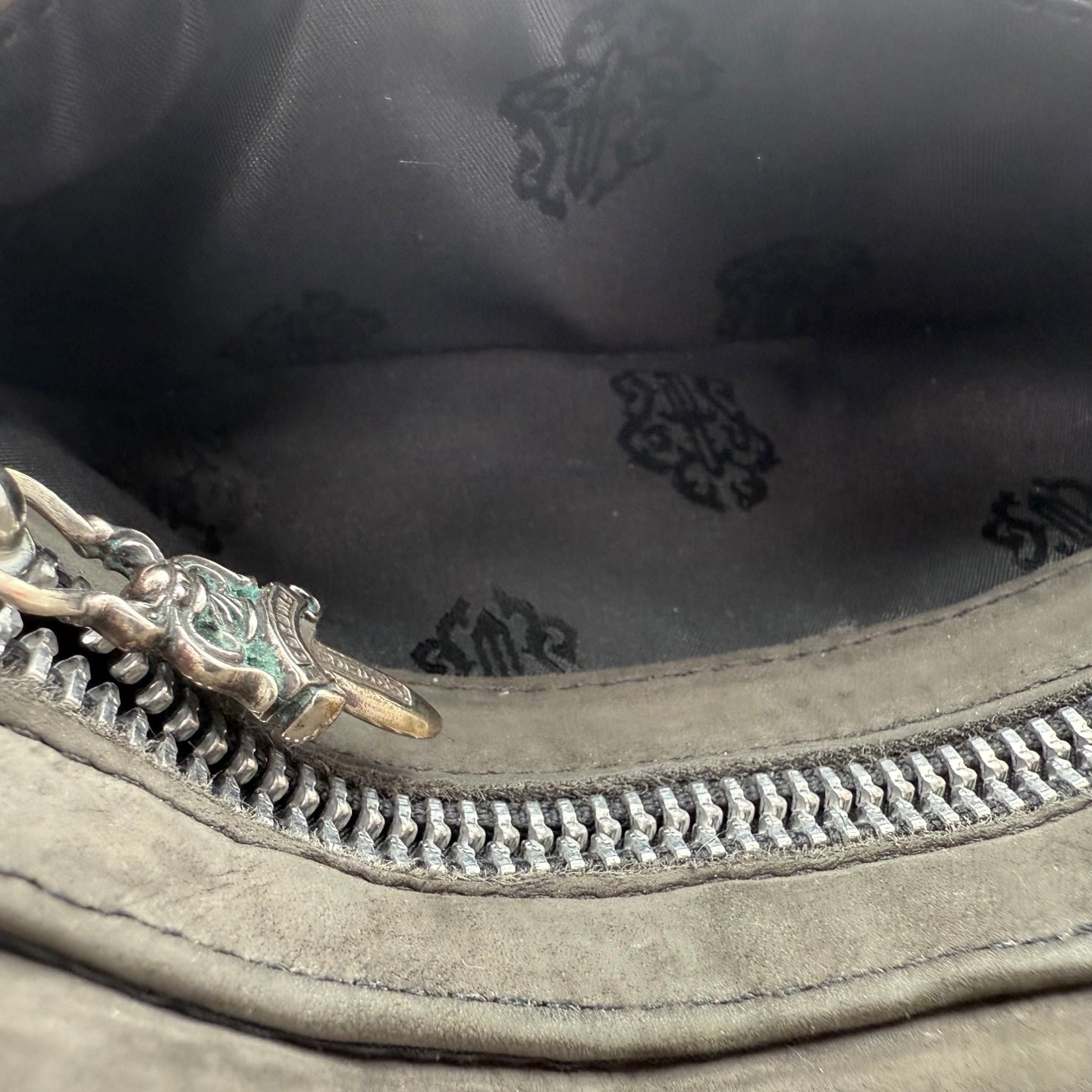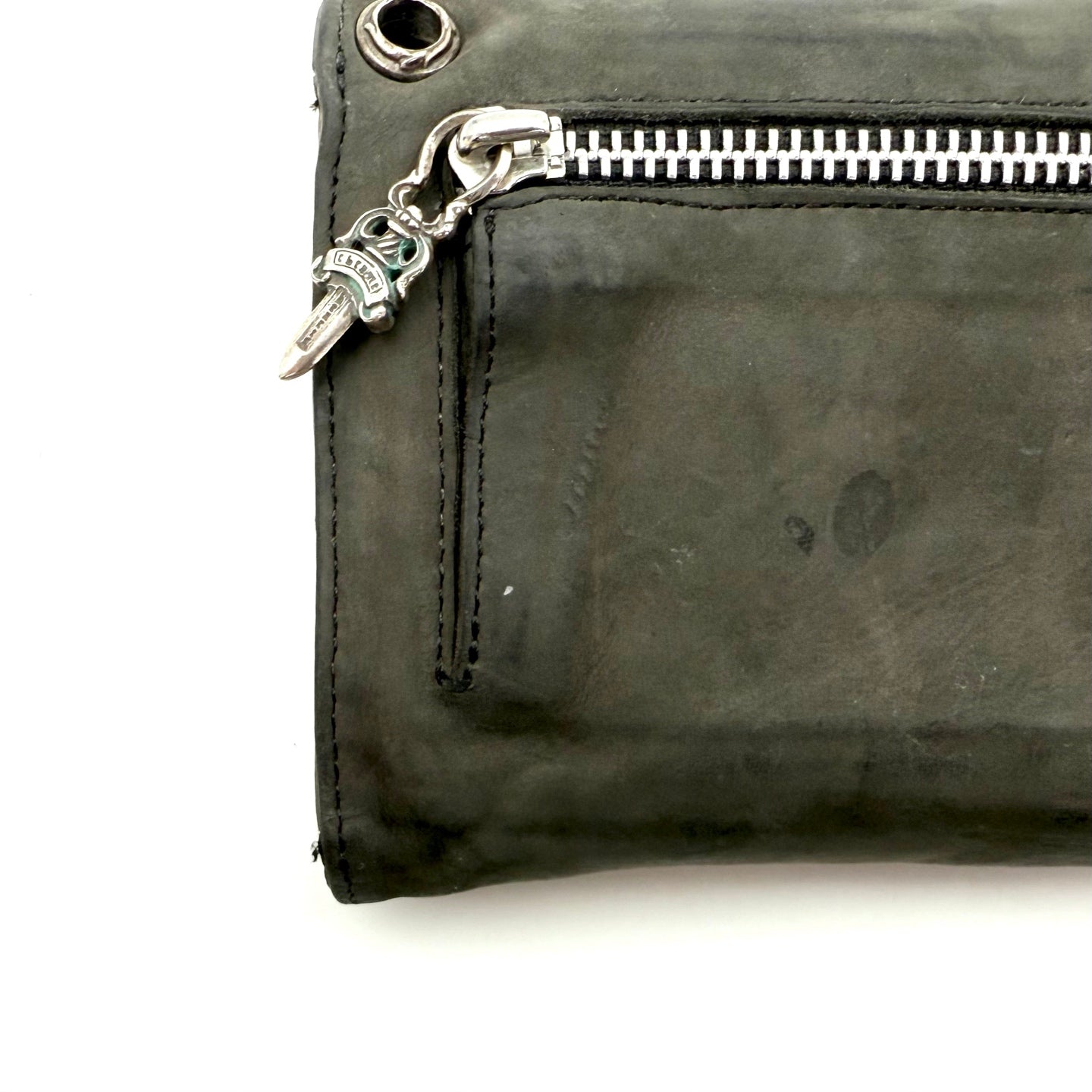 The interior is highly functional, featuring multiple card slots, spacious compartments, and two zippered pockets for secure storage. The zippers are accented with dagger-shaped cross pull charms, adding a distinctive Chrome Hearts detail. Additional practical features include a pen holder and a reinforced eyelet designed for attaching a chain, making this wallet both versatile and practical for daily use.