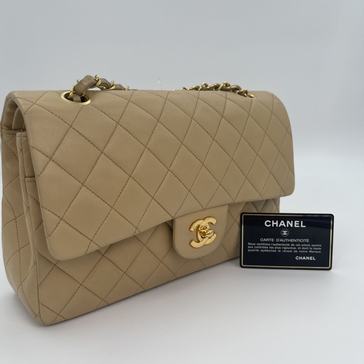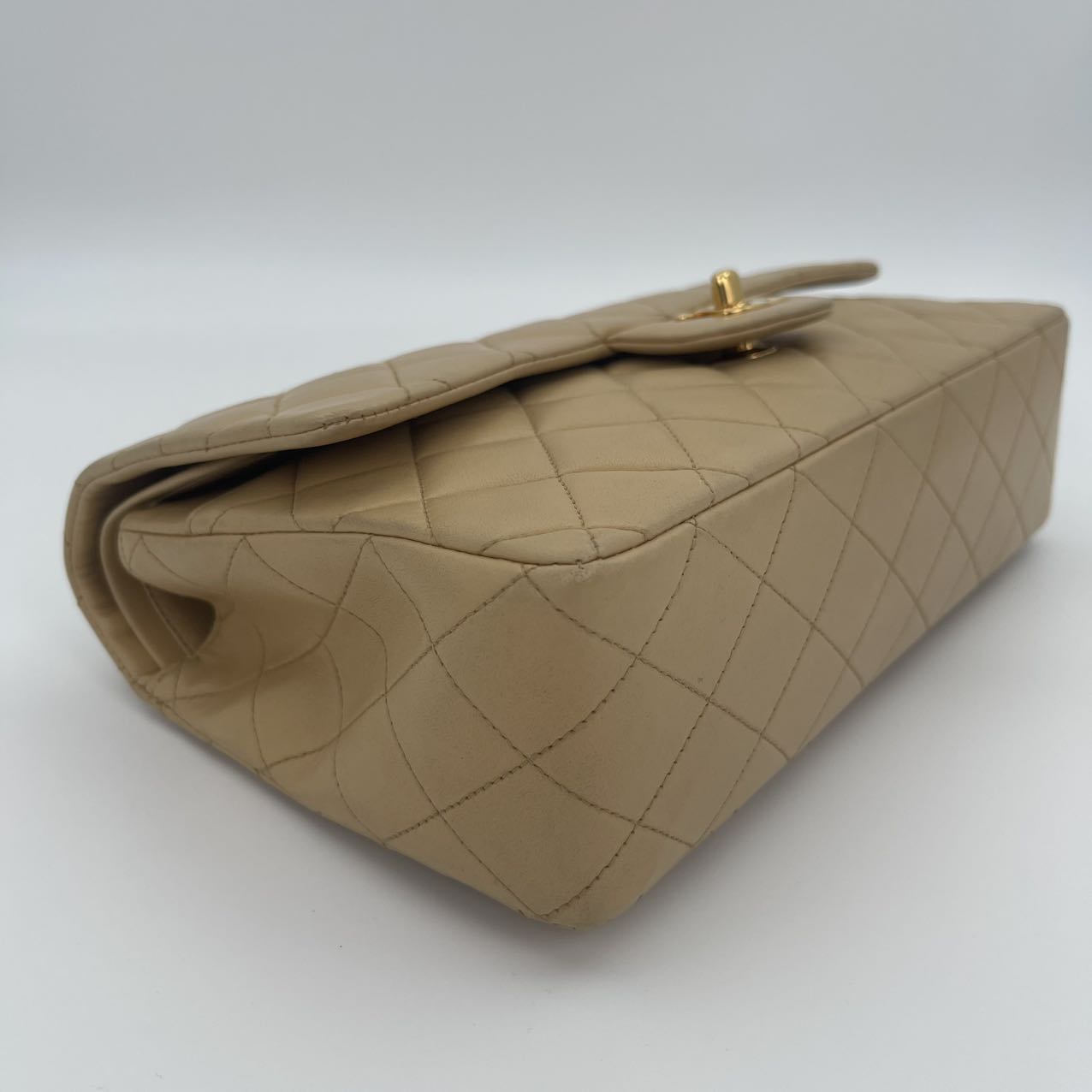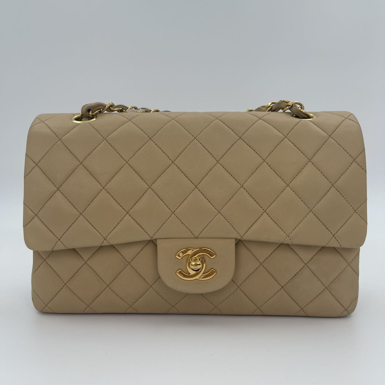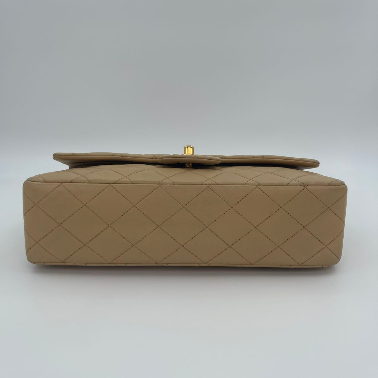 This Chanel Classic Flap Medium 25cm bag in latte lambskin combines classic design with modern sophistication.