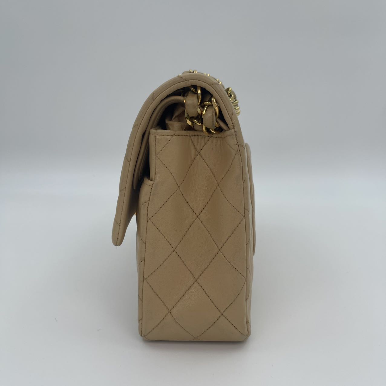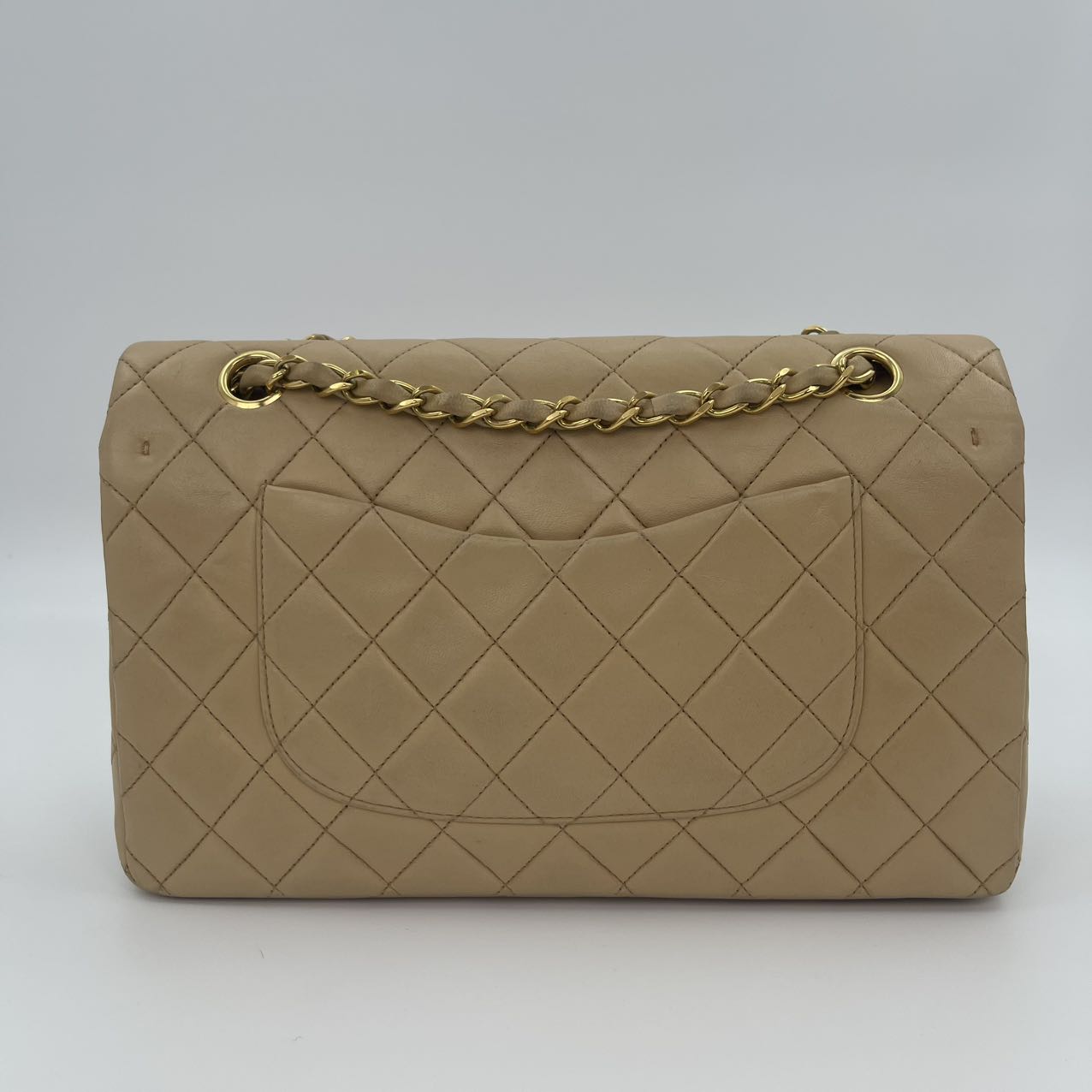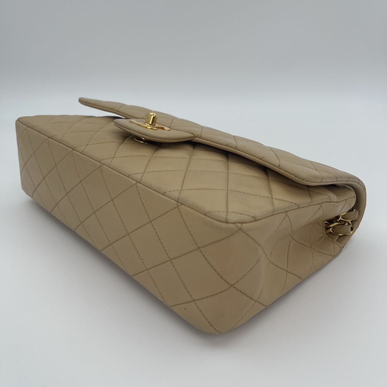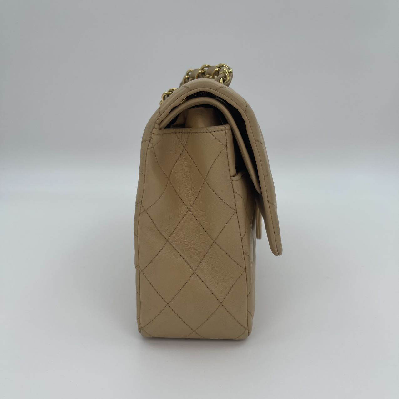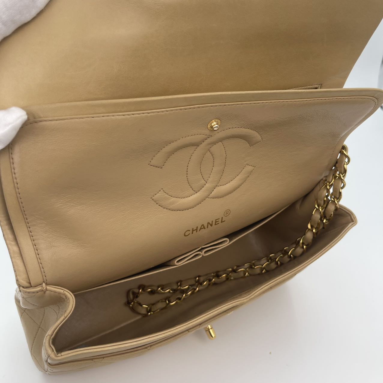 This Chanel Classic Flap Medium 25cm bag in latte lambskin combines classic design with modern sophistication.