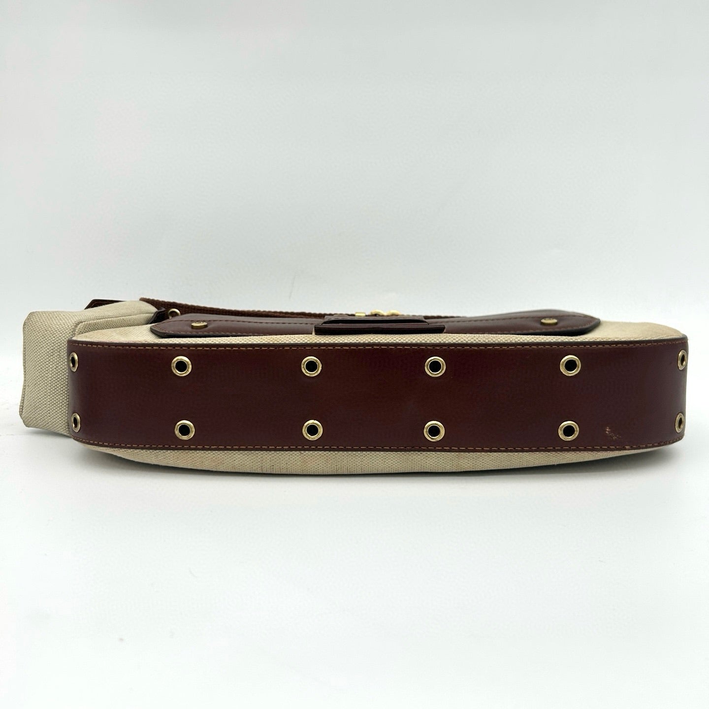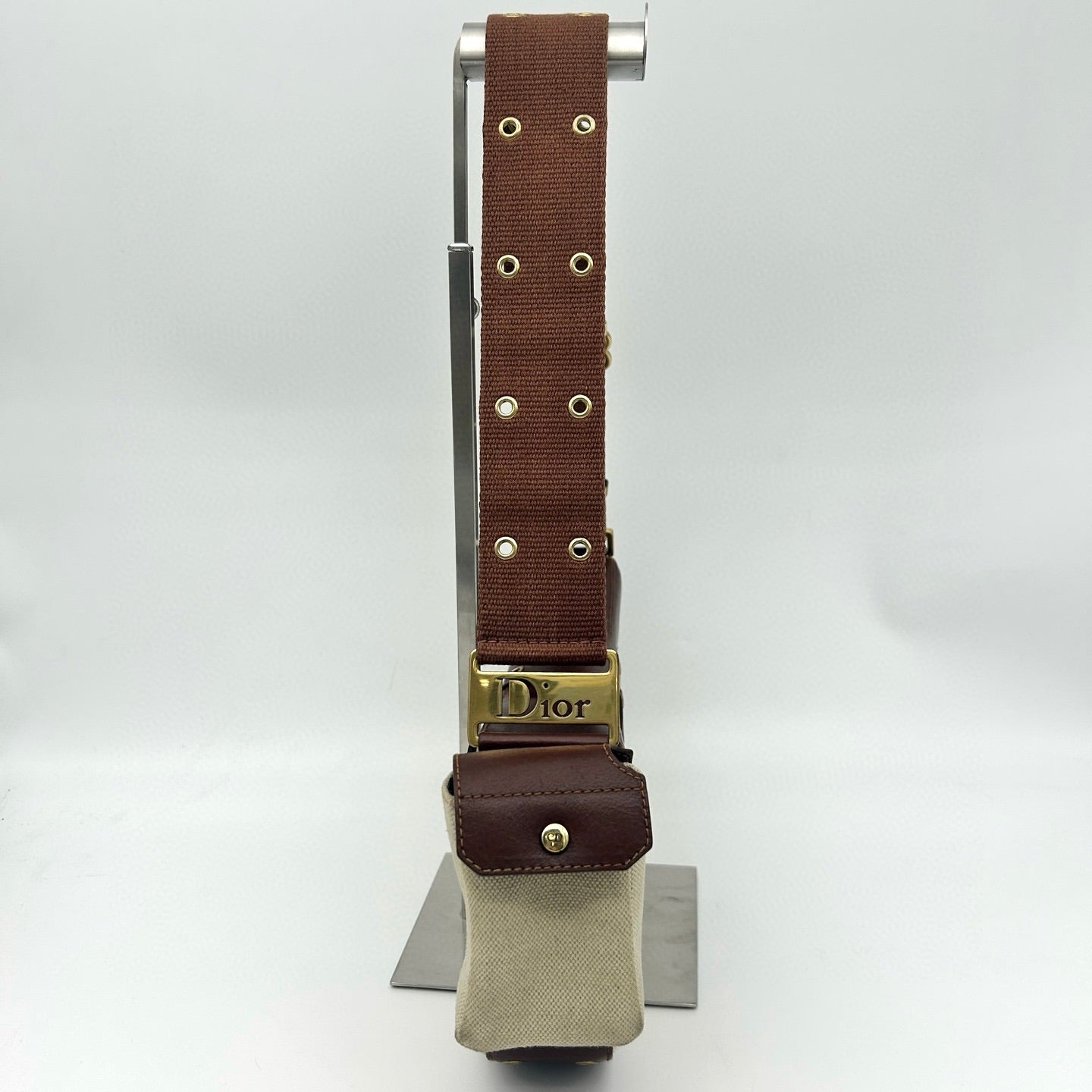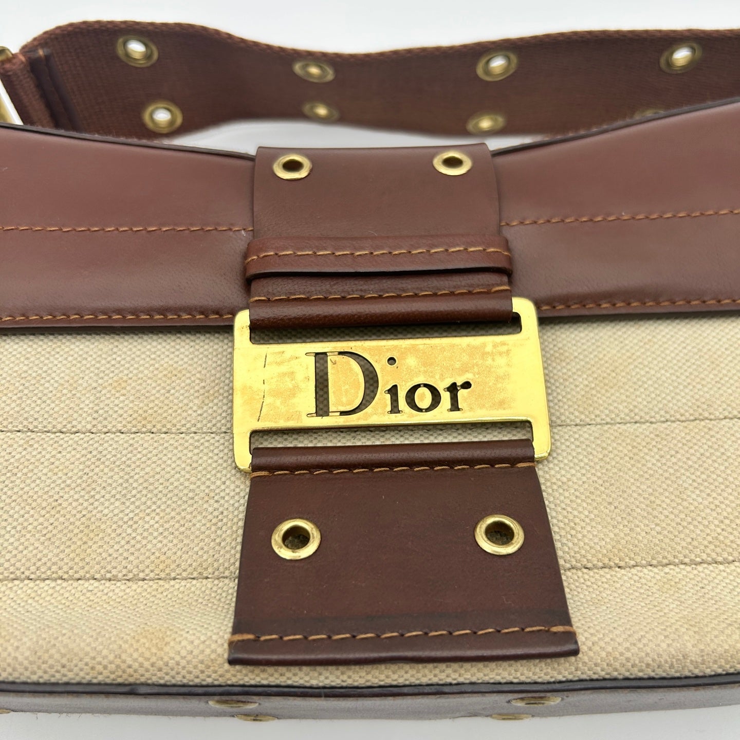 This Dior shoulder bag features a distinctive punk-inspired motorcycle design, crafted from a combination of brown and beige canvas with leather trim. The two-tone color scheme and mixed materials create a bold, utilitarian aesthetic while maintaining Dior’s refined craftsmanship.