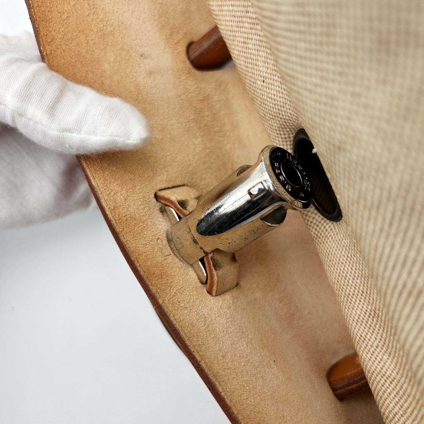 This Hermès Herbag PM features a refined beige canvas body paired with leather trim, showcasing the brand’s understated elegance and craftsmanship. The structured silhouette echoes the classic Kelly-inspired design, while offering a lighter and more versatile construction.