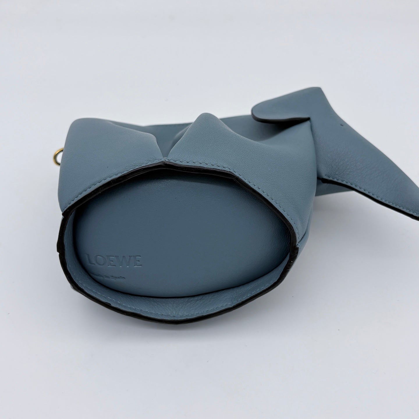 This Loewe Elephant Mini Bag is crafted from soft grained calfskin leather in a refined dusty blue tone, featuring the brand’s iconic elephant silhouette design. The sculptural form reflects Loewe’s signature playful creativity combined with exceptional leather craftsmanship.