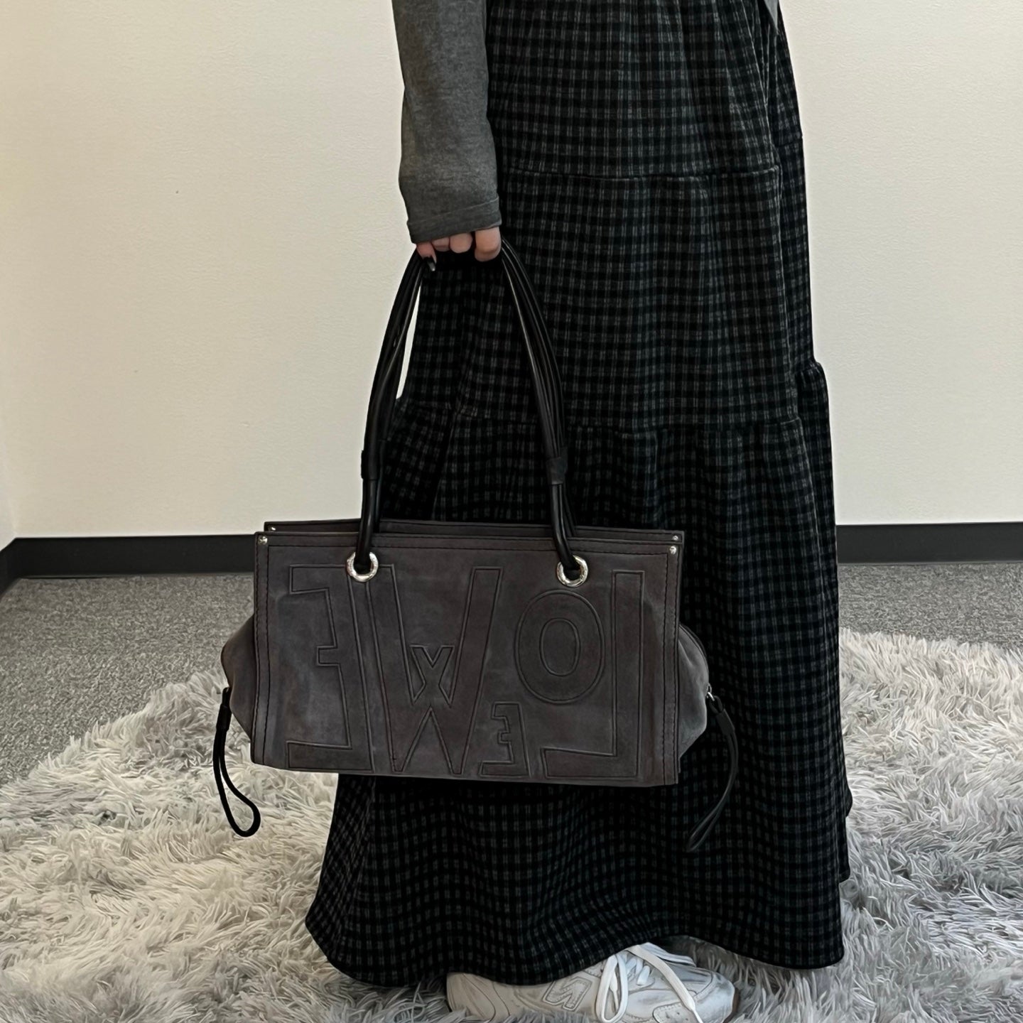 The generous capacity and long shoulder strap provide excellent practicality while maintaining LOEWE’s signature understated luxury.